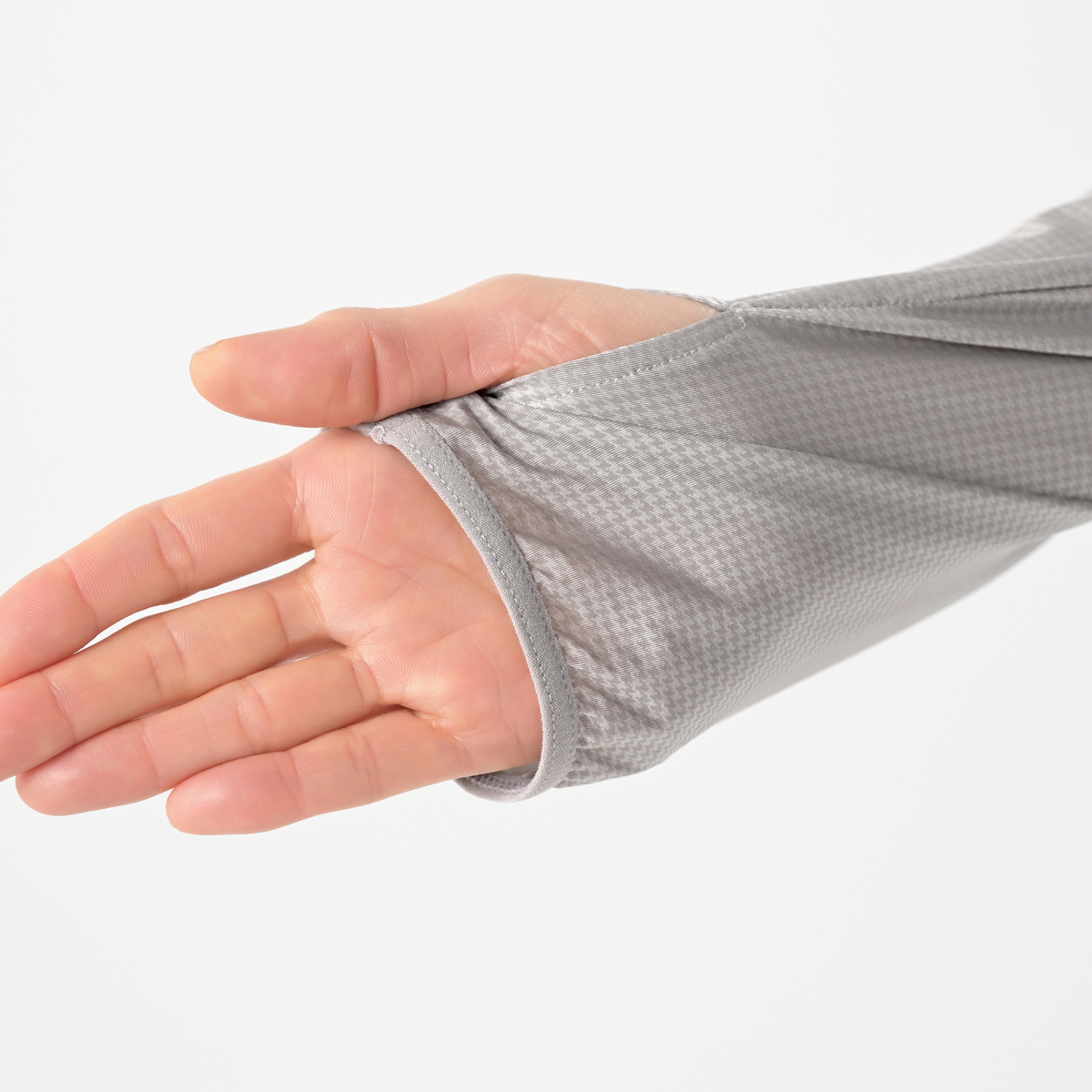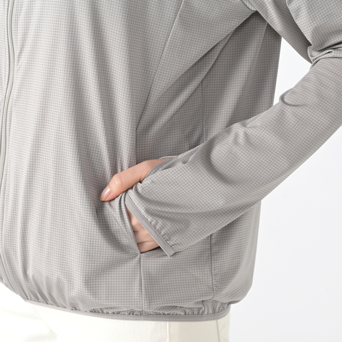 糸に練り込まずに生地に千鳥格子柄のプリントをしたことで、生地そのままの部分とプリント部分があるので、生地の柔らかさや伸び感はそのままに遠赤外線の輻射もプリント部分から行われます