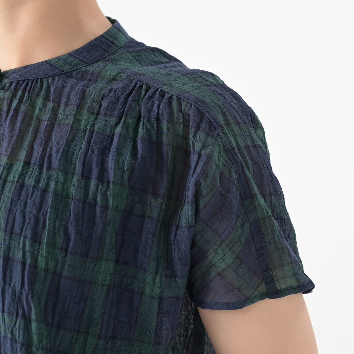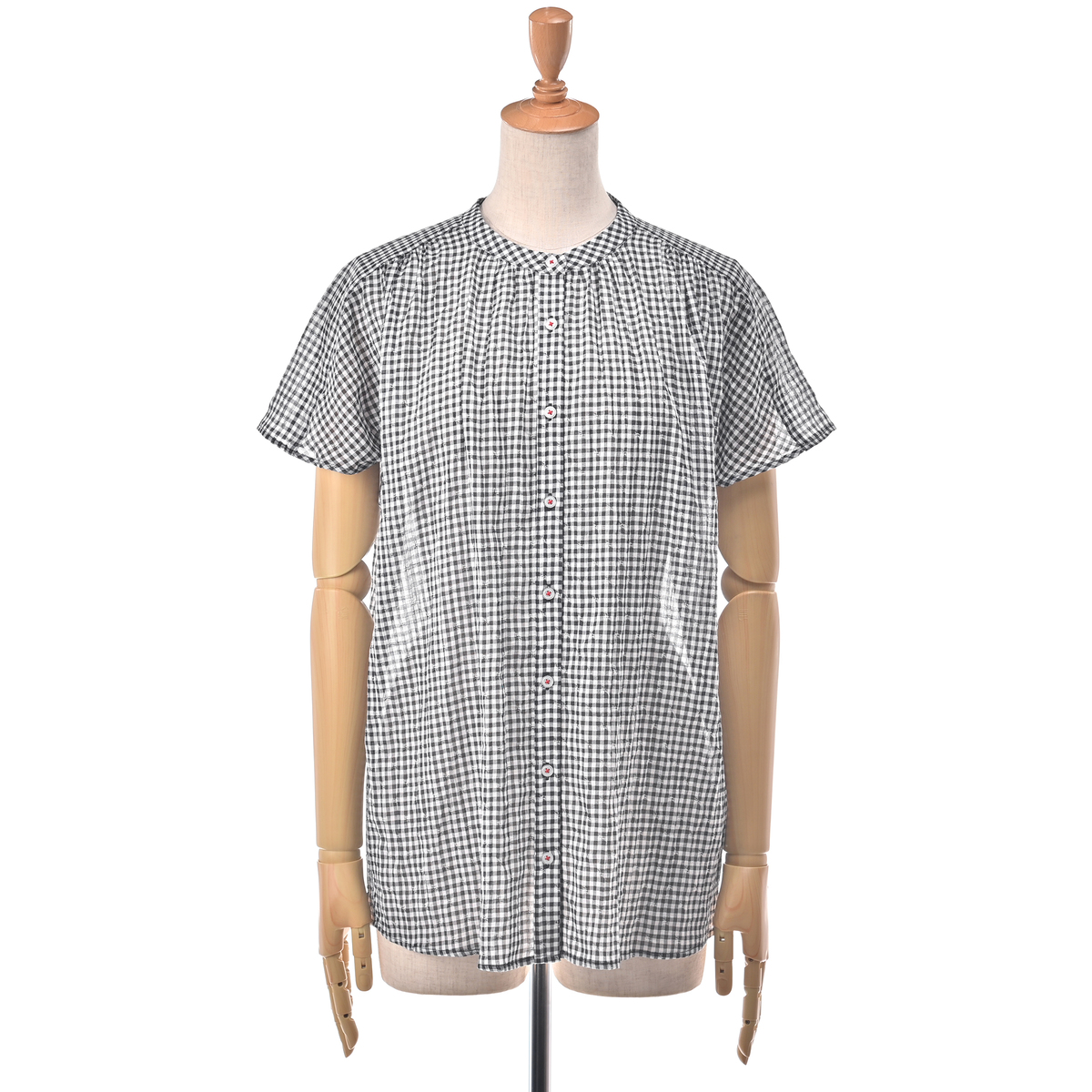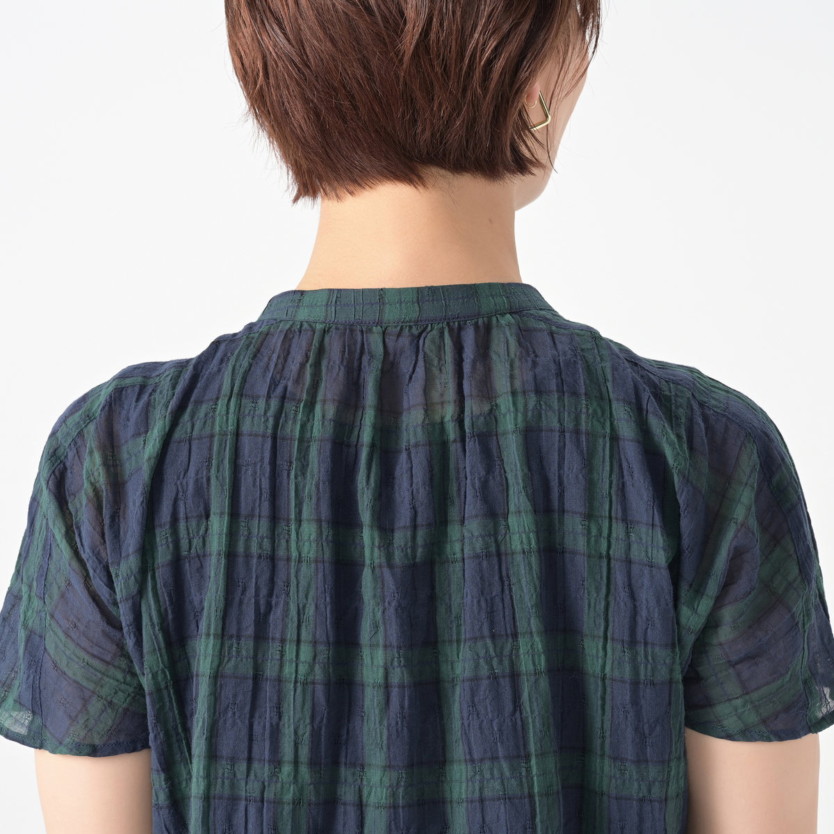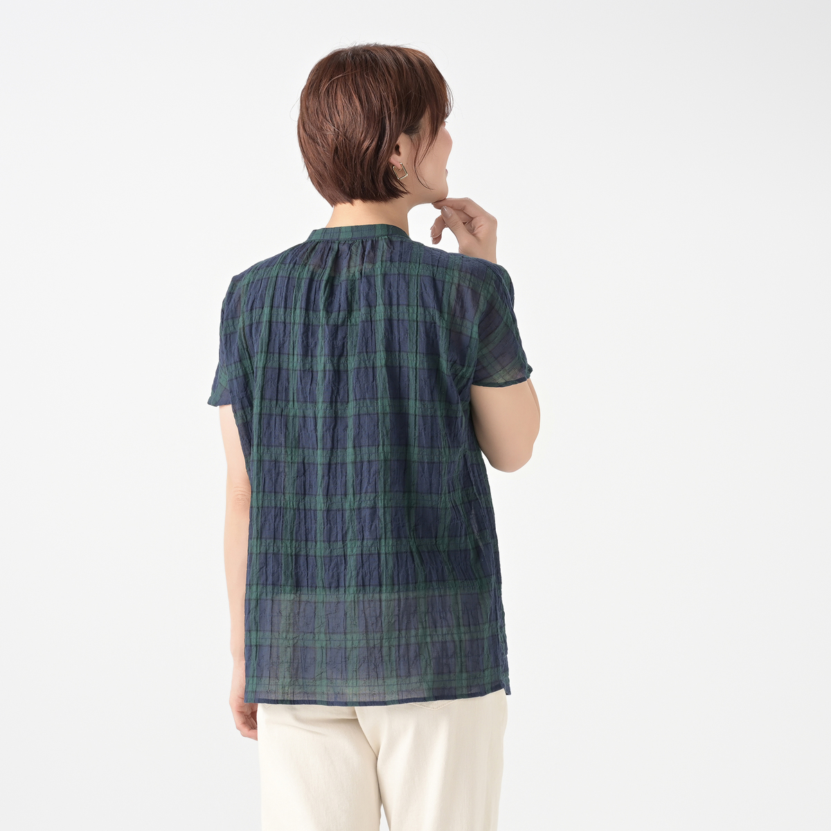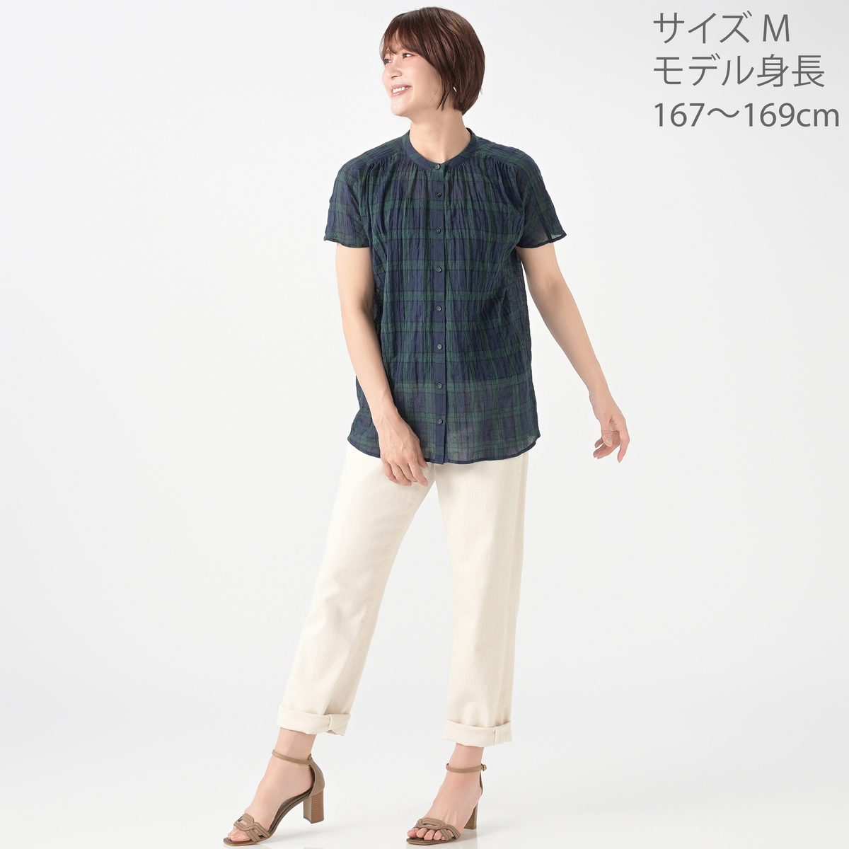 首周りにギャザーを入れた着心地良いデザイン。前開きボタン仕様で、ボタンを開けて羽織としても着られますし。ゆったりめのサイズ感で涼しくご着用いただけます