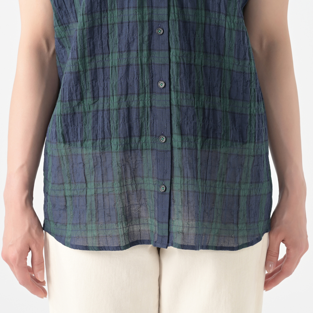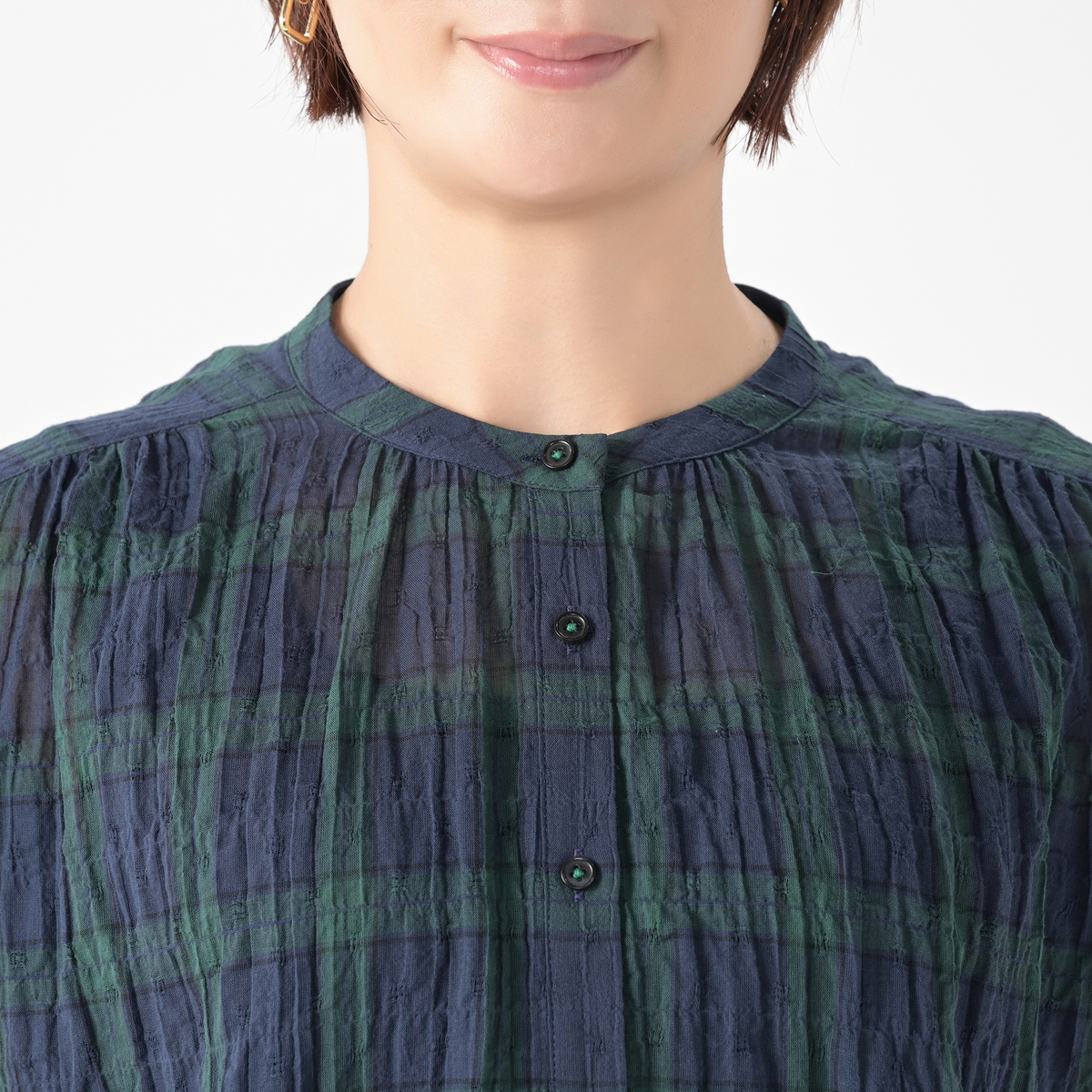 ワッシャードビー素材のチュニック。ぽこぽこシャーリング生地が特徴の素材で、表情があり、さらっと涼しく夏にぴったり。ご家庭でお洗濯(ネット使用)ができ、シワが気になりにくい綿混素材です
