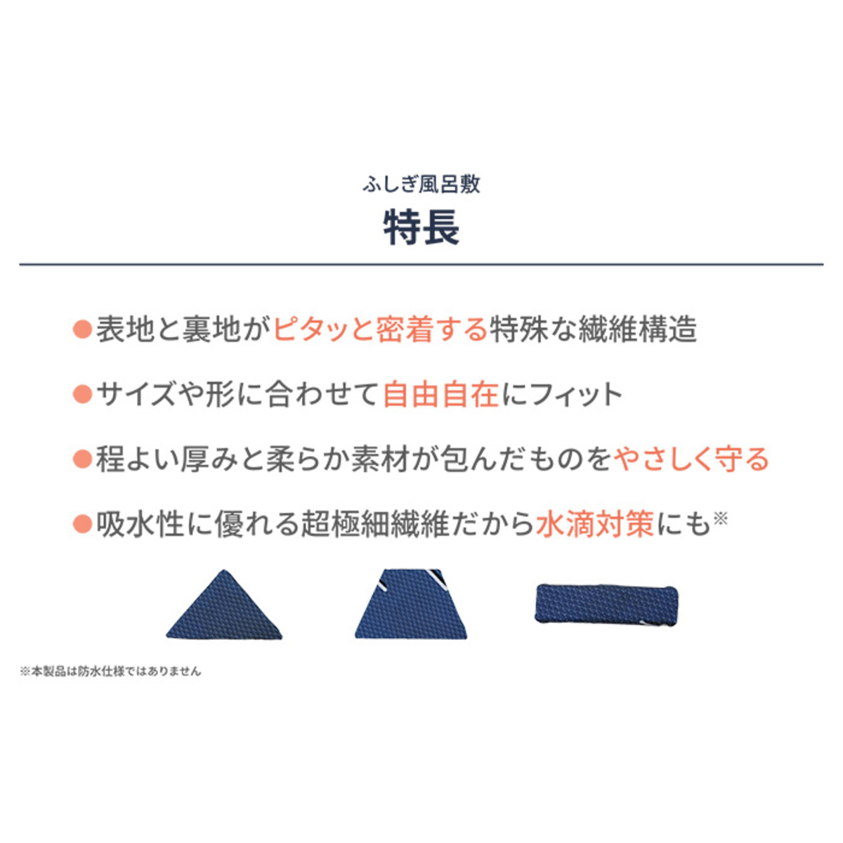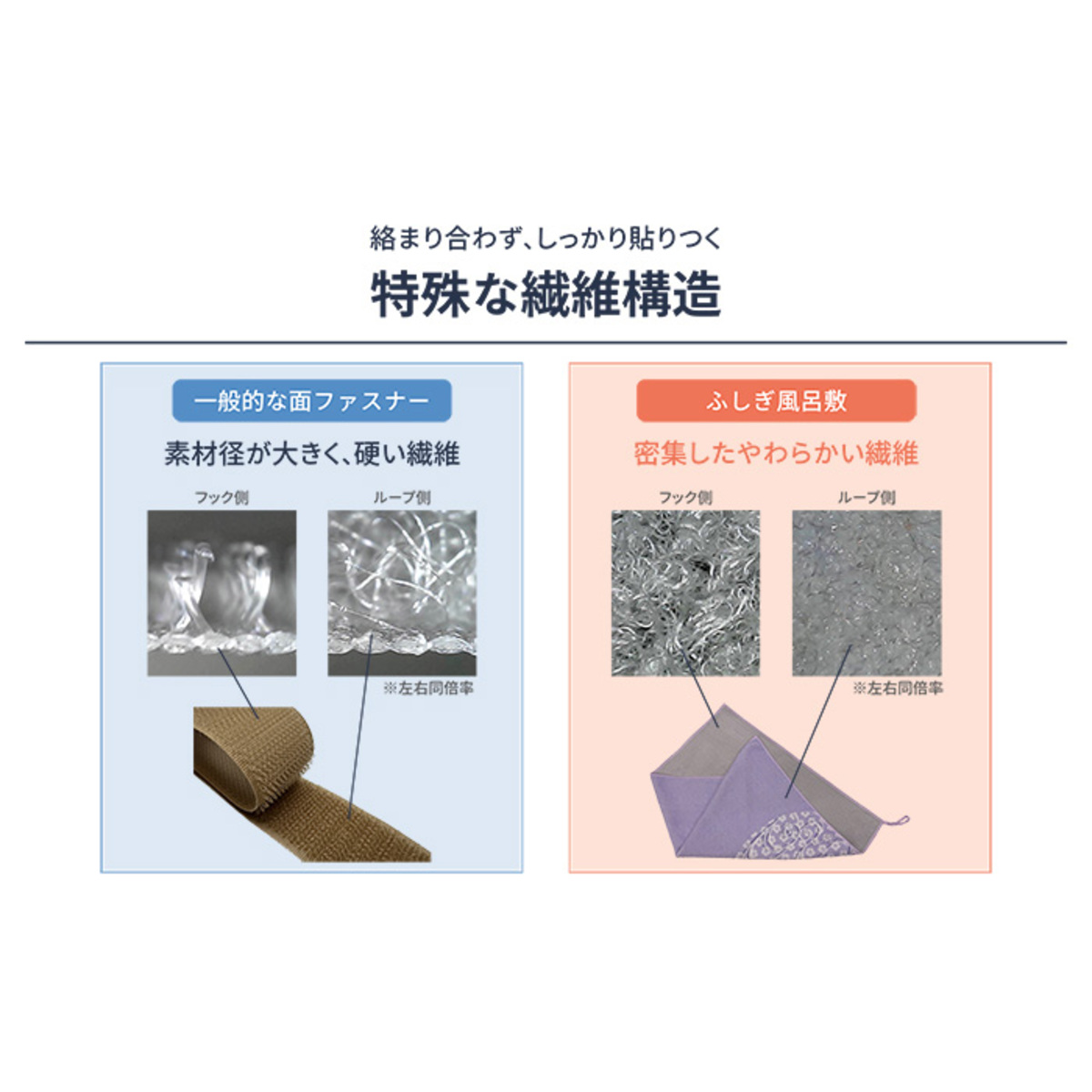 特殊な繊維構造で、表地と裏地を重ねるとピタっと貼りつくふしぎな風呂敷。密集した極細繊維のパイルのフック地がループ地をキャッチして留め、互いに絡まり合わずしっかりくっつく構造です。結ばずに使えるので、形に合わせて自由に包むことができます