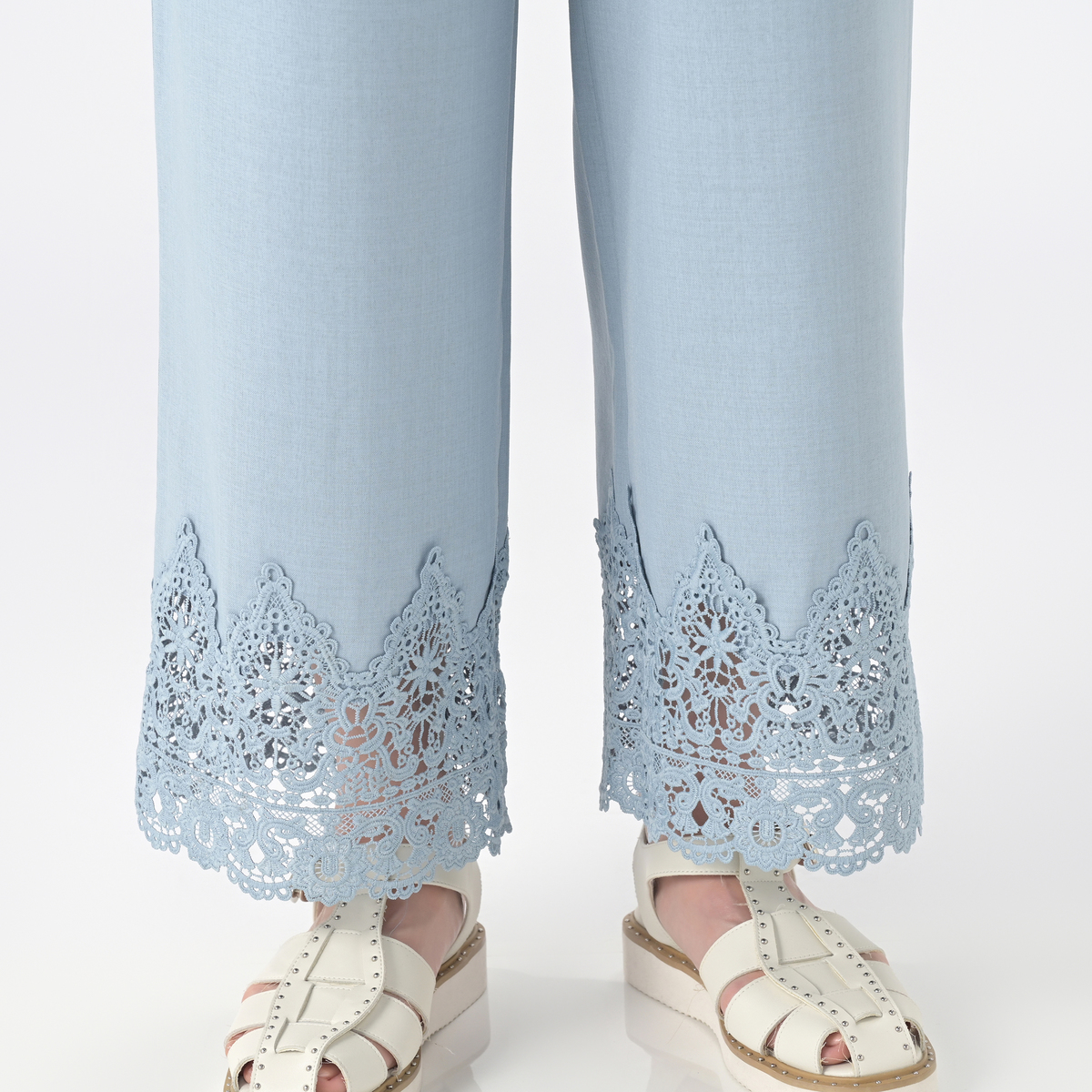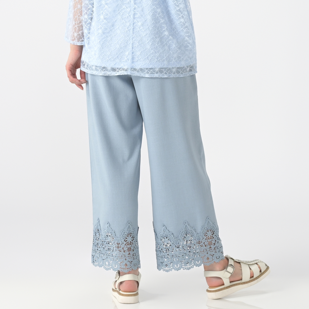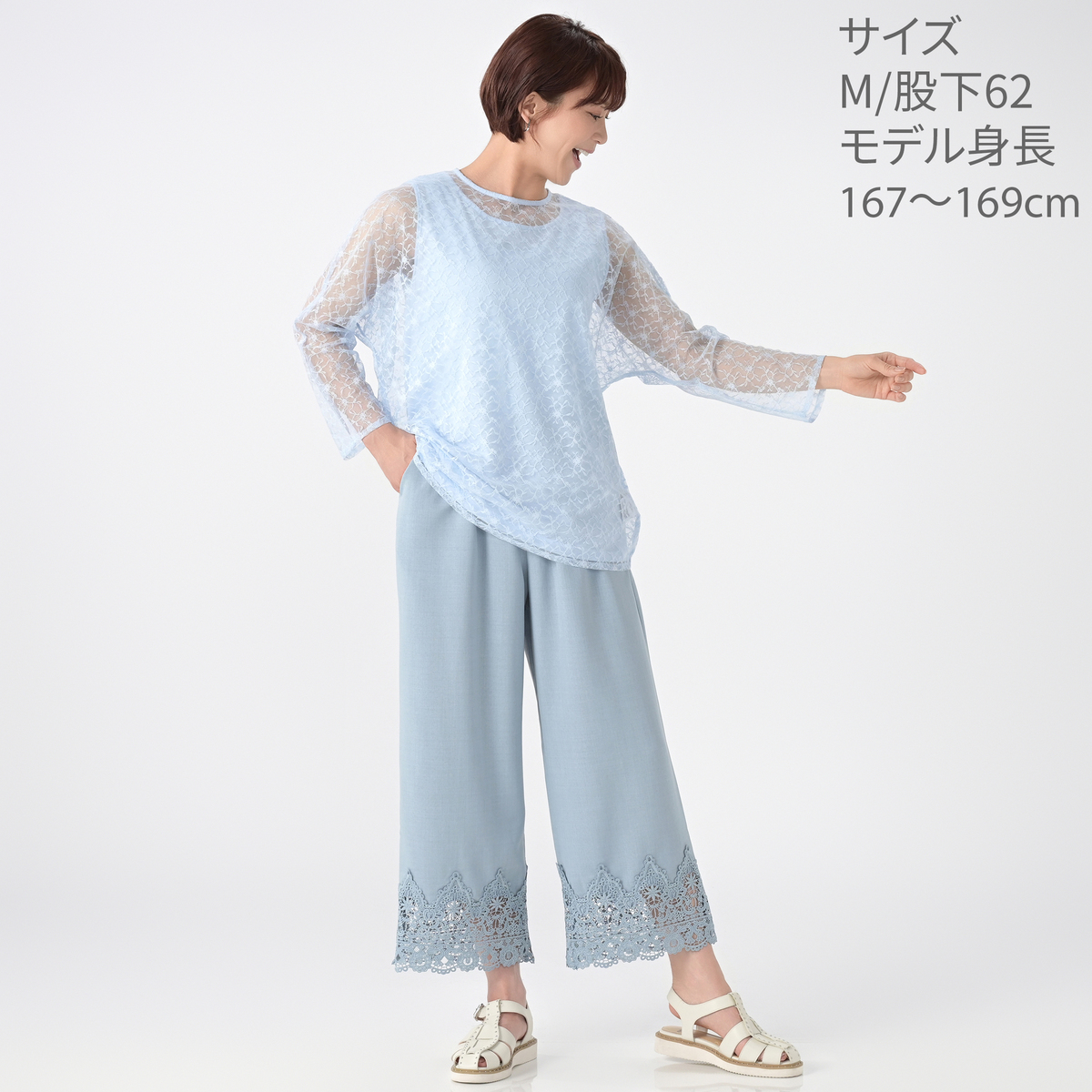 華やかな刺繍レースがポイントのワイドパンツ。足元を軽やかに見せてくれる少し短めのレングスで、レースが透ける様に仕立てています。ウエストは細幅の総ゴム仕立て。各サイズ、股下寸法は2丈から身長160cm未満の方は股下62cm、身長160cm以上の方は股下66cmを目安にお選び下さい