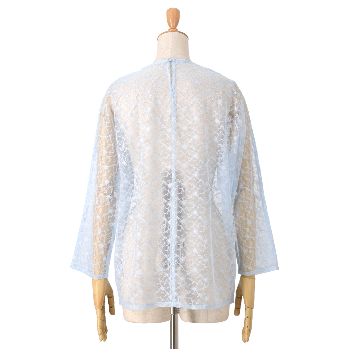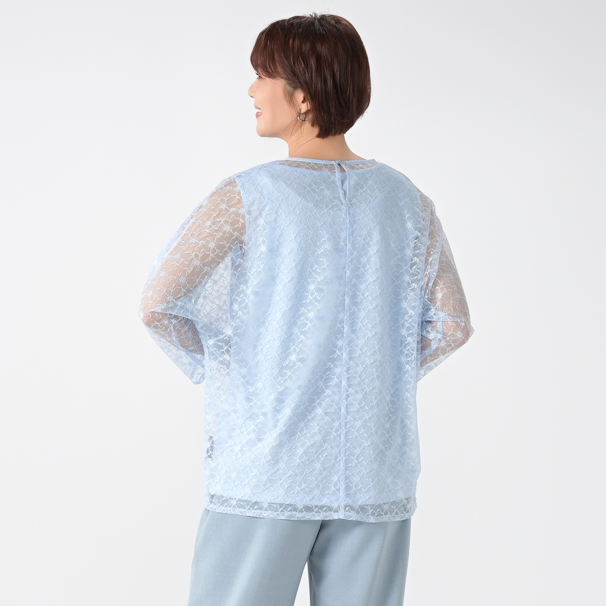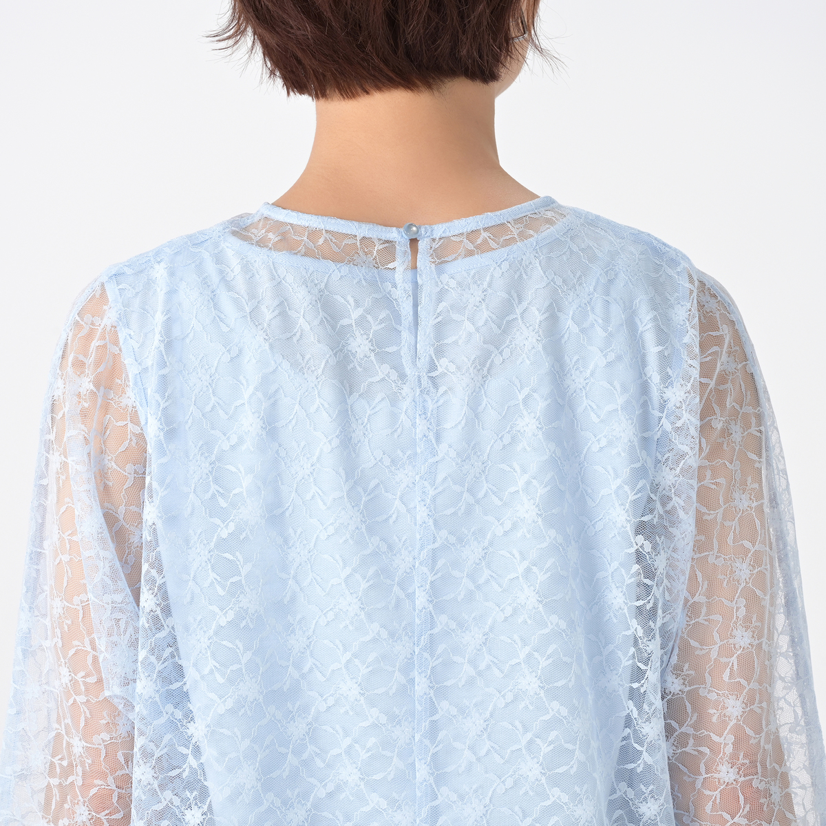 シアーなチュールレースを使い、ゆるっと着用できる長袖のドルマンシルエットに仕上げました。後ろはボタン開きの仕様になっています