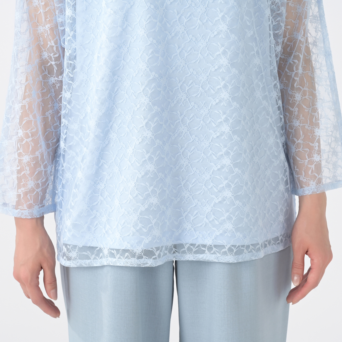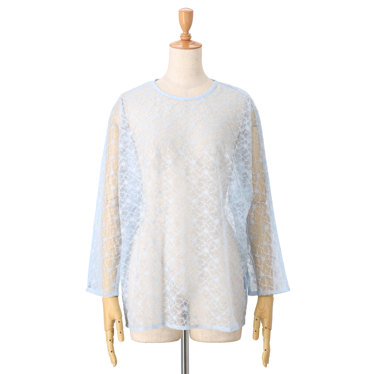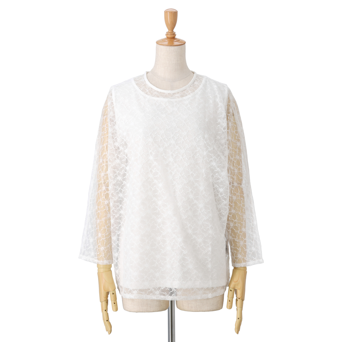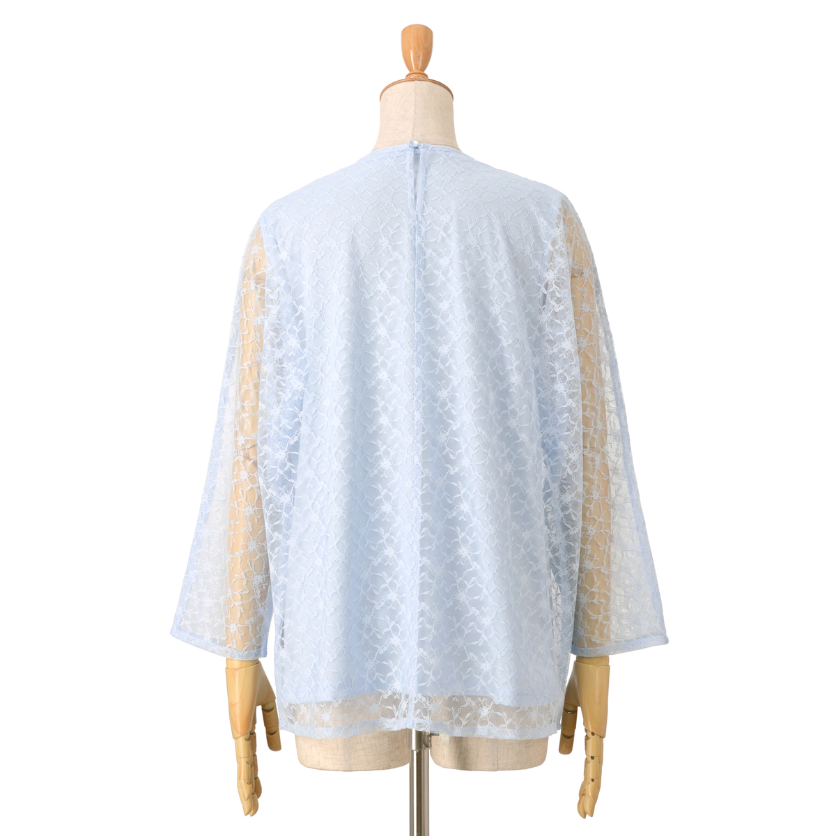 シアーなチュールレースを使い、ゆるっと着用できる長袖のドルマンシルエットに仕上げました。後ろはボタン開きの仕様になっています