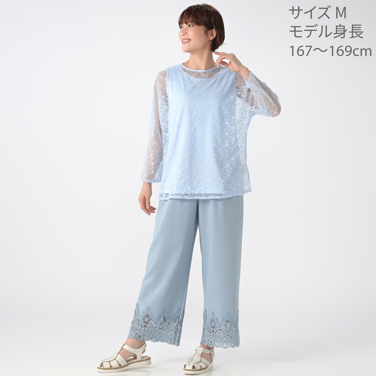 <総レーストップス> [商品寸法(ヌード)cm] サイズ バスト 着丈 裄丈 S : 110(72〜80) 65 70 M : 115(79〜87) 65 71 L : 120(86〜94) 65 72 LL : 125(93〜101) 67 73 3L : 130(100〜108)67 74 [素材]ポリエステル 100% [お手入れ]手洗い可 <タンクトップ> [商品寸法(ヌード)cm] サイズ バスト 着丈 肩幅 S : 88(72〜80) 61 37 M : 94(79〜87) 61 38 L : 100(86〜94) 61 39 LL : 106(93〜101) 63 40.5 3L : 112(100〜108) 63 42 [素材] ホワイト、サックス:ポリエステル 75% 綿 25% ブラック:ポリエステル 65% 綿 35% [お手入れ]洗濯機洗い可 [注意事項] ※商品寸法の誤差は多少発生します。ご了承下さい ※無蛍光洗剤使用 ※洗濯ネット使用 ※あて布使用 ※着用時の摩擦(特に雨や汗により湿った状態での摩擦)で他の衣料やバッグ、椅子やソファー、車のシート等に色が移る場合がありますのでご注意下さい。万が一移染した場合は、移染した衣類等の早めのお手入れをお願いします。また、濃色は水洗いで色落ちや色移りの恐れがありますので淡色との洗濯は避け、洗濯後は速やかに干して下さい。長時間のつけ置き洗いや濡れたままの重ね置きはお避け下さい ※この商品は長時間日光に当たり続けると色あせの恐れがあります。ご注意下さい。洗濯後は必ず陰干しして下さい ※生地の特性上、過度の引っ張りを受けると縫い目が開いたり、破れたりすることがありますのでお取り扱いにはご注意下さい ※素材の特性上、突起物や表面の粗いものとの接触により、生地の糸が引きつれたり飛び出したりする恐れがありますのでご注意下さい。洗濯時には裏返してネットに入れて下さい ※お洗濯は、他のものとは避け、手洗いでやさしく押し洗いして下さい ※この製品は素材の特性上、肌の敏感な方は刺激を感じる場合があります。インナーを着用するなど、十分にご注意の上ご着用ください 【中国製】