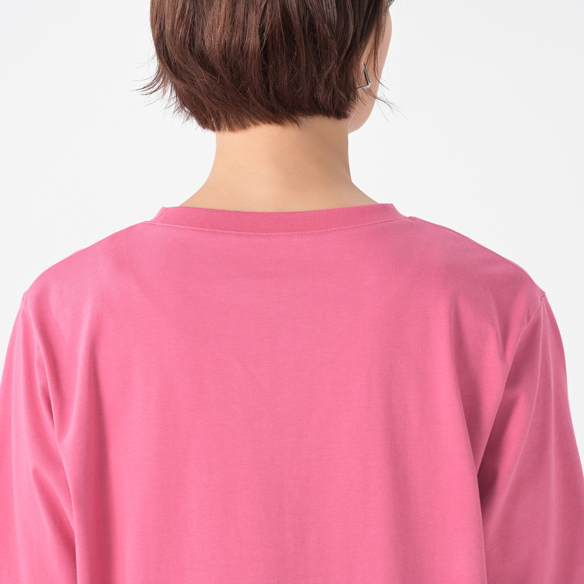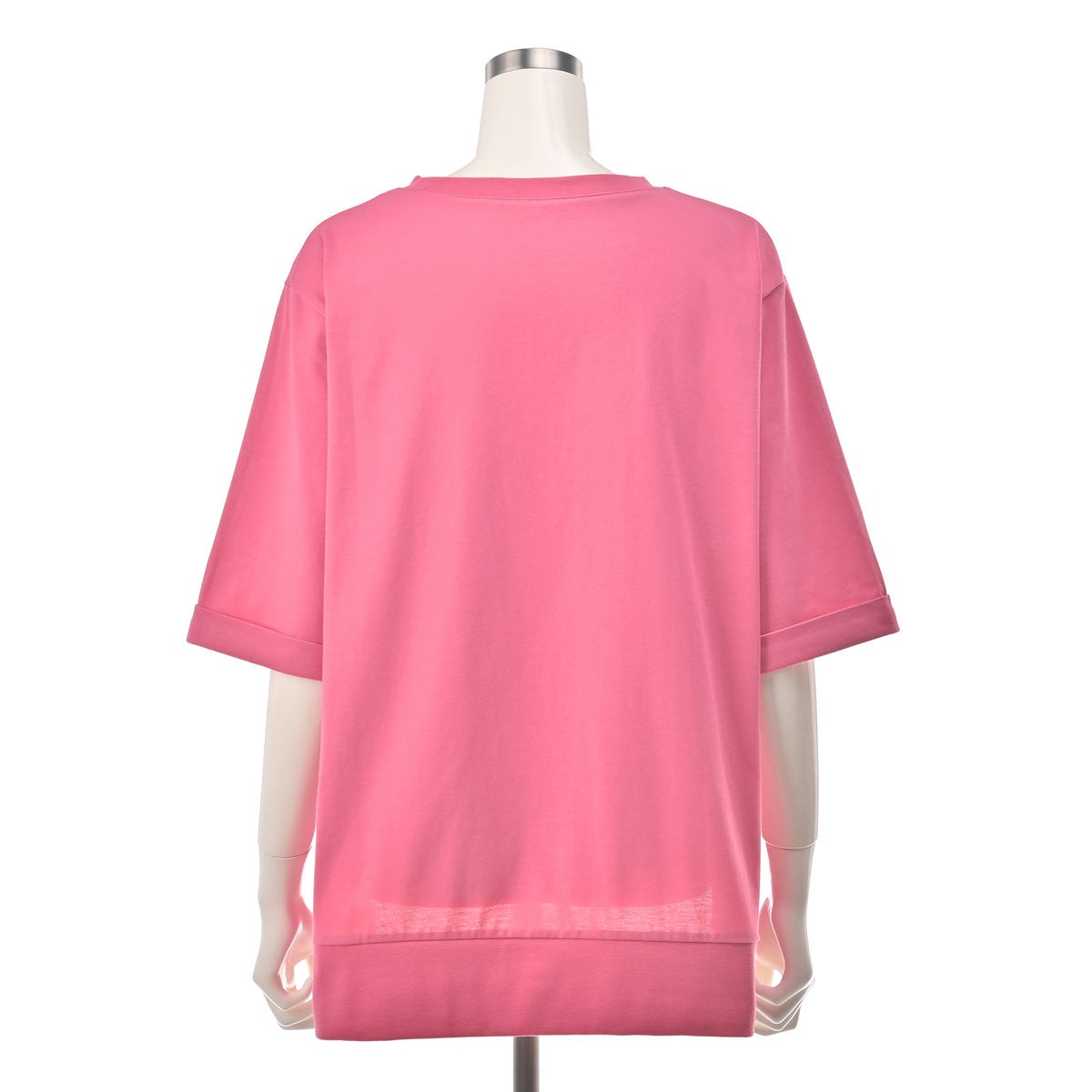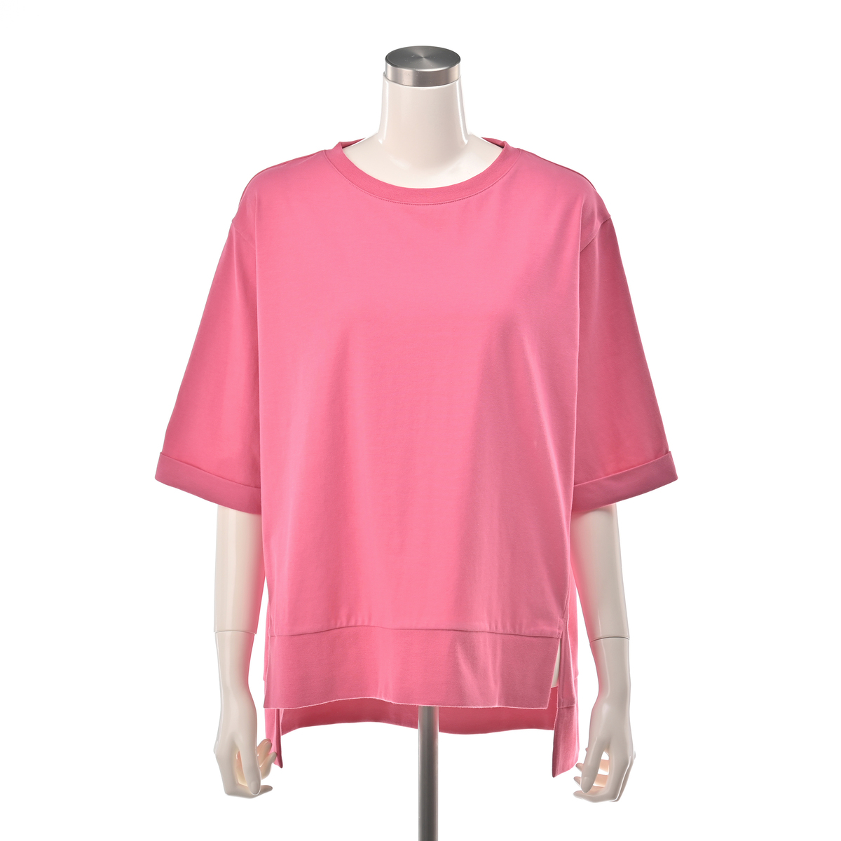 表面がコットン、裏面がポリエステルの糸で編んだプレーテイング天竺素材を使用したTシャツブラウス。コットン混のスパンフライスの衿ぐりと裾がアクセントとなり、上品な印象を与えます