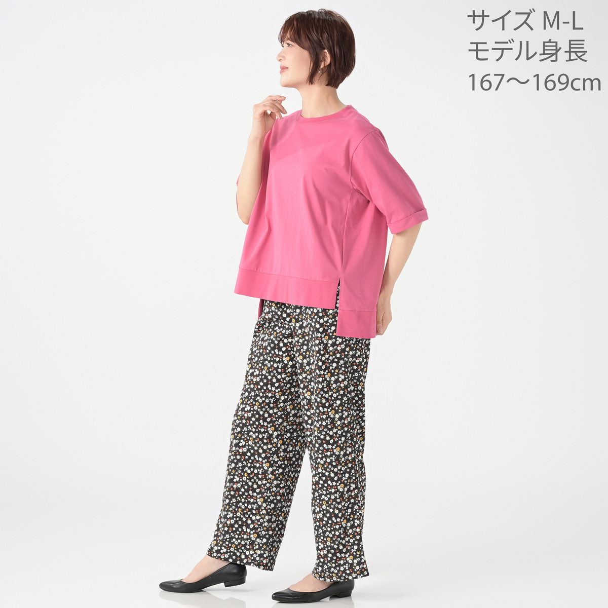 ドロップスリーブと折り返しの袖口が特徴のデザインで、二の腕をさりげなくカバーします。袖口は動きやすさを考慮した幅で、風通しも良く涼やか。前後差のある着丈はヒップを隠しつつ、前は少し短めで軽やかに着用していただけます