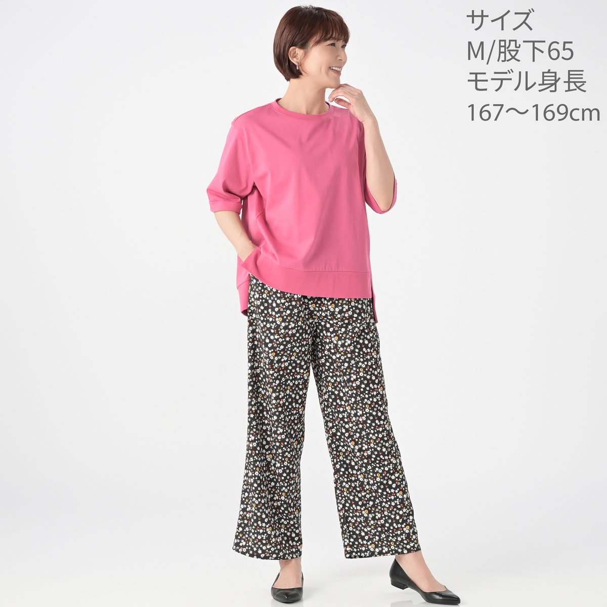 広がりすぎないストレートシルエットで、美脚効果も期待できるデザインです。ウエストゴムはひっくり返らないようステッチで固定した仕様。斜めポケット付きで、手が入れやすく便利です