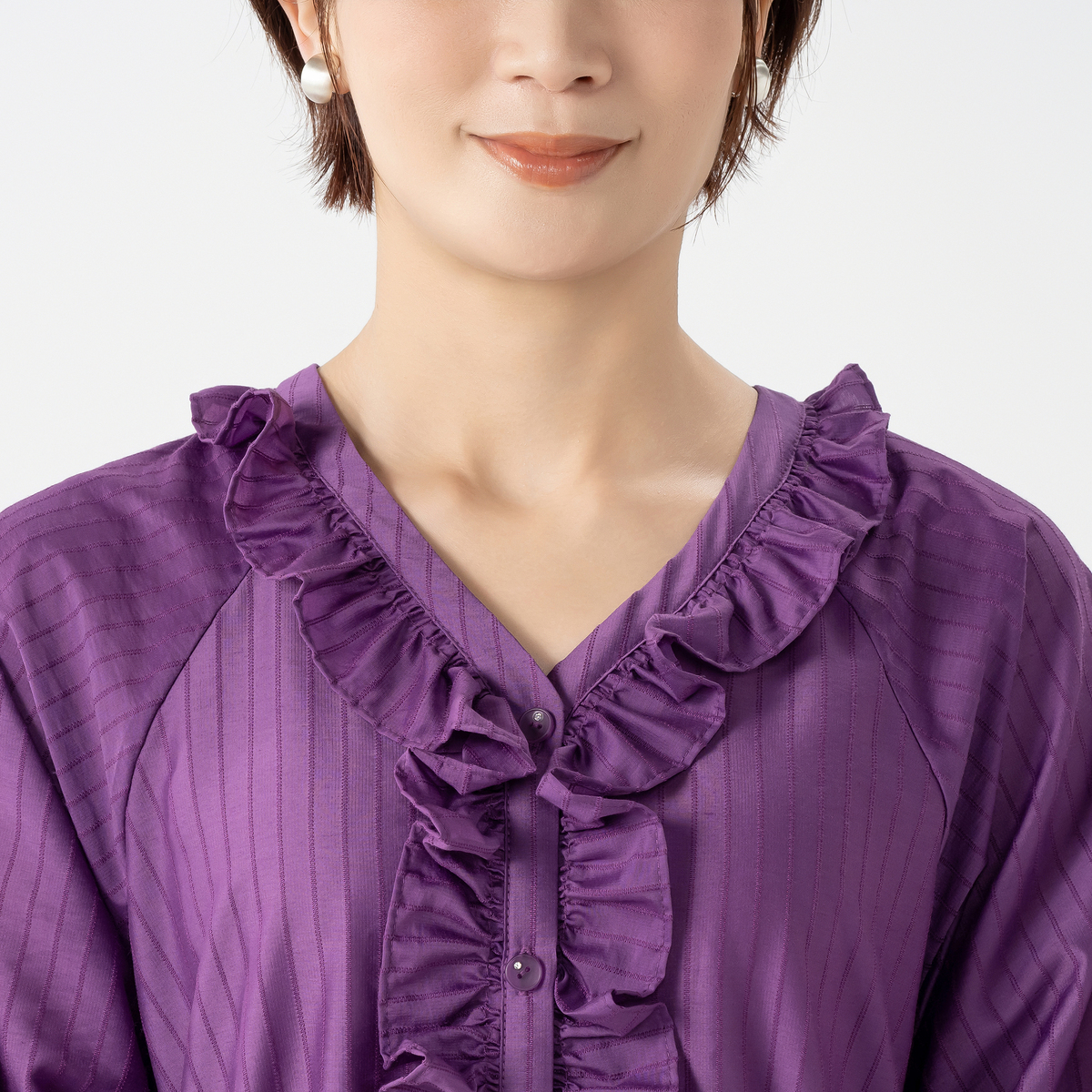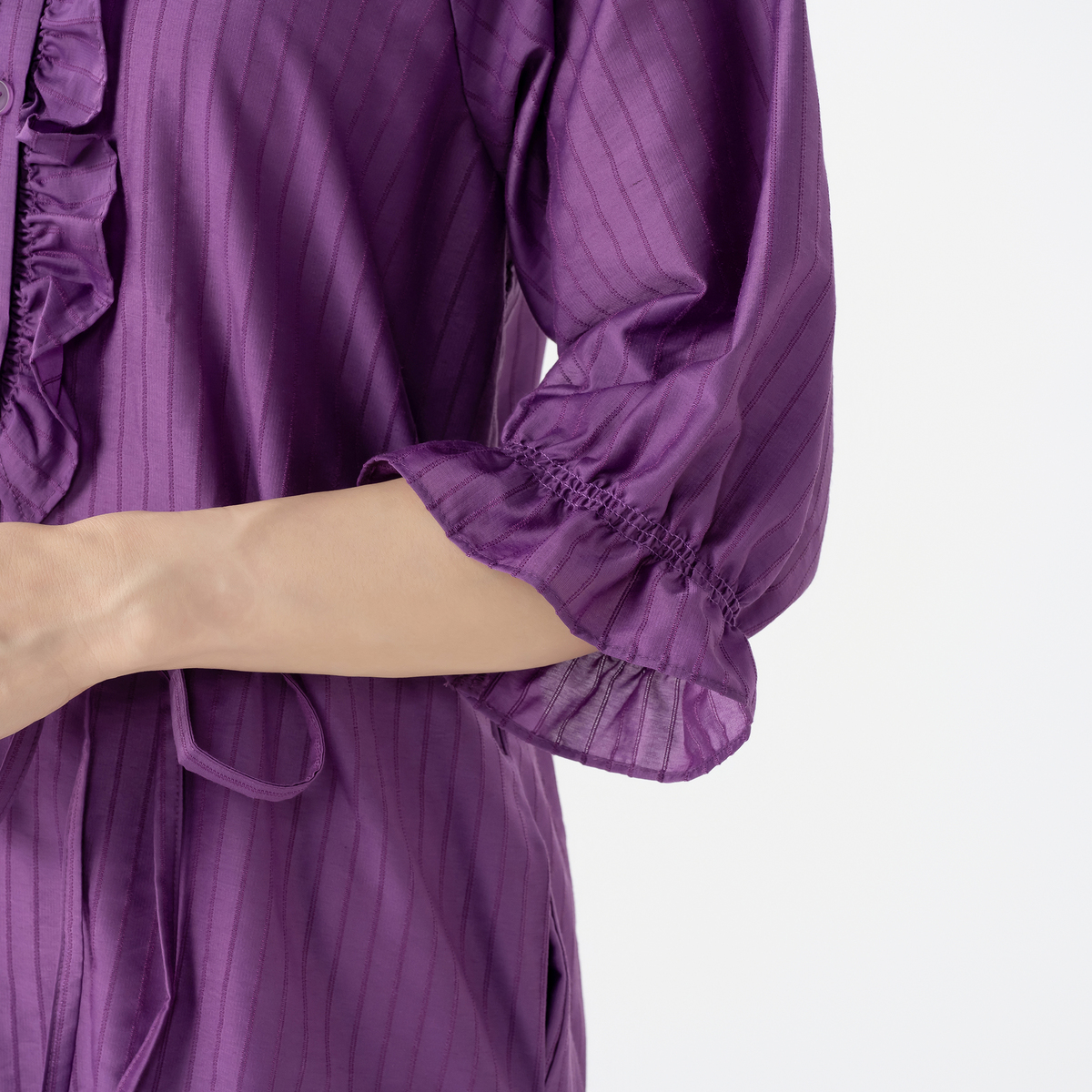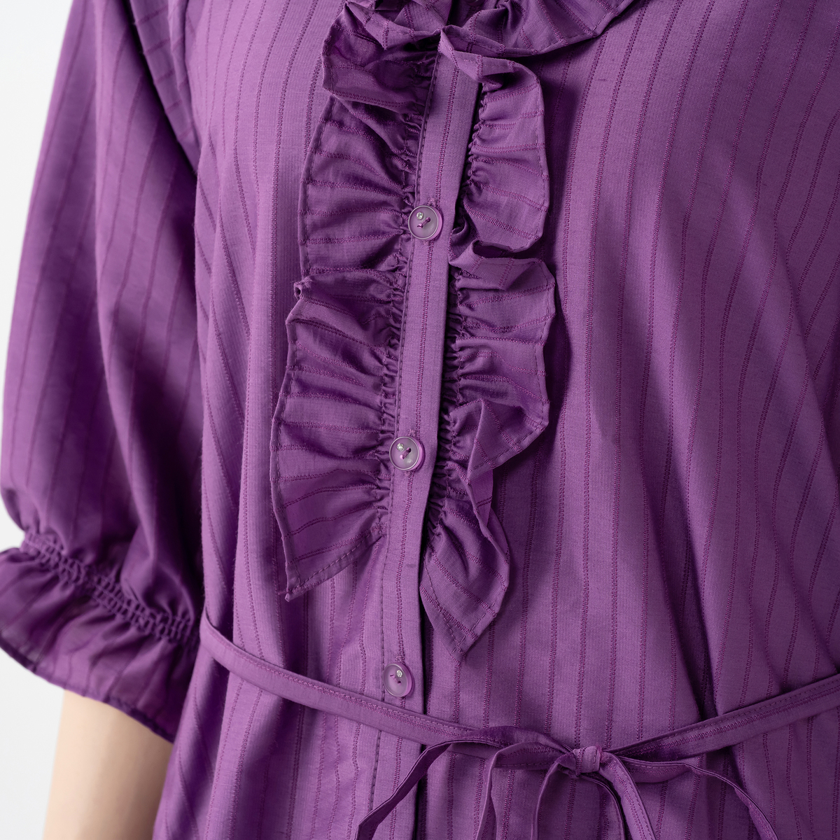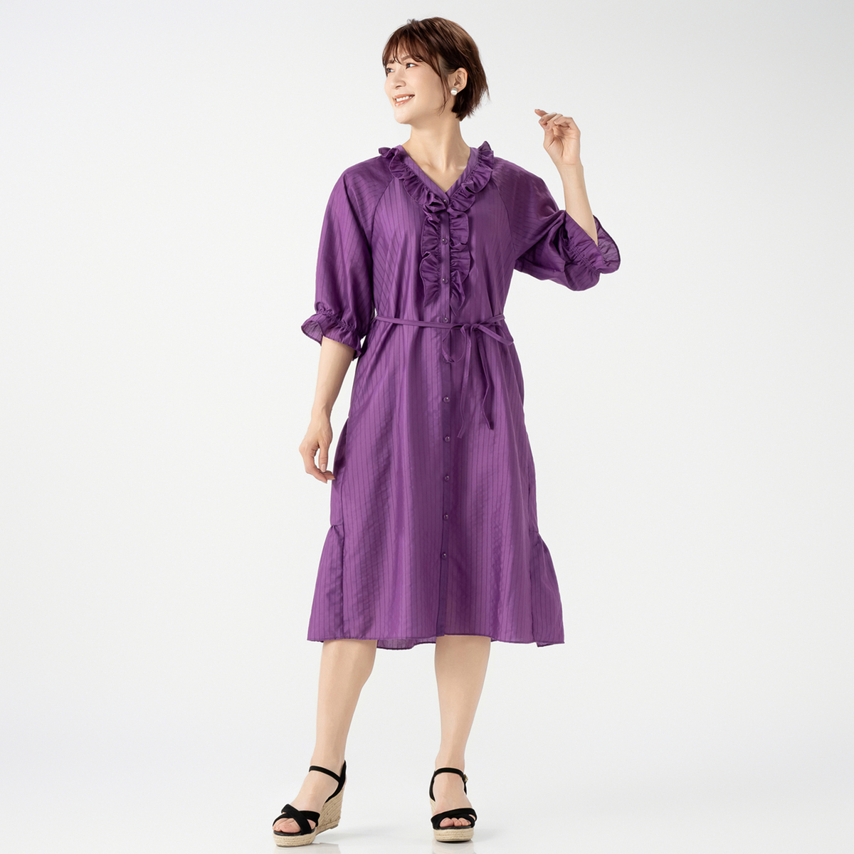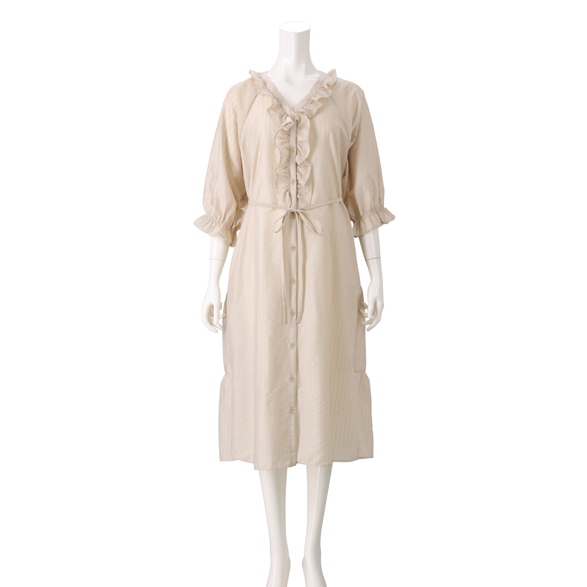 衿元と前立てにたっぷりとフリルを施したガウンワンピース。&LOVEオリジナルのストライプジャカード生地で、上品な表情がありながら適度なハリ感もあり、シルエットをきれいに保つ、繊細で軽やかな素材です