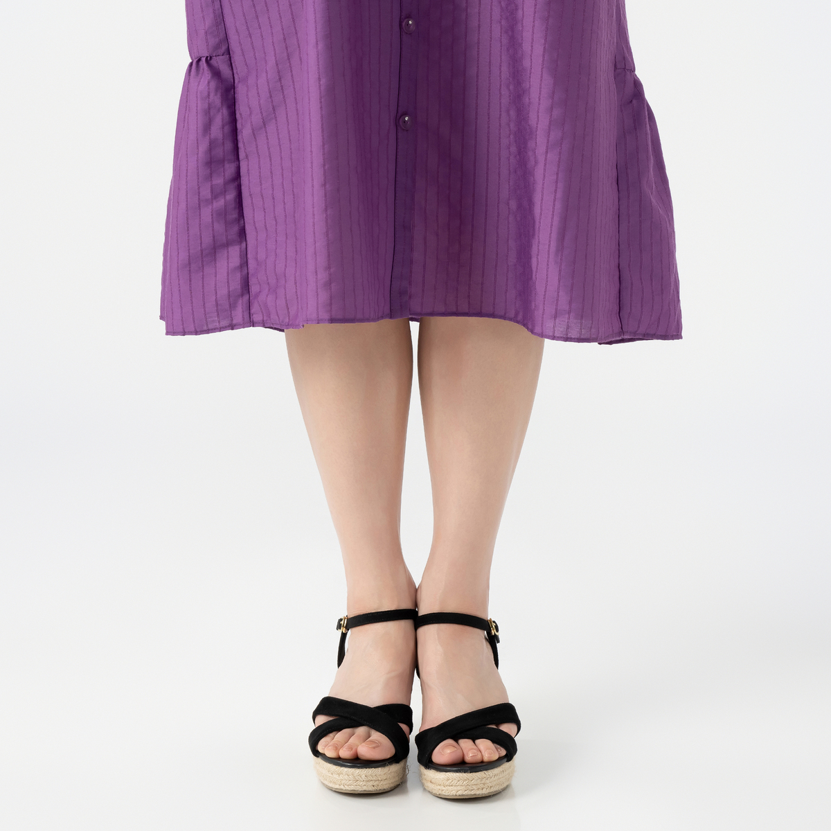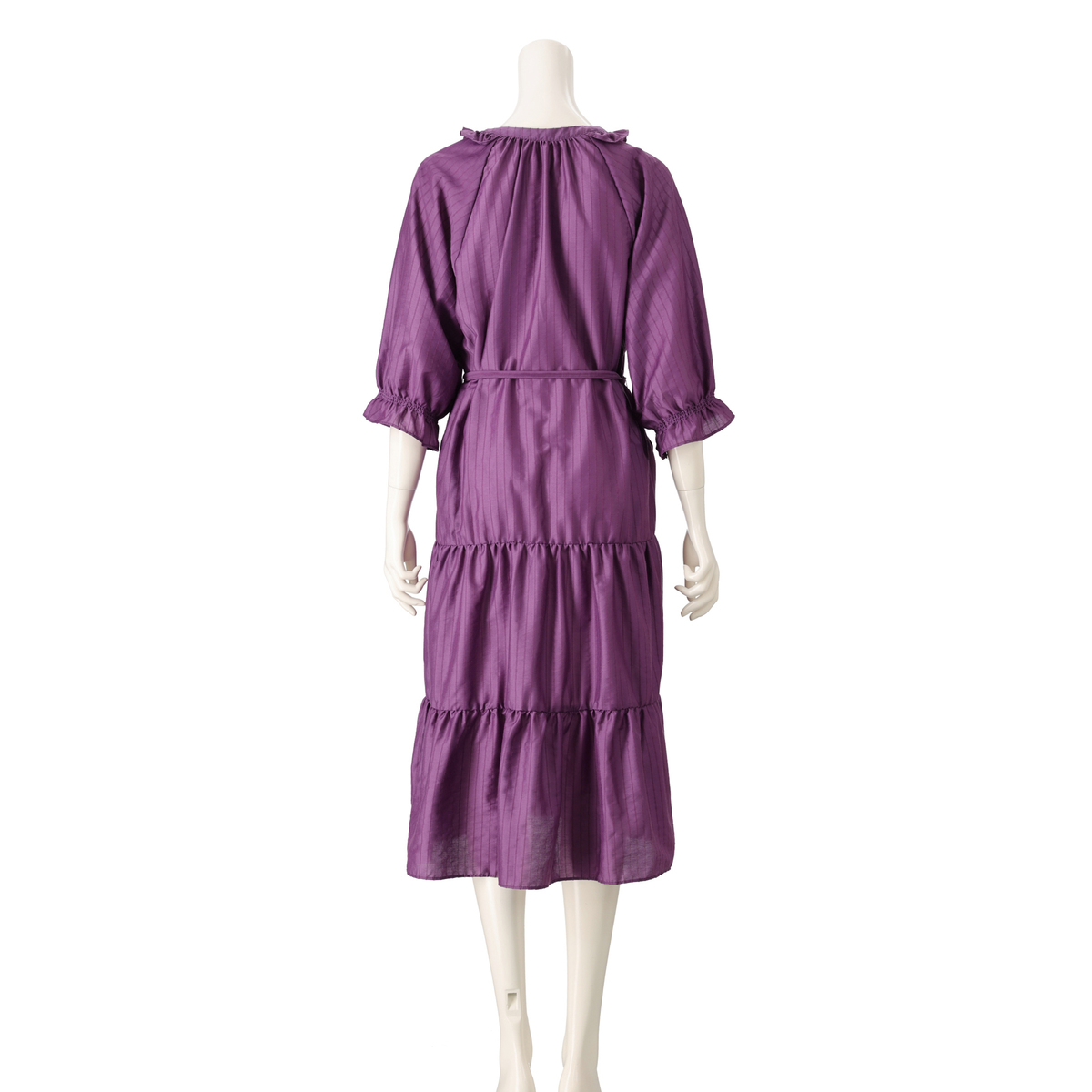 優雅に揺れるロング丈で、後ろ身頃のティアードデザインは前からも少し見えるように切り替えを前振りに。正面から見ても自然な立体感が生まれ、シンプルながらも奥行きのあるシルエットになっています。ウエスト部分には糸ループ付きで、共布ベルトでシルエットの調整も可能です