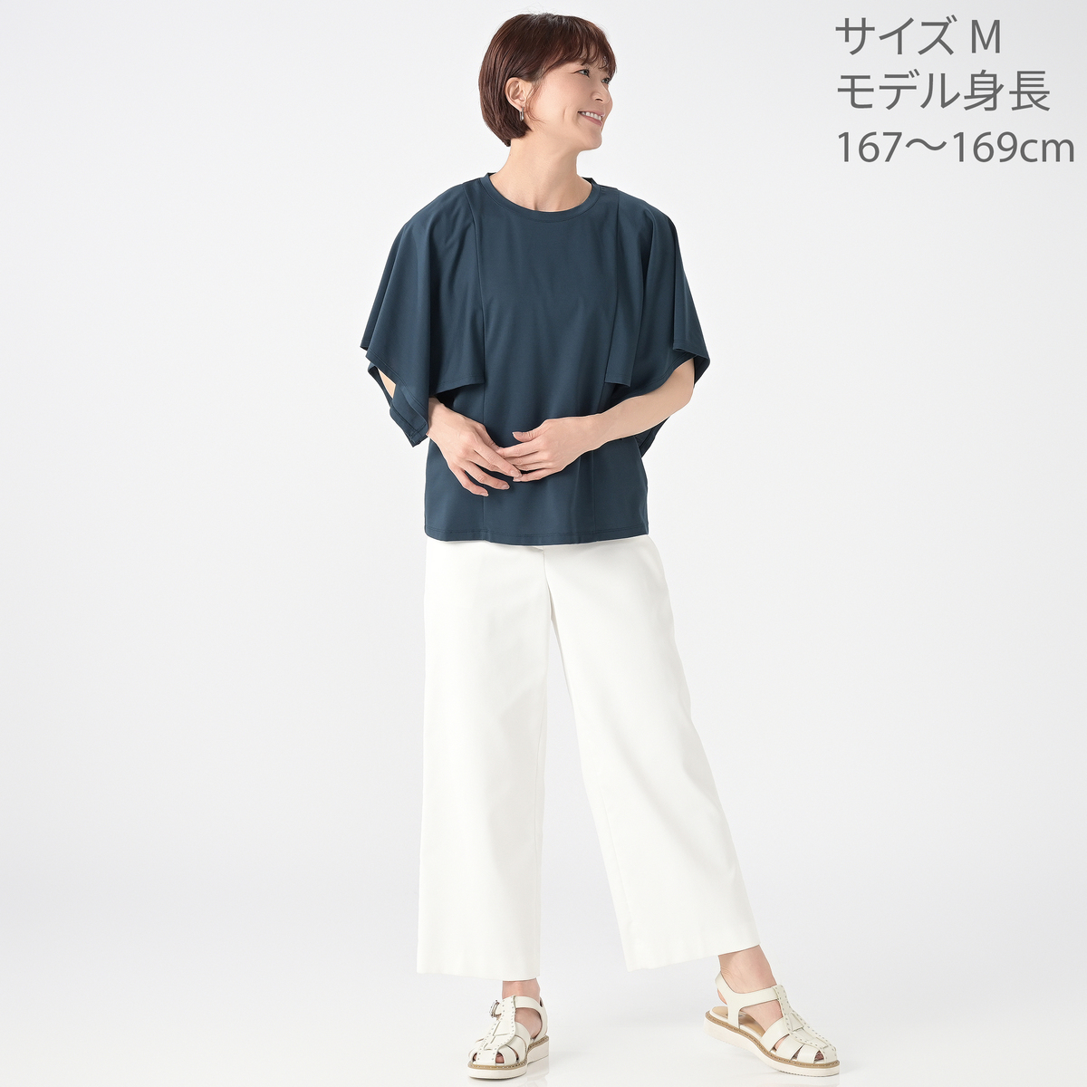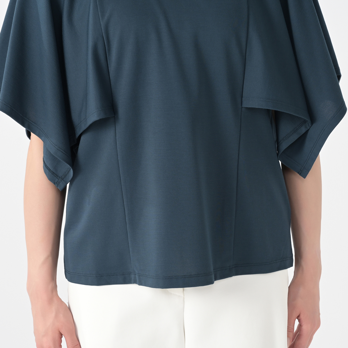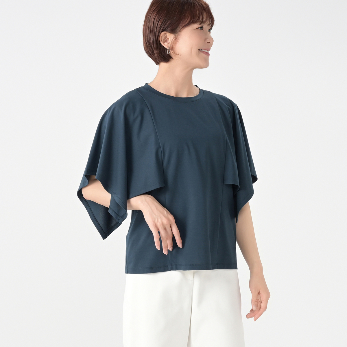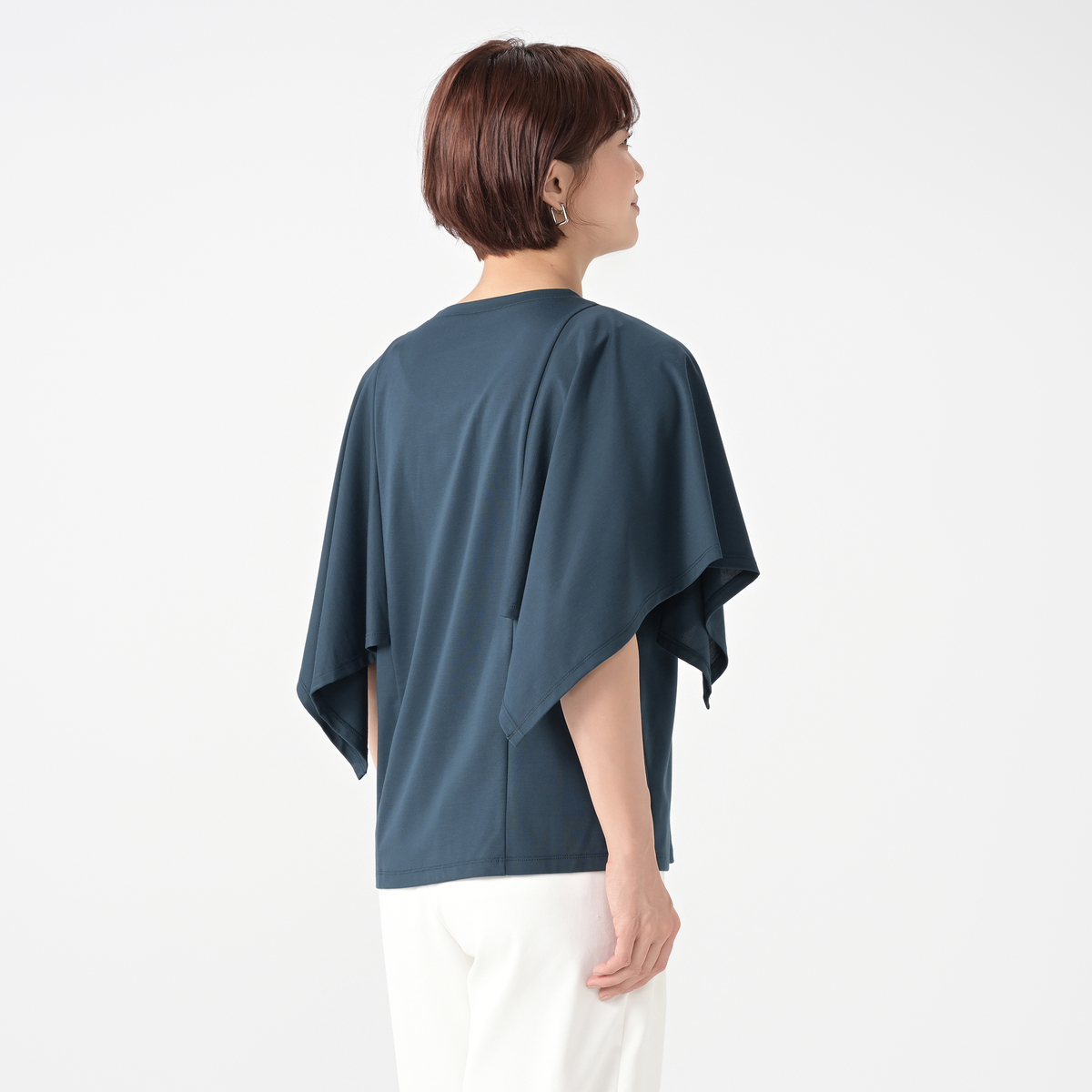 ケープショルダーが印象的なプルオーバー。シンプルながらも表情豊かで動きのあるデザインです。袖口が広めで袖下が縫われていないため、抜け感があり、爽やかな着心地をお楽しみいただけます