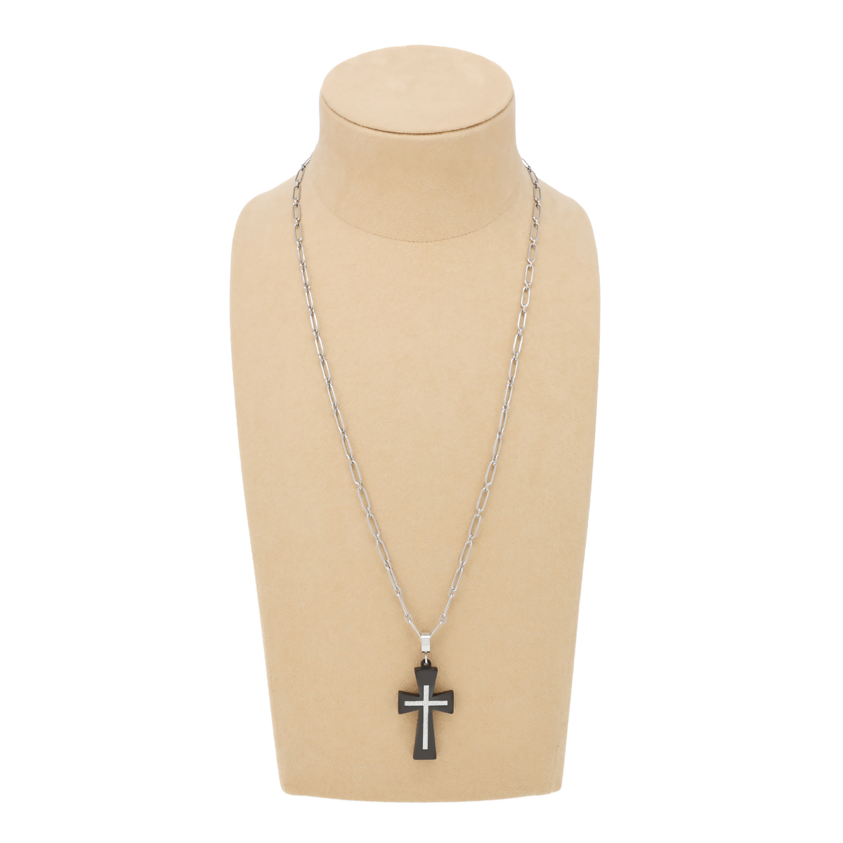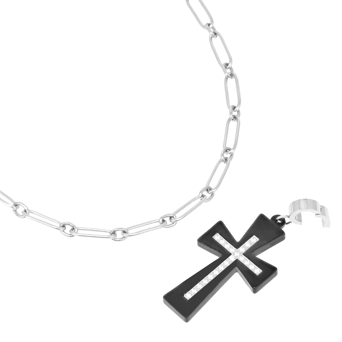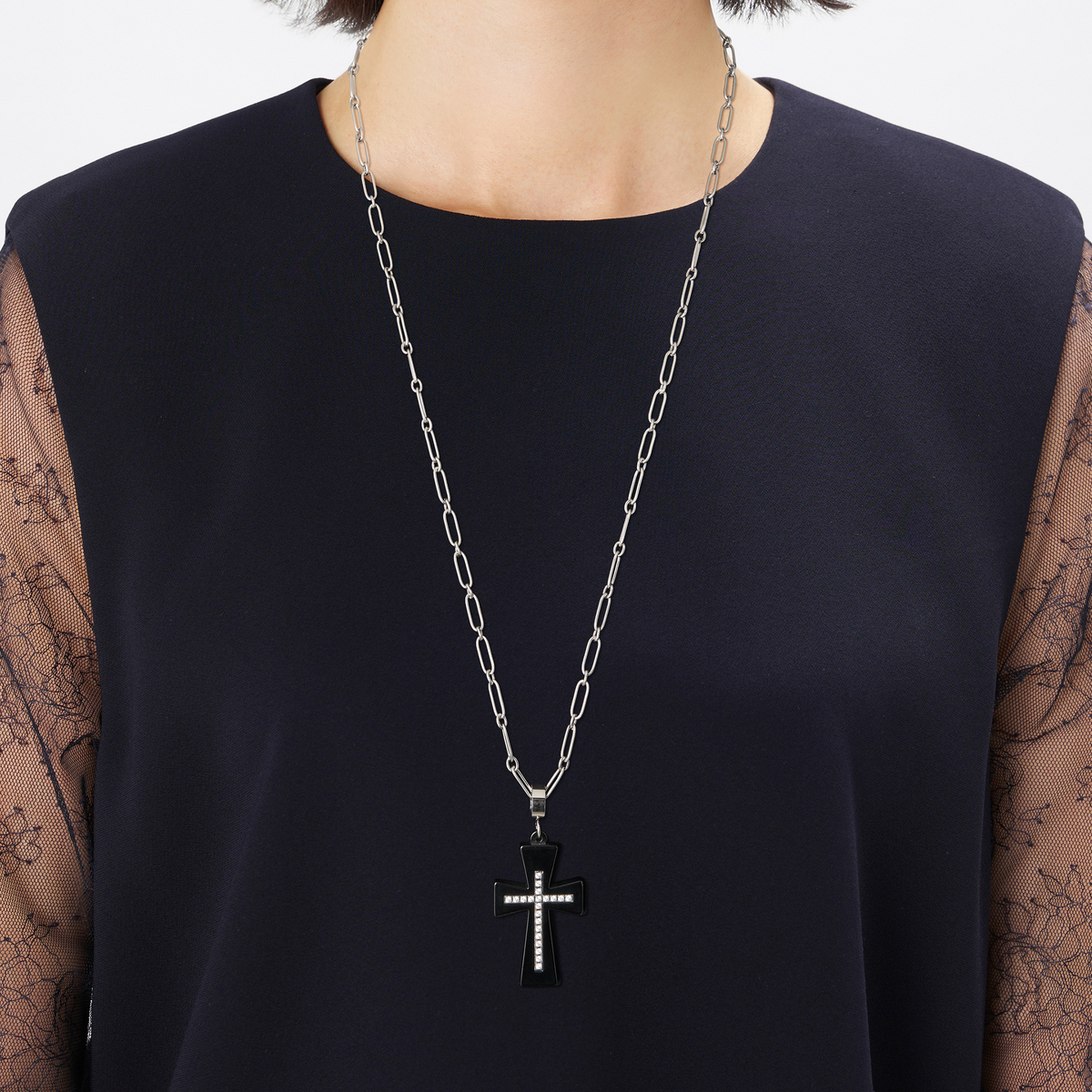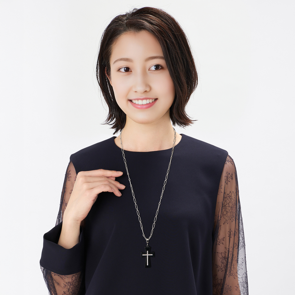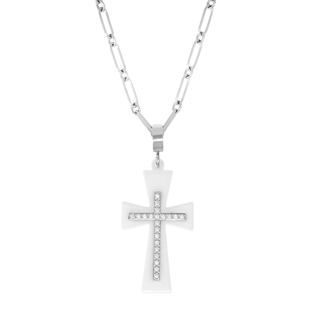 セラミックの艶やかな美しさとキュービックジルコニアの輝きが楽しめる、クロスモチーフのペンダント。スタイリッシュなデザインが胸元にアクセントを添えます