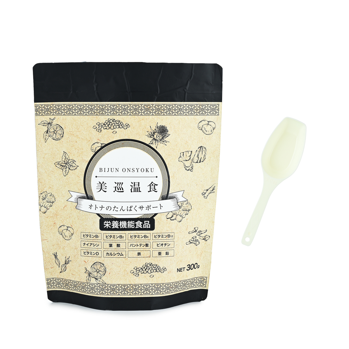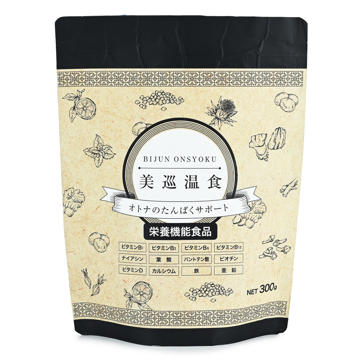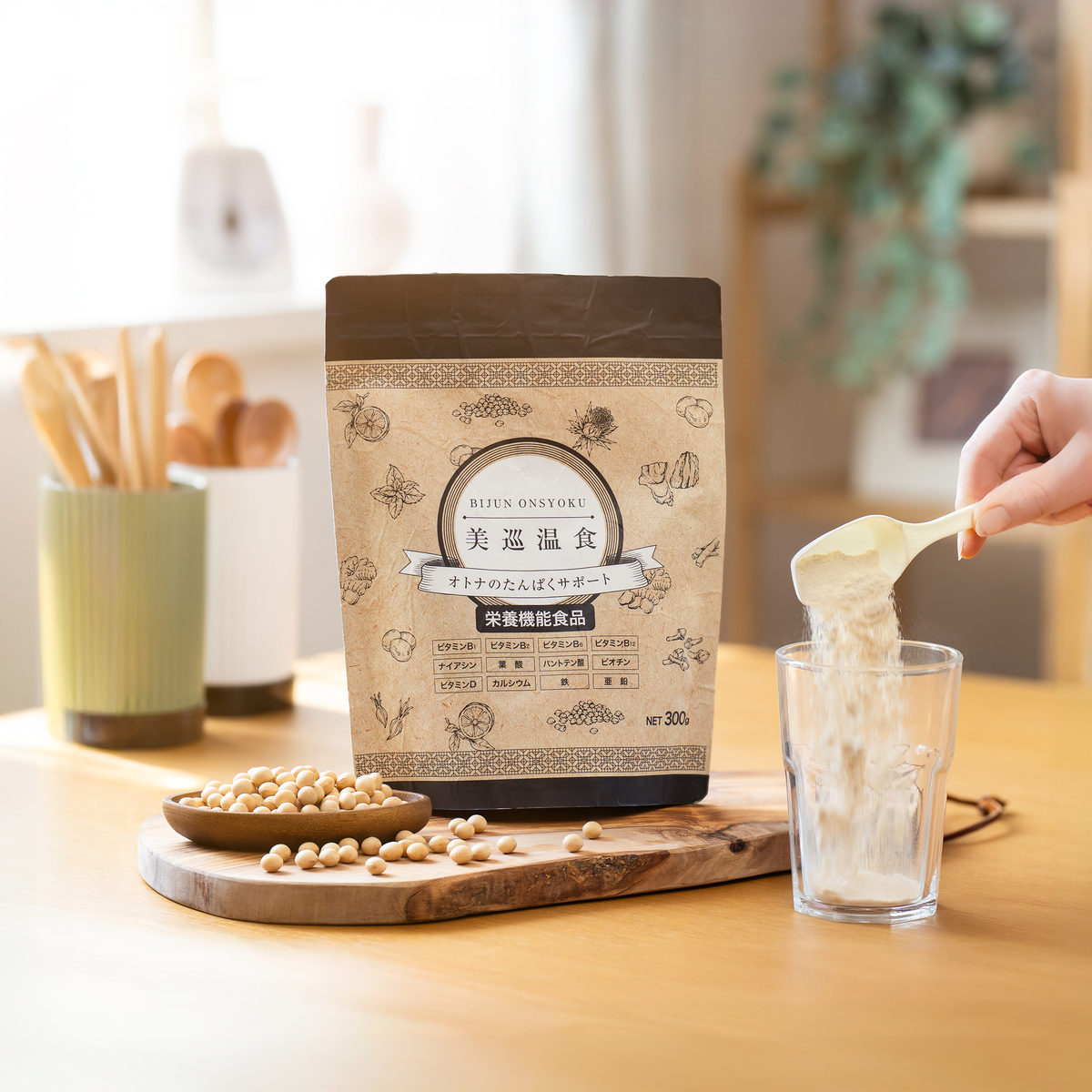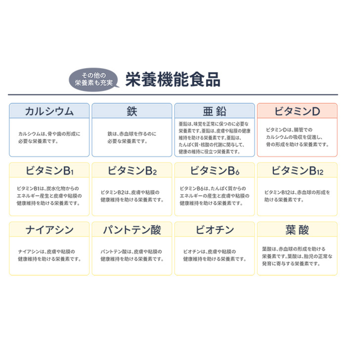 [アレルギー物質特定原材料8品目] 乳 [内容量] 300g(スプーン入り) [目安量] 1日1回10g [保存方法] 直射日光及び高温多湿の場所を避け、涼しい所に保存してください。開封後は湿気を防ぐためチャックをしっかりと閉め、賞味期限に関わらずなるべくお早めにお召し上がりください [お召し上がり方] 1日約10g(付属のスプーンすりきり1杯)を目安に、水やお湯等(100〜150ml)で溶かしてお召し上がりください。コップ等の容器に先に本品を入れた後、水やお湯等を加え、底に粉が残らないように全体をしっかり混ぜてください [栄養成分表示] 10g当たり エネルギー/38kcal たんぱく質/5.3g 脂質/0.5g 炭水化物/2.9g 食塩相当量/0.23g ビタミンB1:0.72mg ビタミンB2:0.65mg ビタミンB6 :0.63mg ビタミンB12 :1.5μg ナイアシン:11.0mg 葉酸:110μg パントテン酸:5.80mg ビオチン:39.0μg ビタミンD:3.0μg カルシウム:250mg 鉄:3.6mg 亜鉛:3.2mg ■栄養機能食品:ビタミンB1・ビタミンB2・ビタミンB6・ビタミンB12・ナイアシン・葉酸・パントテン酸・ビオチン・ビタミンD・カルシウム・鉄・亜鉛 [原料原産地] 粉末状大豆たんぱく(国内製造) [原産国] 日本 [注意事項] ※乳幼児・小児は本品の摂取を避けてください ※本品は、多量摂取により疾病が治癒したり、より健康が増進するものではありません。1日の摂取目安量を守ってください ※葉酸は、胎児の正常な発育に寄与する栄養素ですが、多量摂取により胎児の発育がよくなるものではありません ※亜鉛の摂り過ぎは、銅の吸収を阻害するおそれがありますので、過剰摂取にならないように注意してください。乳幼児・小児は本品の摂取を避けてください ※1日当たりの摂取目安量に含まれる当該栄養成分の量が栄養素等表示基準値(18歳以上、基準熱量2200kcal)に占める割合:(V.B1)60%、(V.B2)46%、(V.B6)48%、(V.B12)63%、(ナイアシン)85%、(葉酸)46%、(パントテン酸)121%、(ビオチン)78%、(V.D)55%、(カルシウム)37%、(鉄)53%、(亜鉛)36% ※本品は特定保健用食品と異なり、消費者庁長官による個別審査を受けたものではありません ※体質や体調により、まれに合わない場合があります。その場合はお召し上がり量を減らすか、お召し上がりにならないでください ※食物アレルギーの方は原材料表記をご確認の上、お召し上がりください ※薬を服用中、あるいは通院中の方、妊娠、授乳中の方は医師にご相談の上、お召し上がりください ※開封後は湿気を防ぐためチャックをしっかりと閉め、賞味期限に関わらずなるべくお早めにお召し上がりください ※お召し上がりの直前に溶かし、溶かした後は速やかにお飲みください ※濡れたスプーンを袋に入れないでください ※乳幼児の手の届かない場所に保管してください ※製造ロット毎に、色・風味に多少のばらつきが生じますが品質には問題ありません ※直射日光及び高温多湿の場所を避け、涼しい所に保存してください ※食生活は、主食、主菜、副菜を基本に、食事のバランスを [原材料] 粉末状大豆たんぱく(国内製造)、乳清たんぱく、難消化性デキストリン、粉末油脂(中鎖脂肪酸)、コラーゲンペプチド、食塩、ジンジャー粉末、植物抽出エキス(植物抽出エキス(ミツカトウ、ベニバナ、クチナシ果実、アサ種子、ナツメ果実、ダイダイ果実、ショウガ、カンゾウ、ハッカ)、デキストリン)、酵母、 クローブ粉末/貝カルシウム、増粘多糖類、香料、乳化剤、甘味料(スクラロース、アセスルファムカリウム、ステビア)、香辛料、トレハロース、ピロリン酸第二鉄、ニコチン酸アミド、パントテン酸カルシウム、ビオチン、ビタミンB12、ビタミンB1、ビタミンB6、ビタミンB2、ビタミンD、葉酸、(一部に乳成分・大豆・ゼラチンを含む)