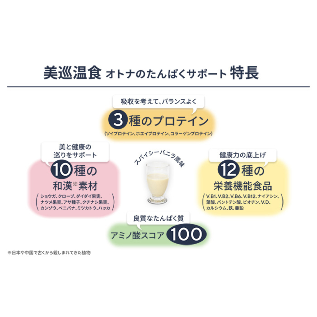 3種のプロテインと健康維持をサポートする栄養素を配合した12種の栄養機能食品。由来が異なる3種のプロテイン:ホエイプロテイン(乳清たんぱく)、ソイプロテイン(大豆たんぱく)、コラーゲンプロテイン(コラーゲンペプチド)をバランスよく配合。飽きずに美味しく飲めるスパイシーバニラ風味で、ただ甘いだけではなくほんのり香るスパイスがアクセントです