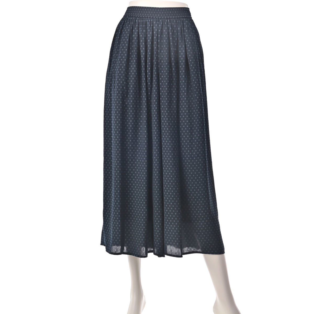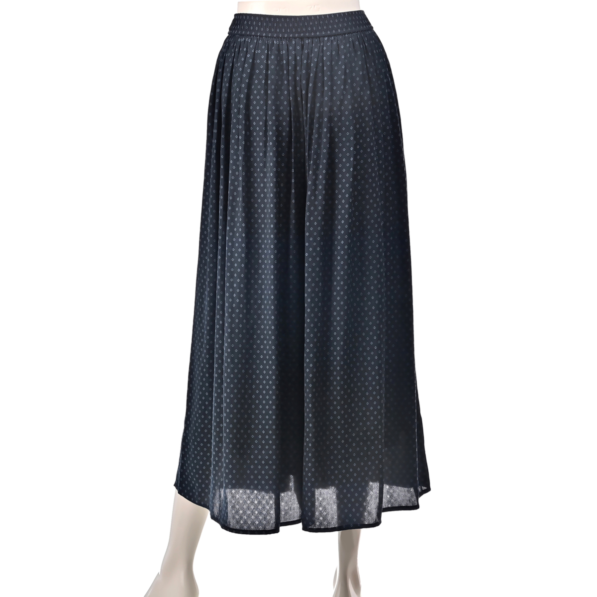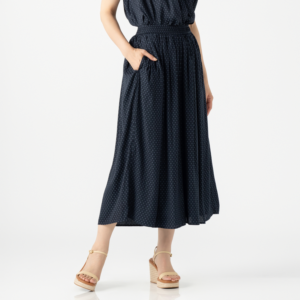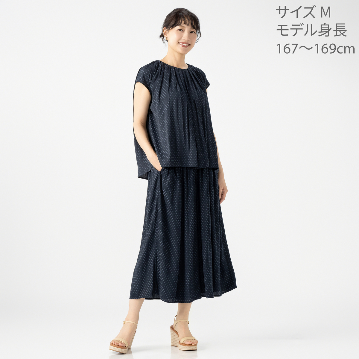 ギャザーたっぷりでけまわし(分量感)もあるスカートに見えるパンツですが、落ち感があるのですっきり見せてくれます。ウエストは総ゴムの引っ張って穿けるプルオン仕様で、両脇にはポケットも付いています