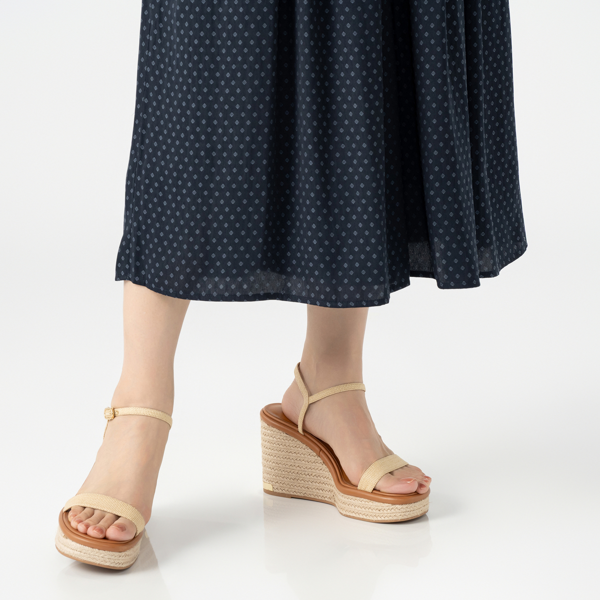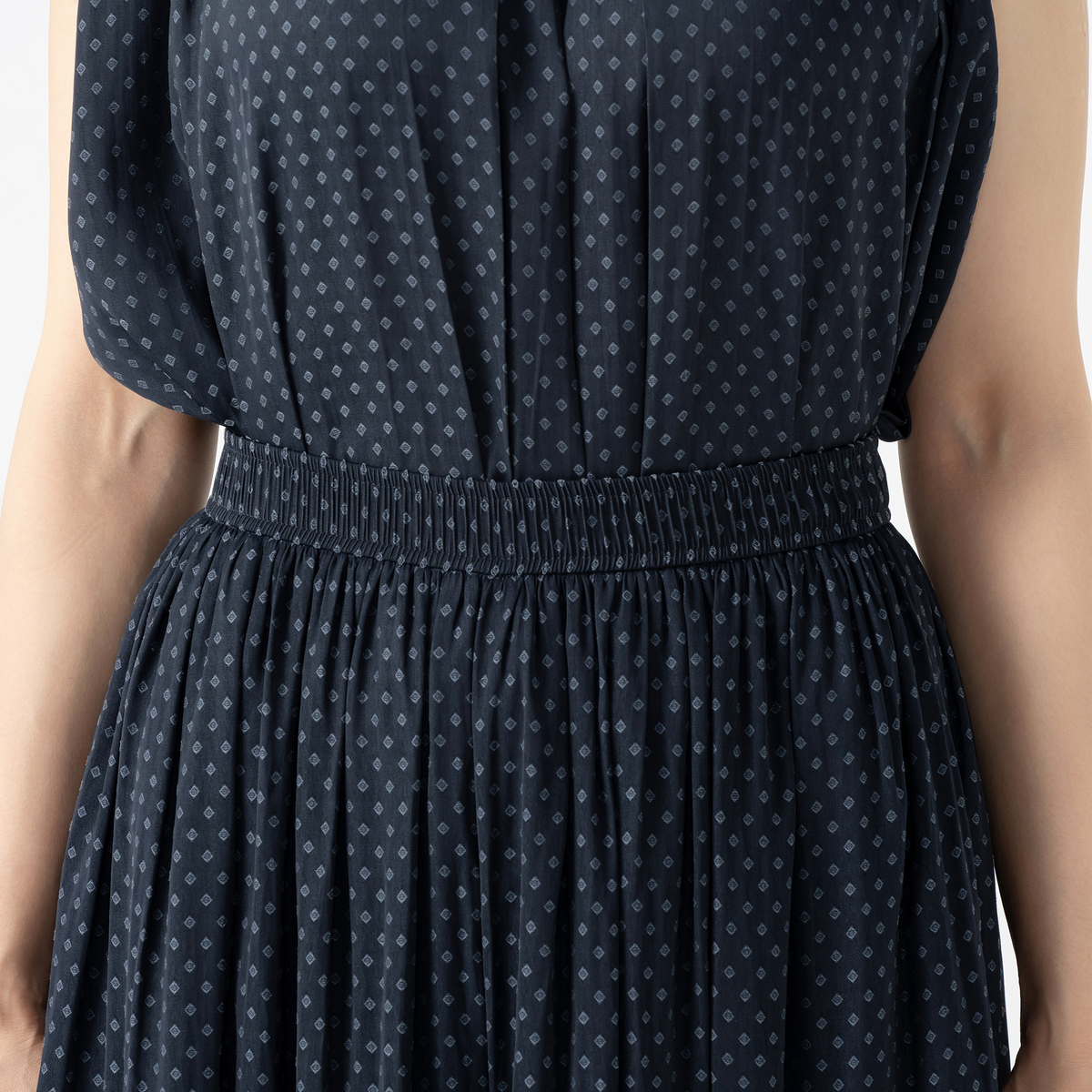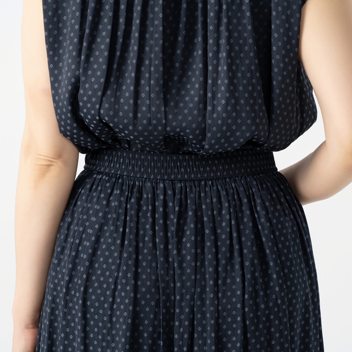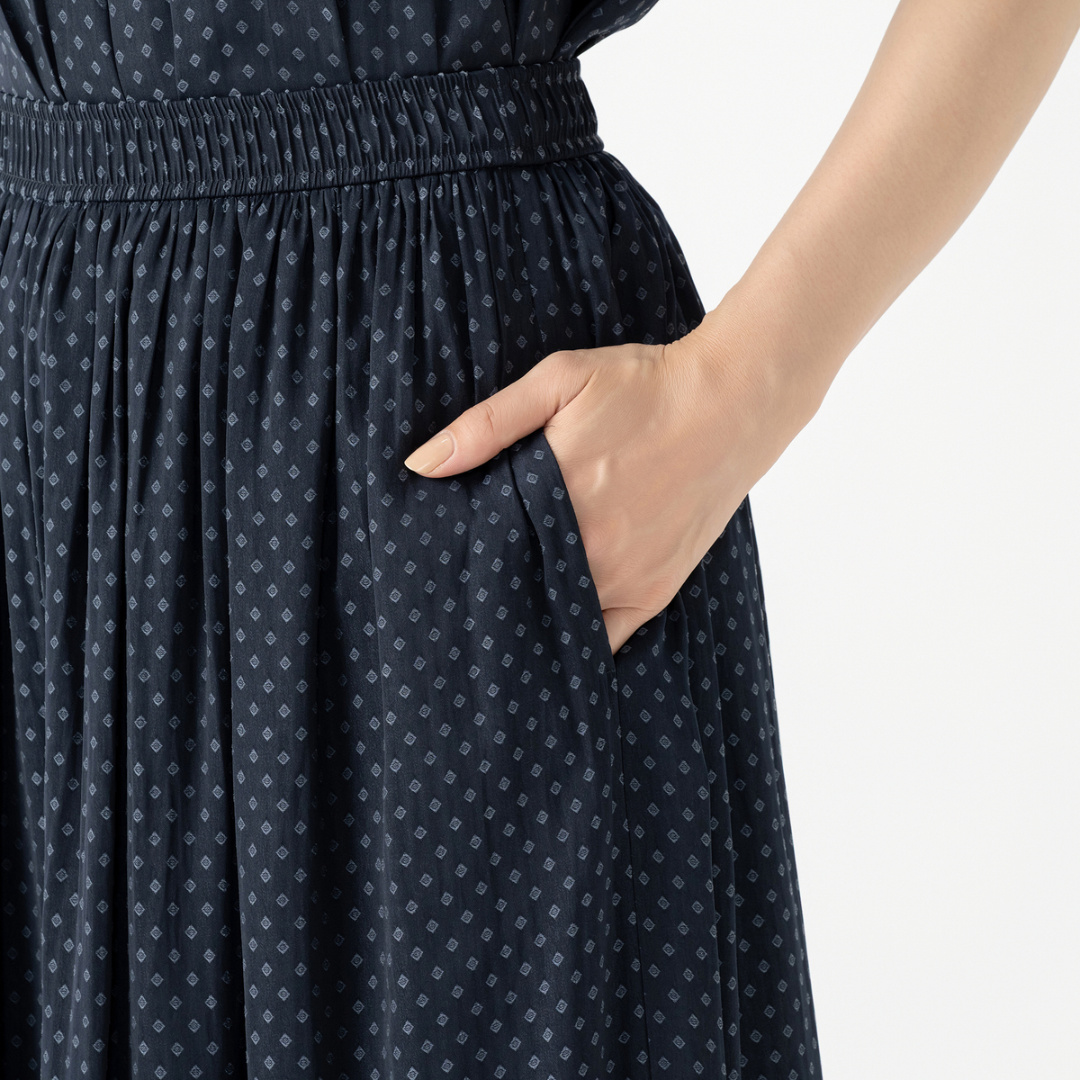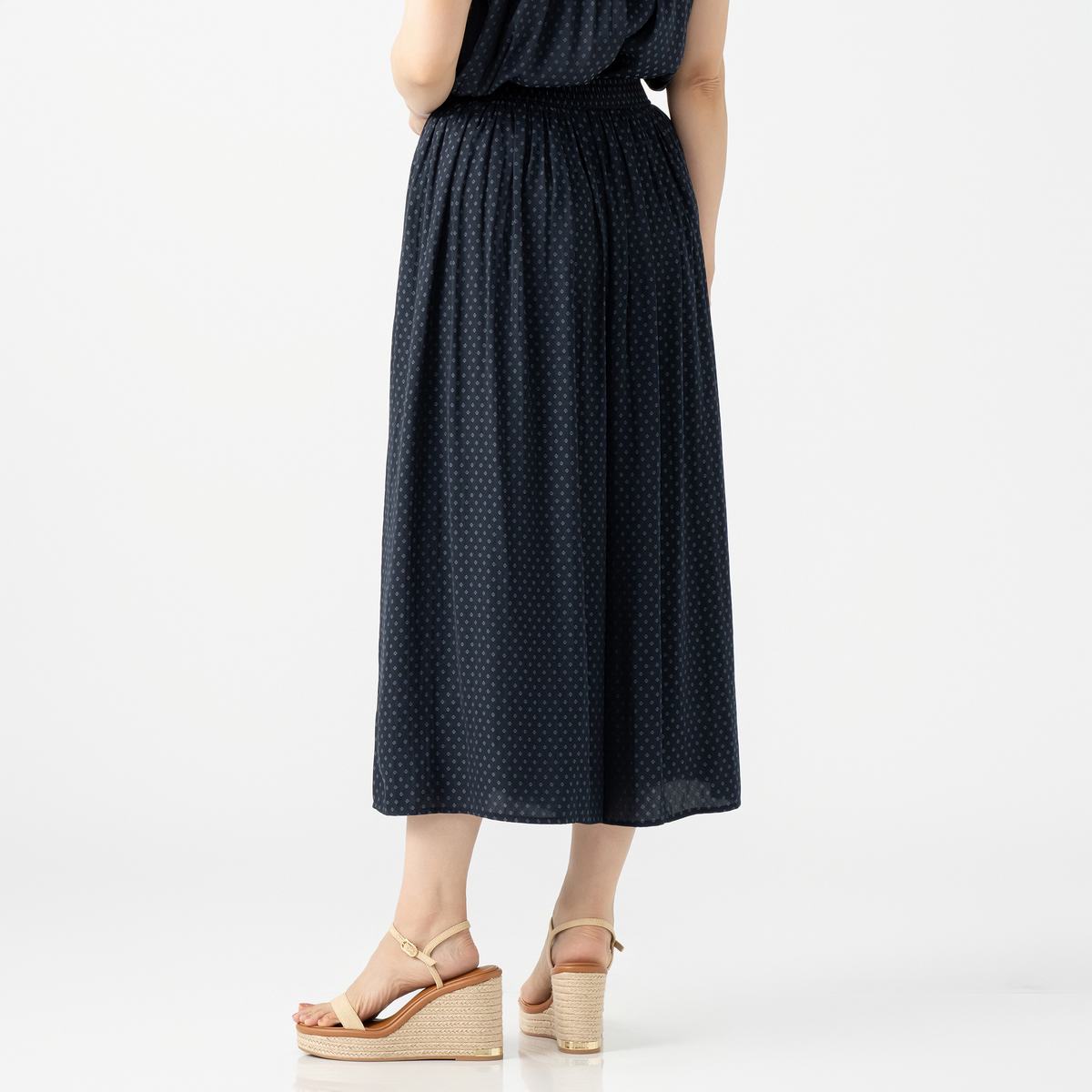 ギャザーたっぷりでけまわし(分量感)もあるスカートに見えるパンツですが、落ち感があるのですっきり見せてくれます。ウエストは総ゴムの引っ張って穿けるプルオン仕様で、両脇にはポケットも付いています