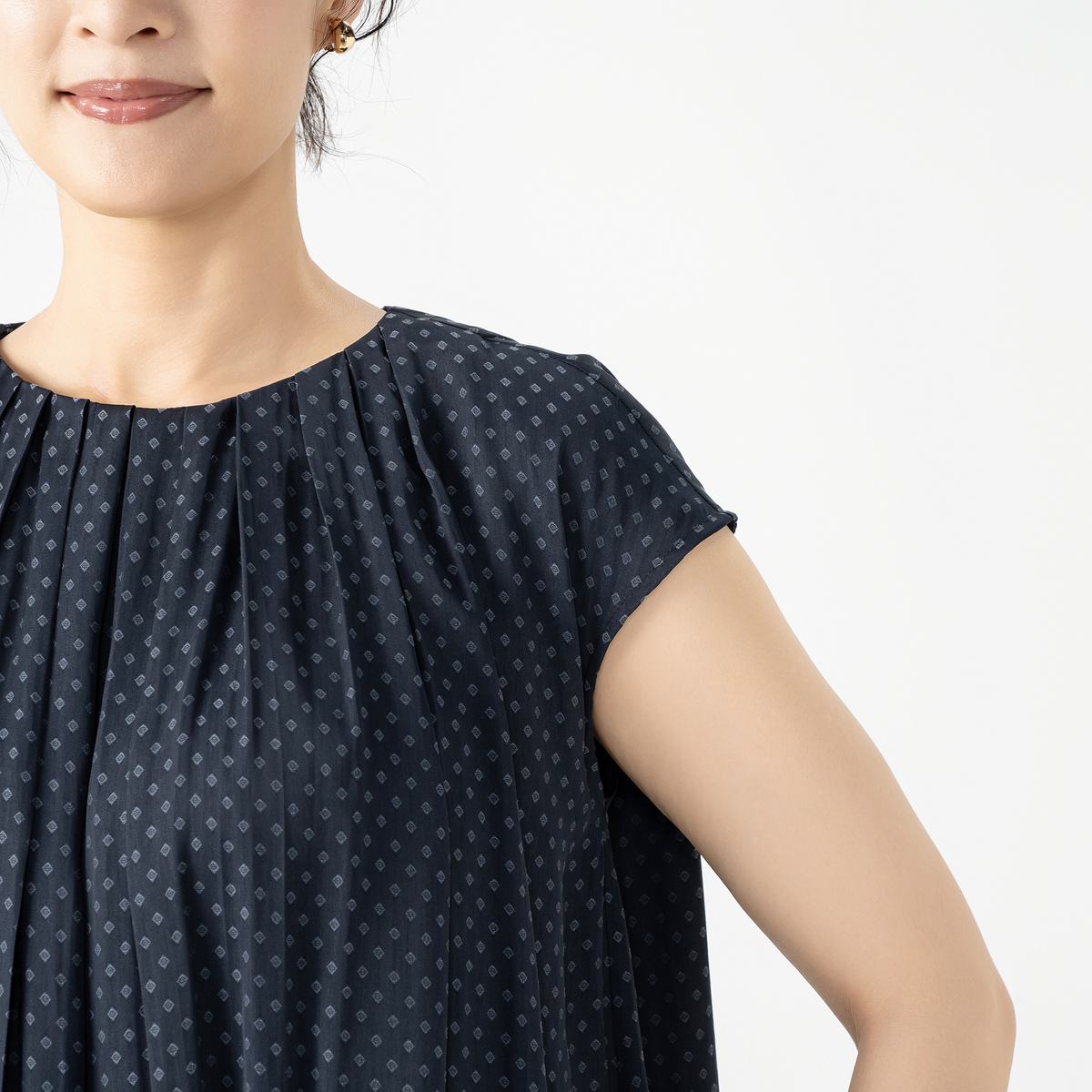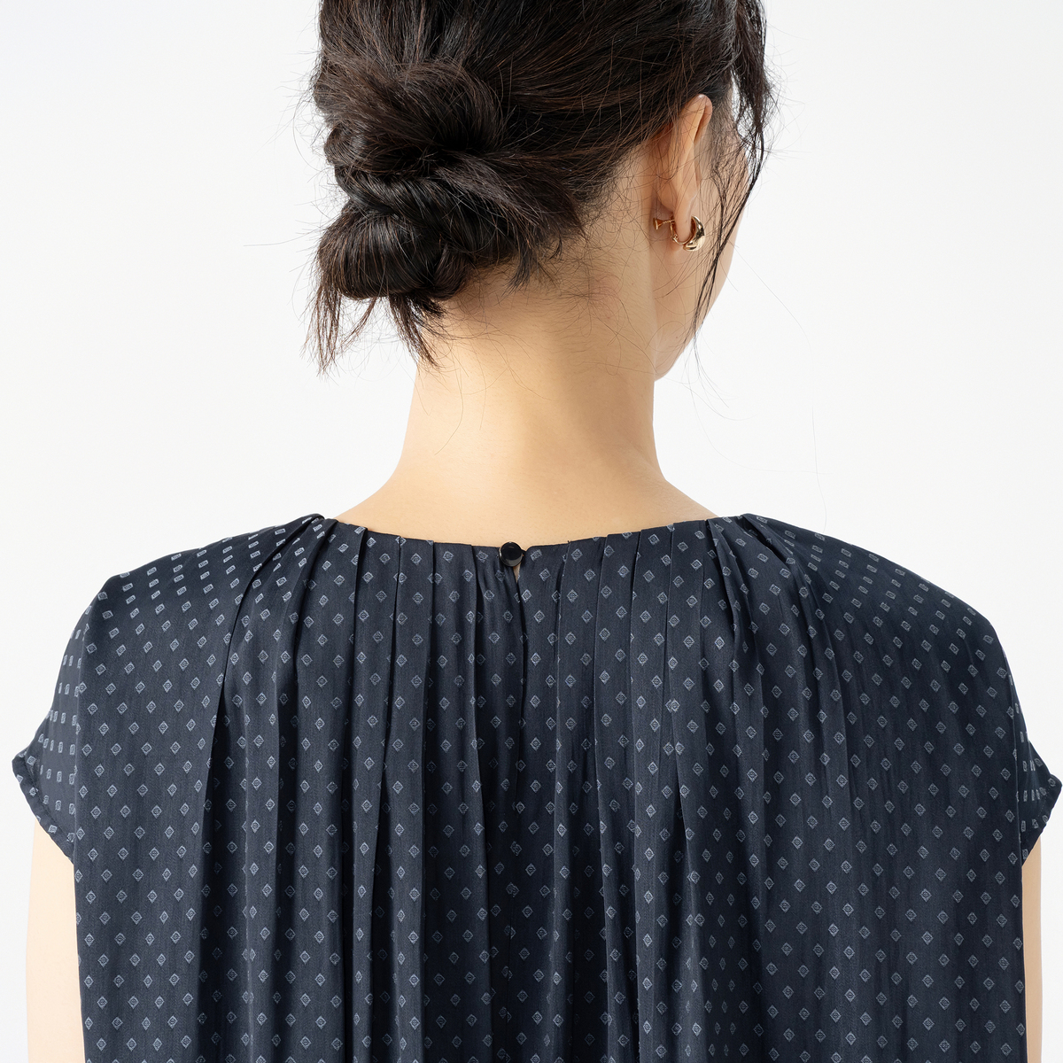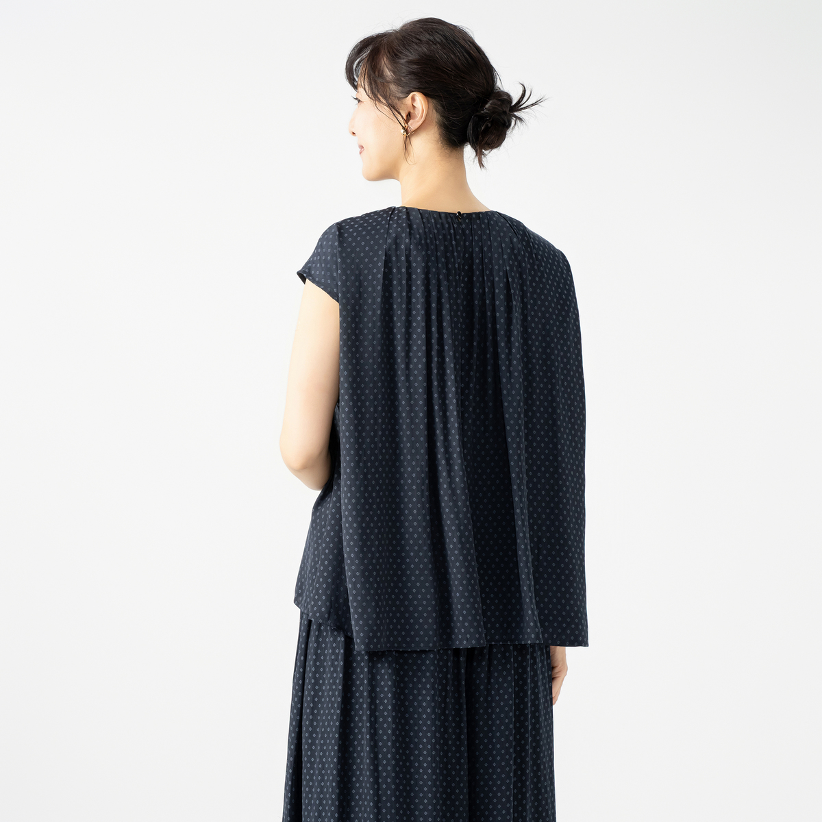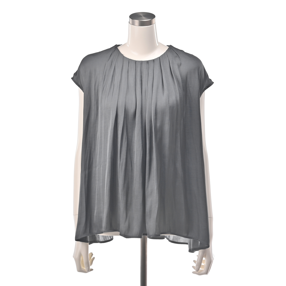 ヴィンテージ加工を施したサテン素材を使用したノースリーブ。表面が柔らかく波打ち、光沢感も柔らかに。襟元にタックを入れ、たっぷり分量を取ったデザインです