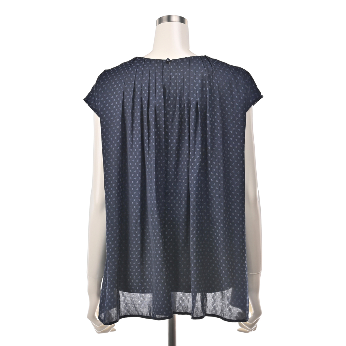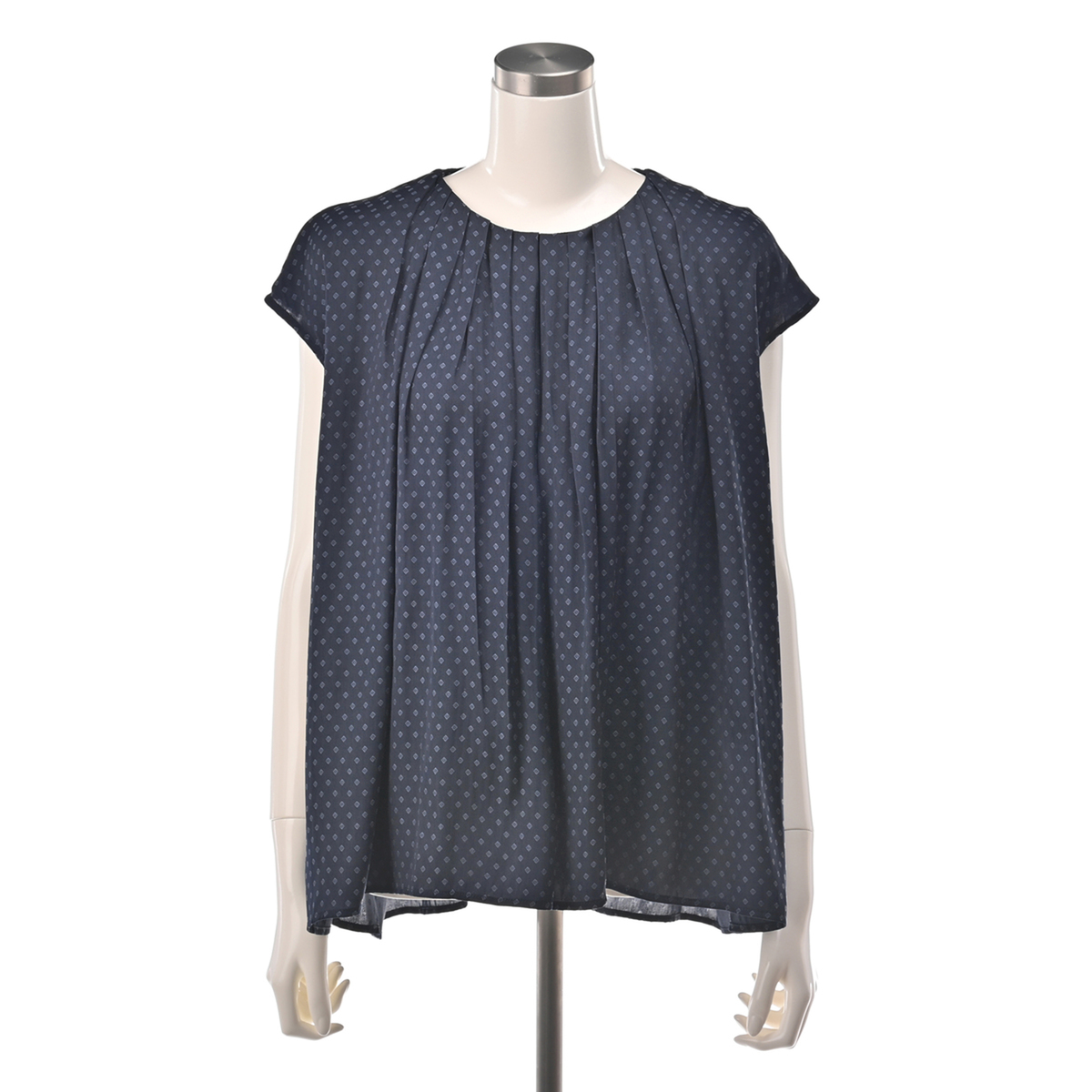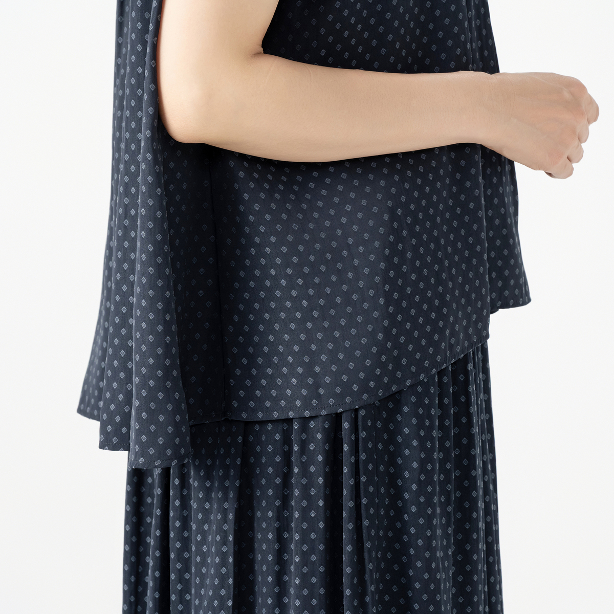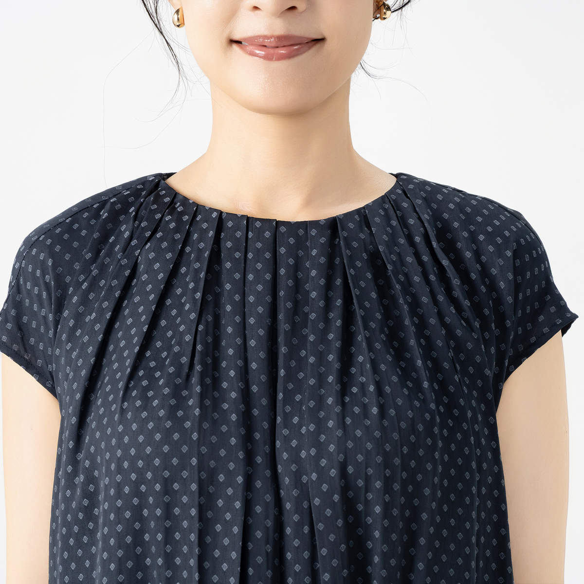 ヴィンテージ加工を施したサテン素材を使用したノースリーブ。表面が柔らかく波打ち、光沢感も柔らかに。襟元にタックを入れ、たっぷり分量を取ったデザインです