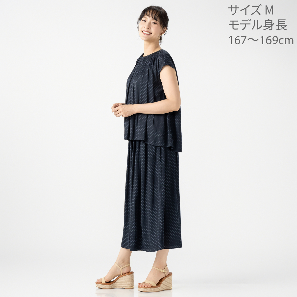 肩先まで隠れる肩幅設定で露出感を軽減しています。シンプルなパンツやスカートにも合わせやすく、様々なシーンで活躍します