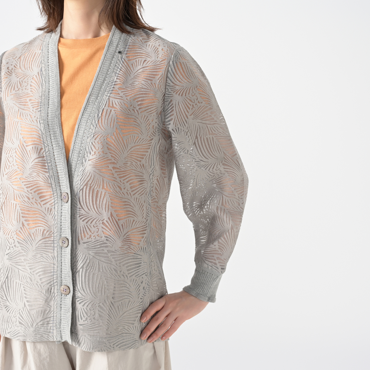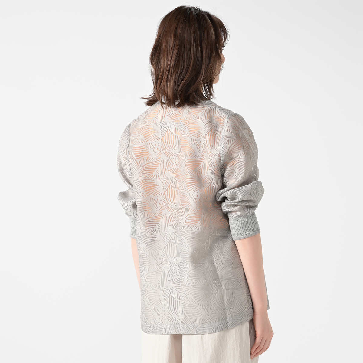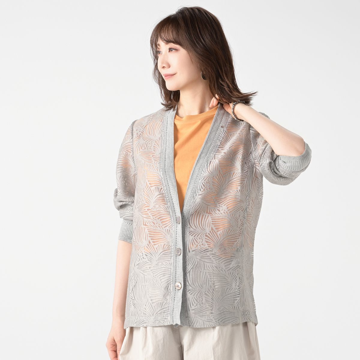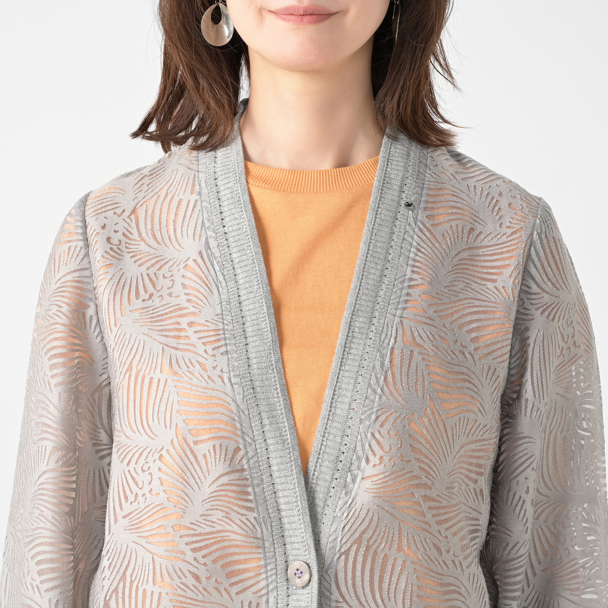 透け感のあるリーフ柄が軽やかなオパール加工生地のジャケディガン。カーディガンとジャケットの特徴を組合せたアイテムです
