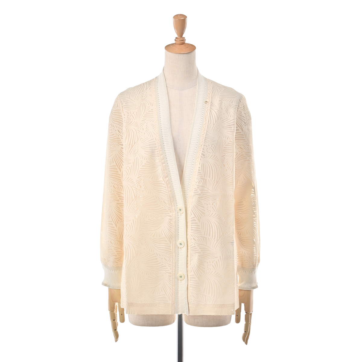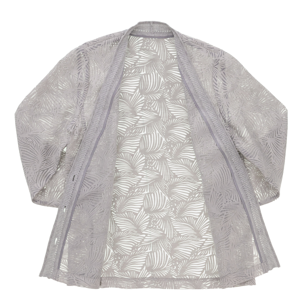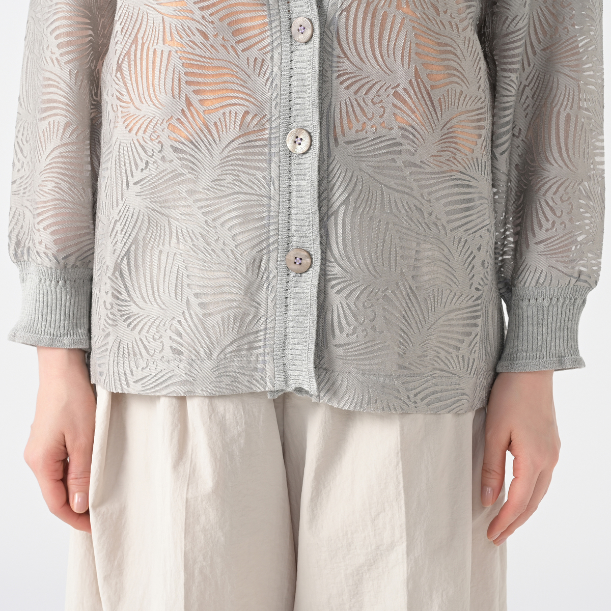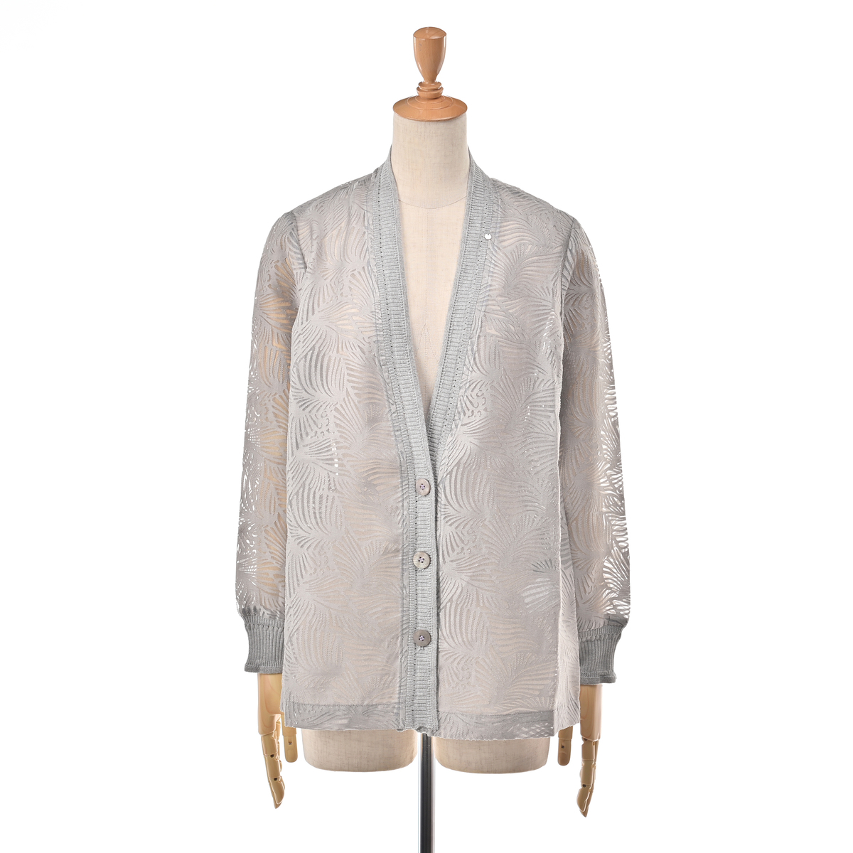 透け感のあるリーフ柄が軽やかなオパール加工生地のジャケディガン。カーディガンとジャケットの特徴を組合せたアイテムです