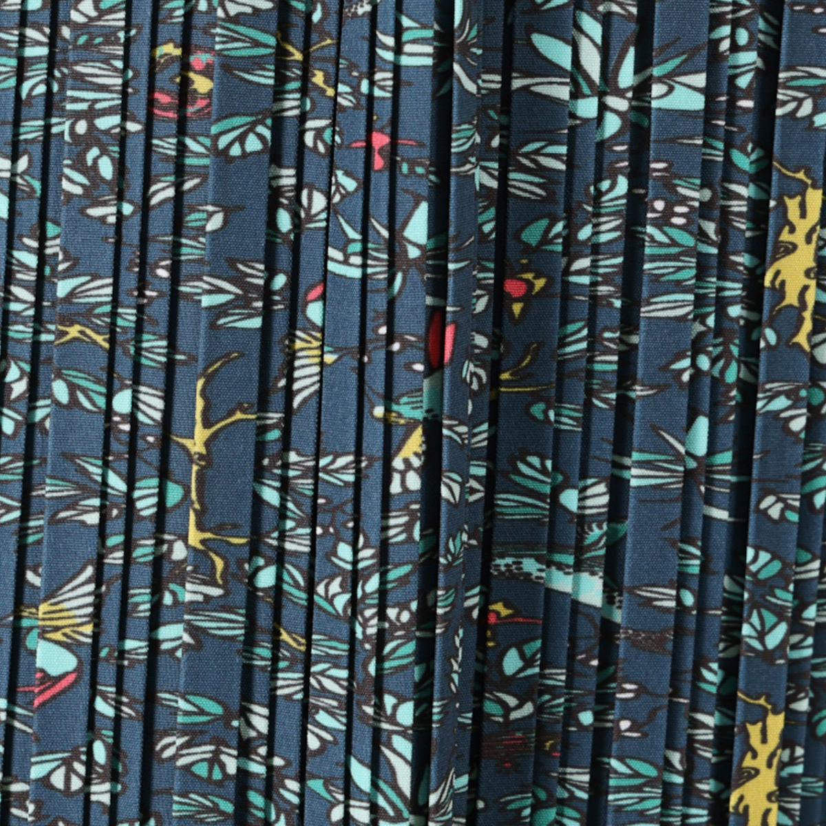 デザイナーが描いた、森の中を泳ぐクジラ柄、シー&フォレストのストーリーのある総柄をプリント。薄手で軽やかな布帛生地に、縦ラインを強調するリブのような細かなプリーツを施したパンツです