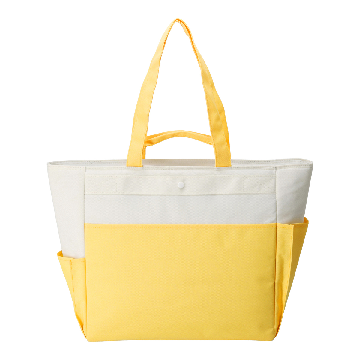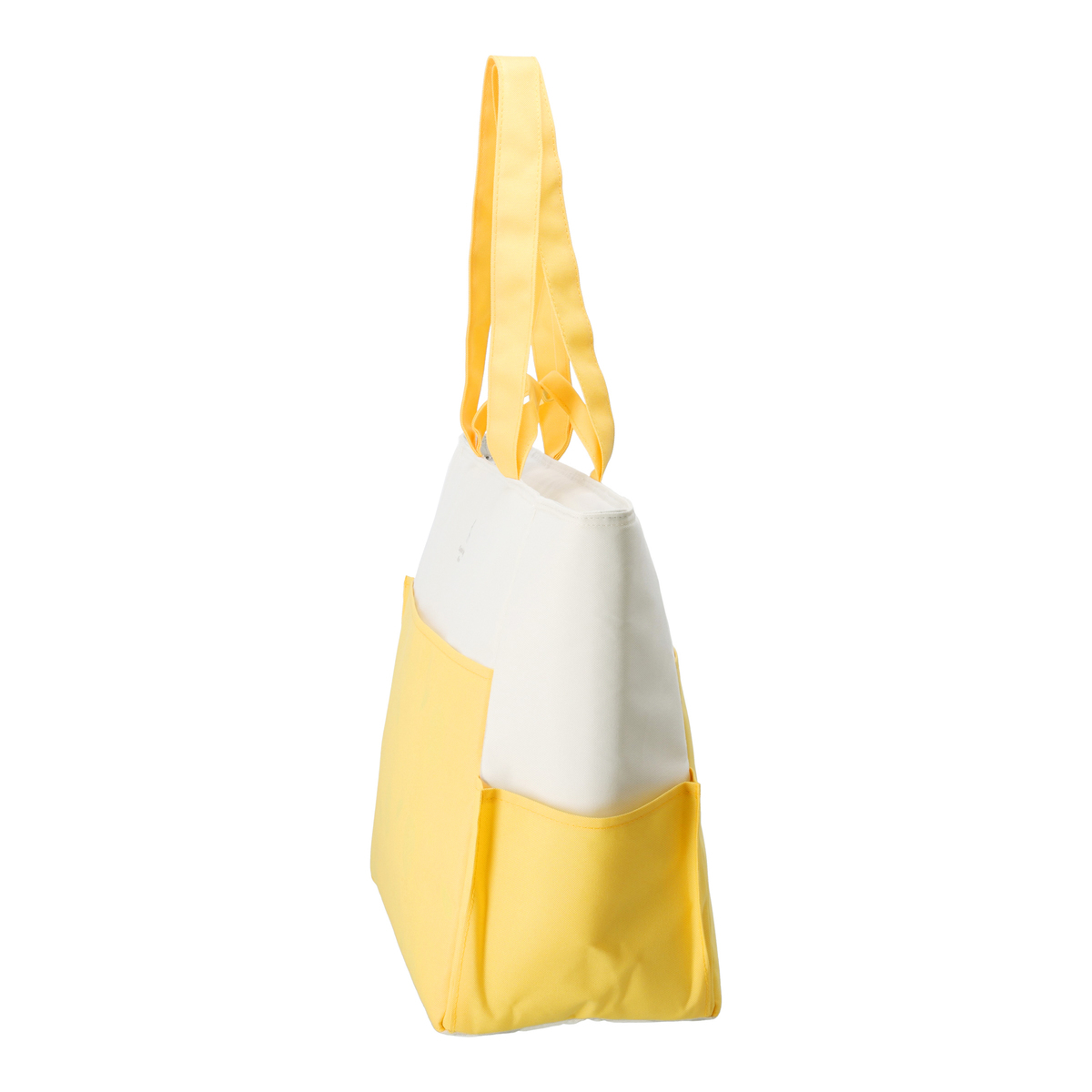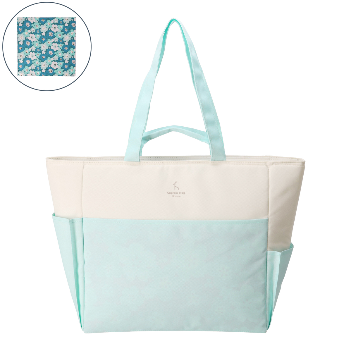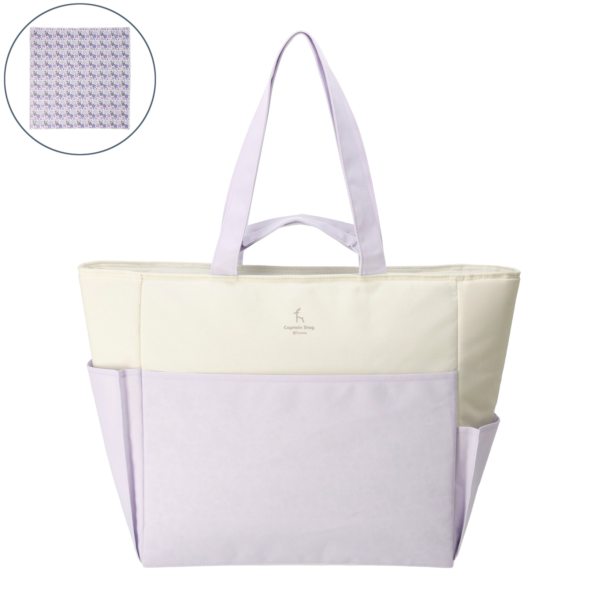 手提げと肩掛けの2WAY仕様で使いやすいクールトートバッグです。収納に便利なポケットが複数あり、内面には保冷剤ポケット*、前後面に大きなポケット、サイドには深さの異なるポケットを配置。裏面にはキャリーカートにも取り付け可能なベルトが付いています