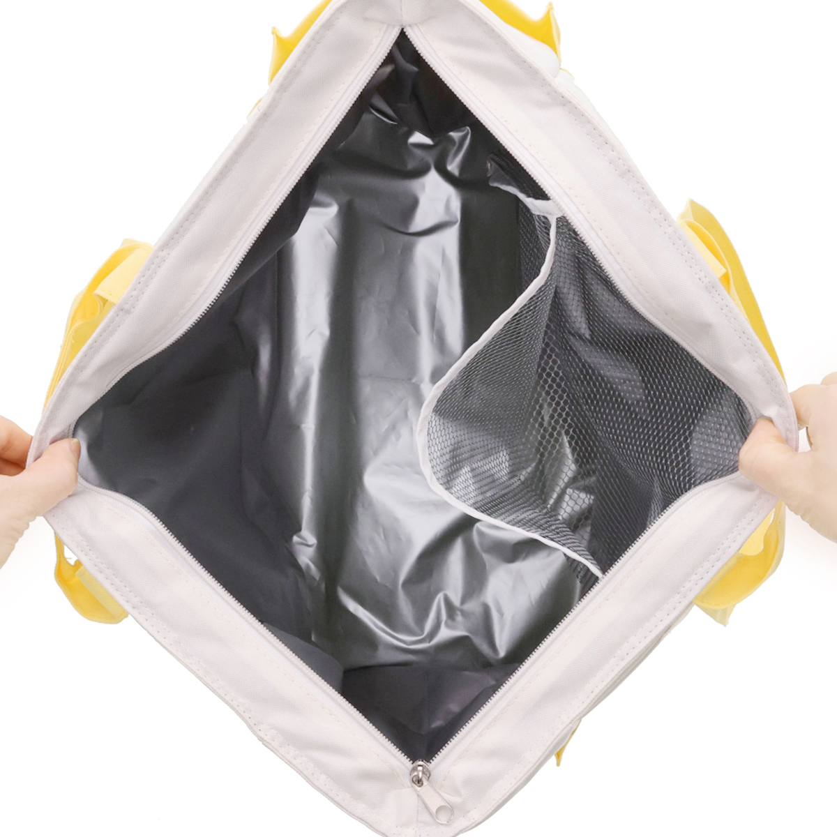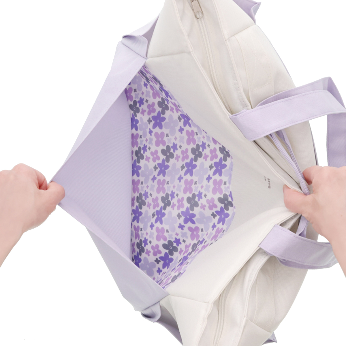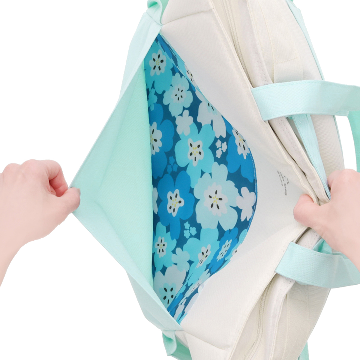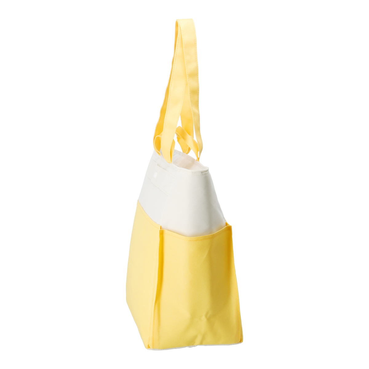 手提げと肩掛けの2WAY仕様で使いやすいクールトートバッグです。収納に便利なポケットが複数あり、内面には保冷剤ポケット*、前後面に大きなポケット、サイドには深さの異なるポケットを配置。裏面にはキャリーカートにも取り付け可能なベルトが付いています