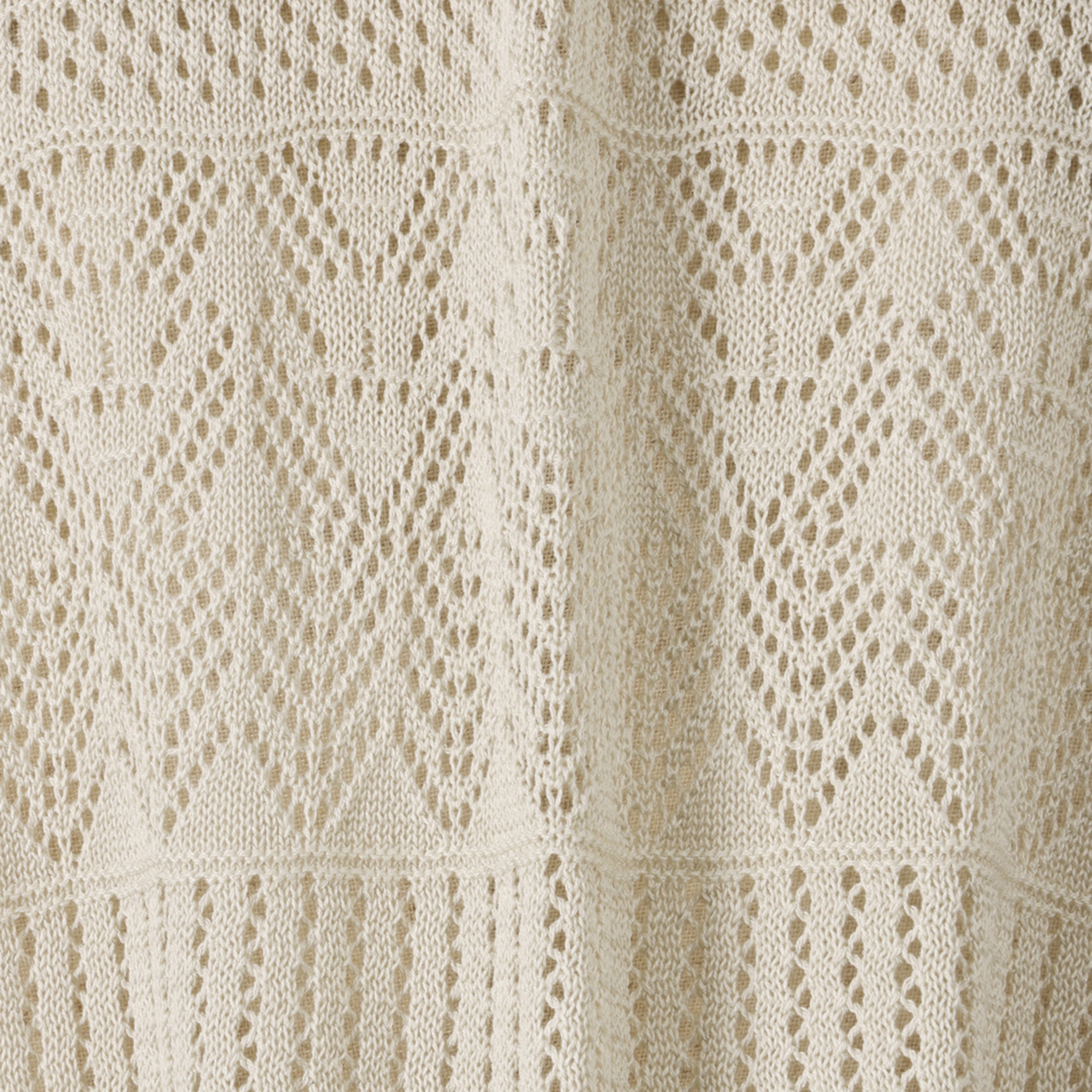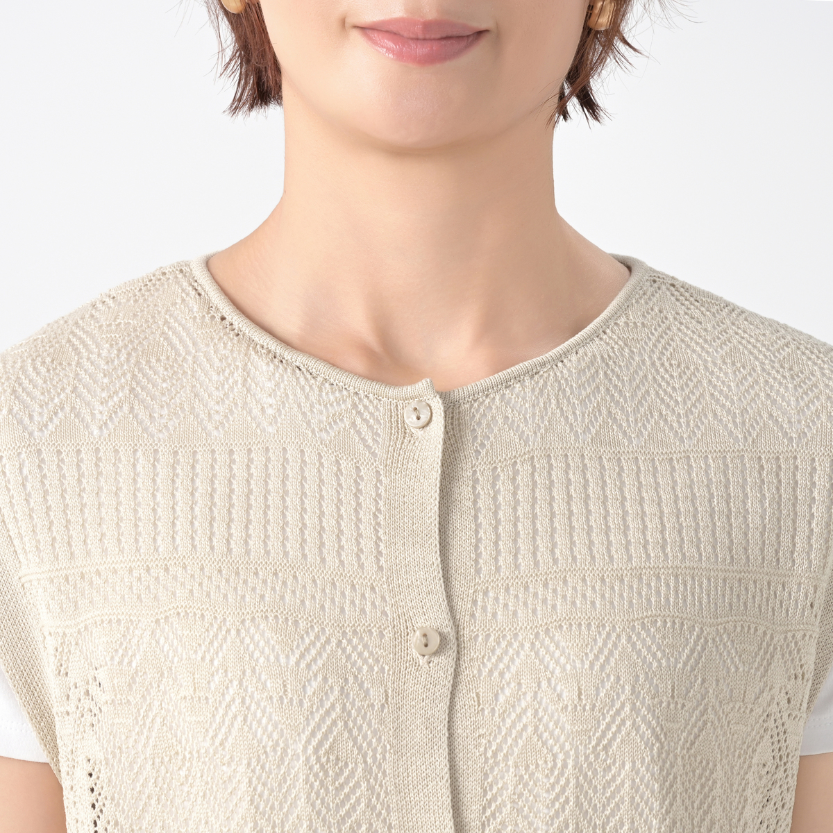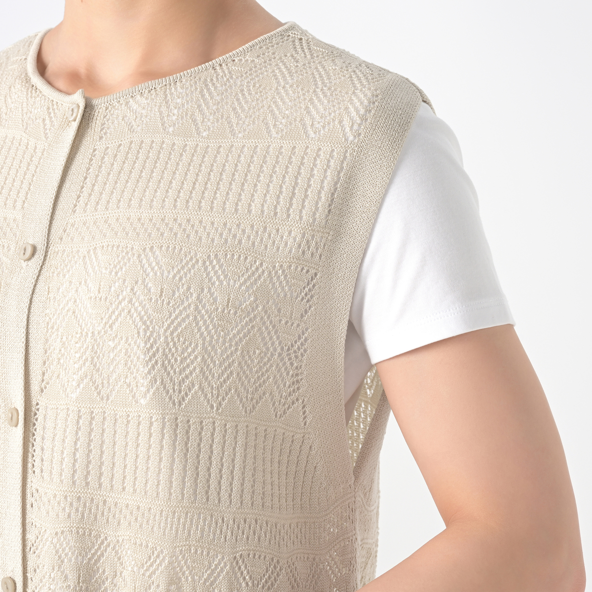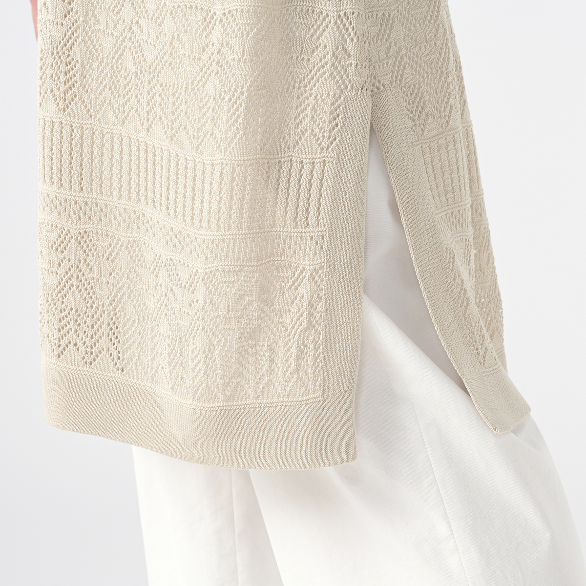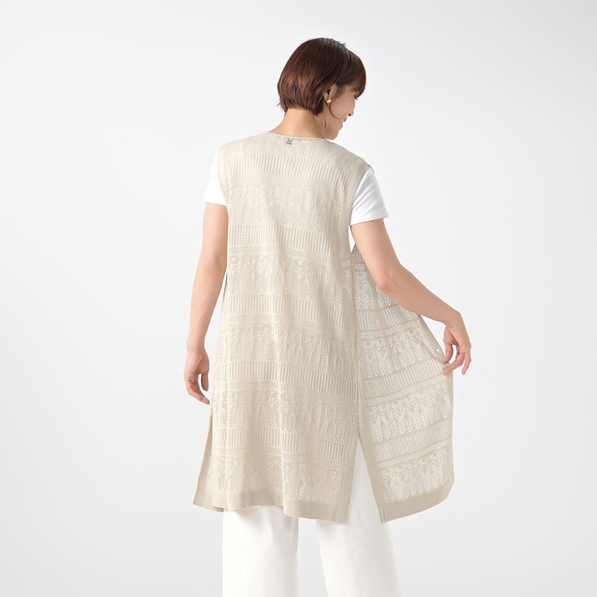 涼し気な透かし柄のニットジレ。エレガントなロング丈で、サイドのスリットが抜け感を演出するデザインです。サラッと羽織るだけで旬なレイヤードスタイルが完成します