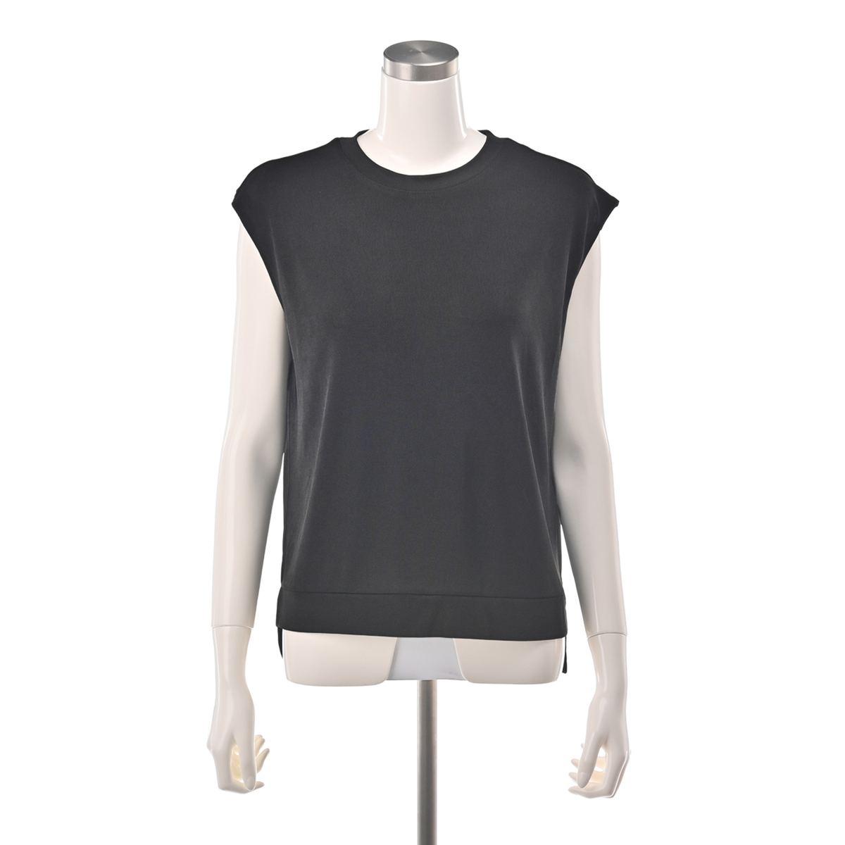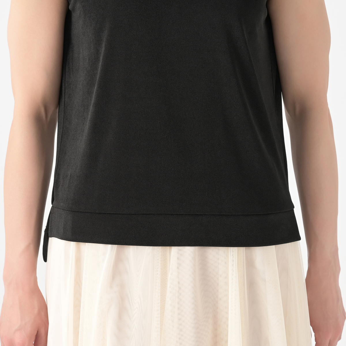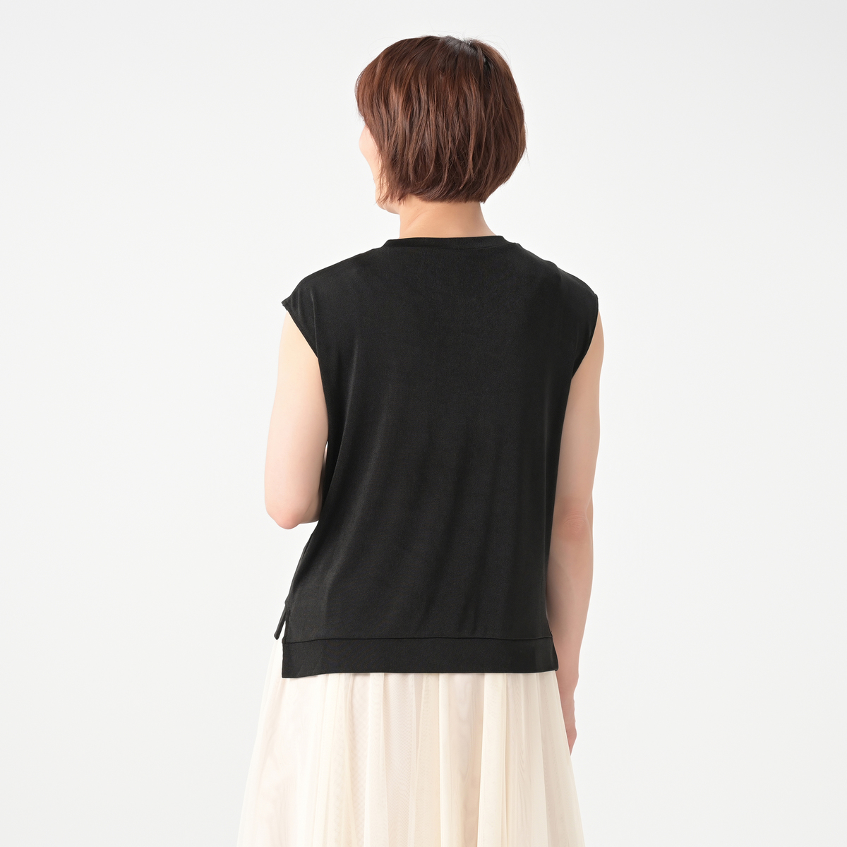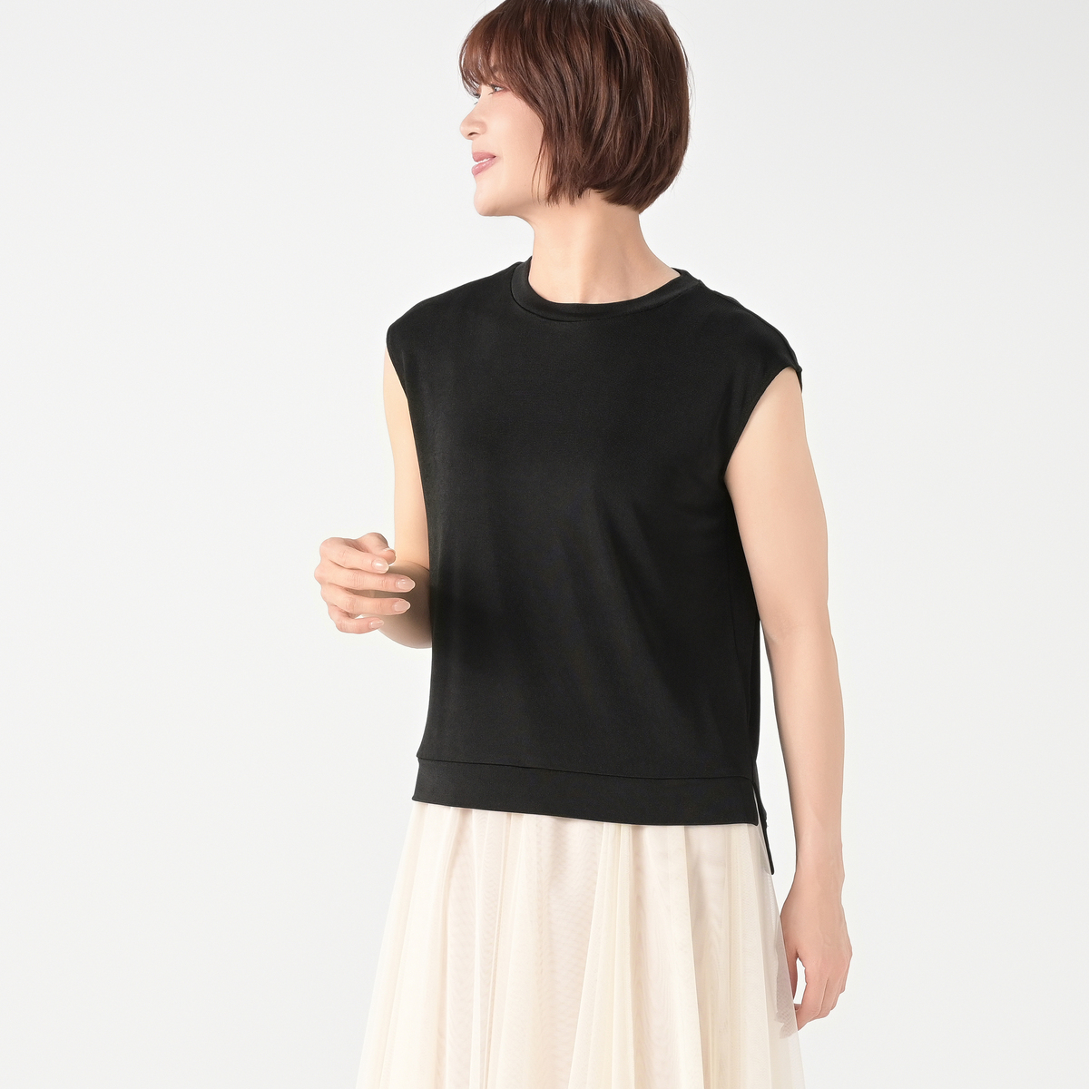 シンプルなラウンドネックで、ノースリーブの脇にスリットを入れたデザイン。後ろ丈がやや長いので、気になる腰周りをも気になりにくいです