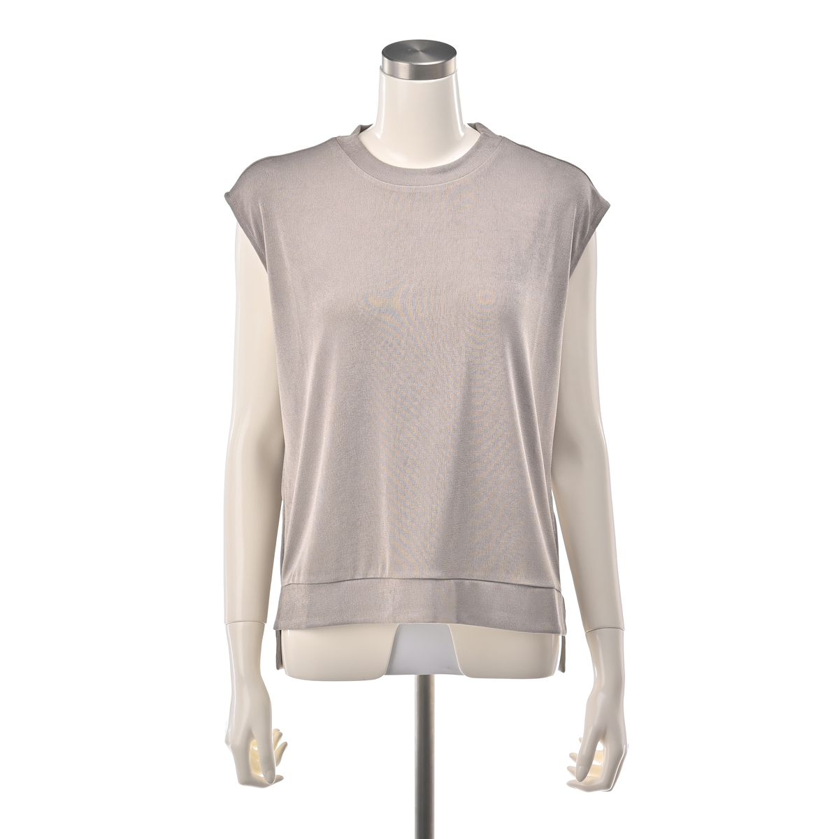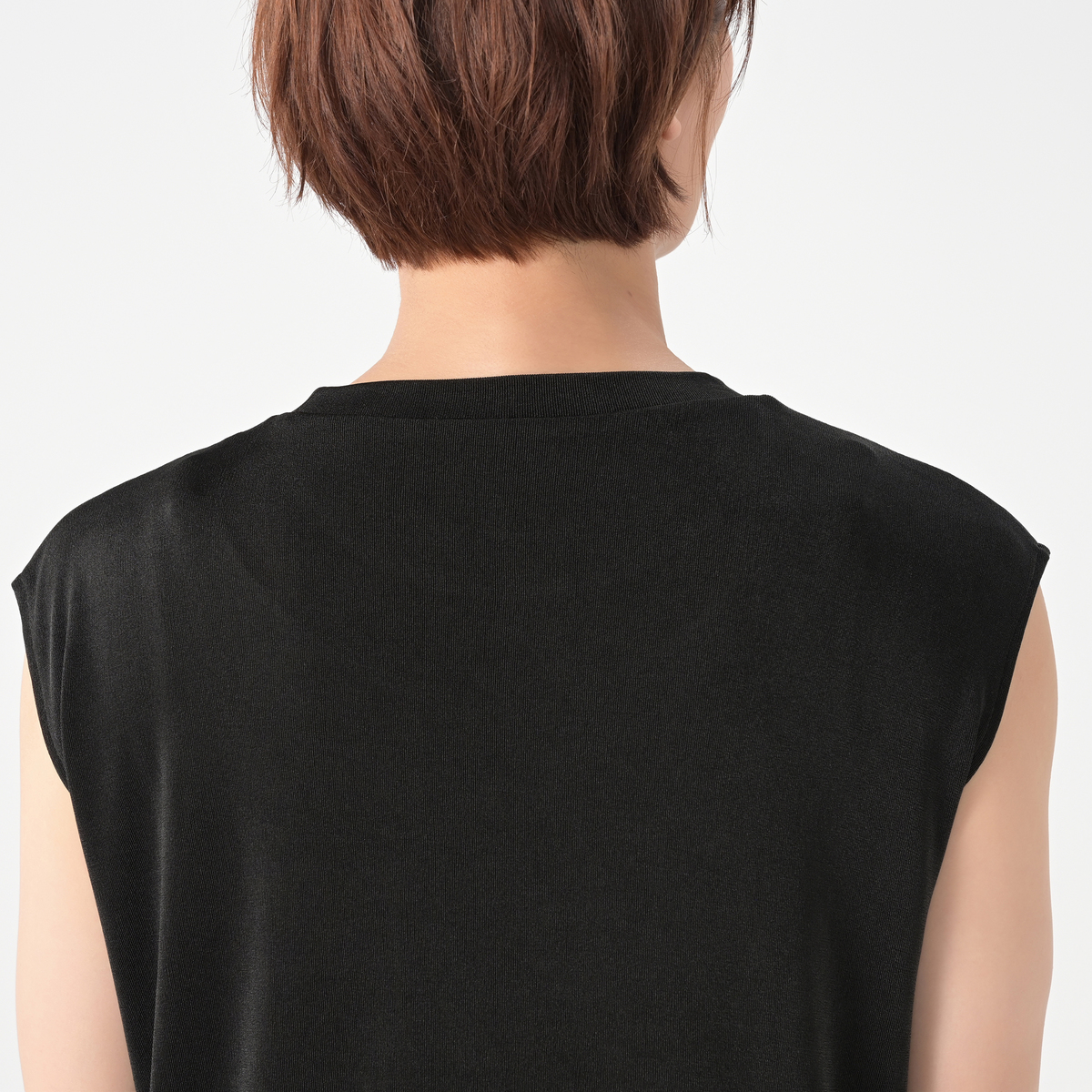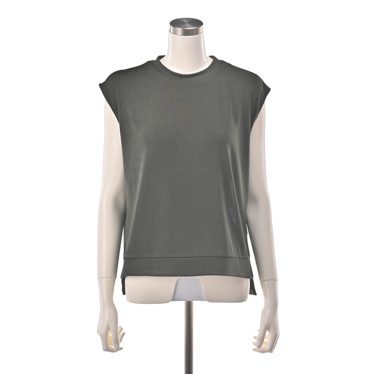 シンプルなラウンドネックで、ノースリーブの脇にスリットを入れたデザイン。後ろ丈がやや長いので、気になる腰周りをも気になりにくいです