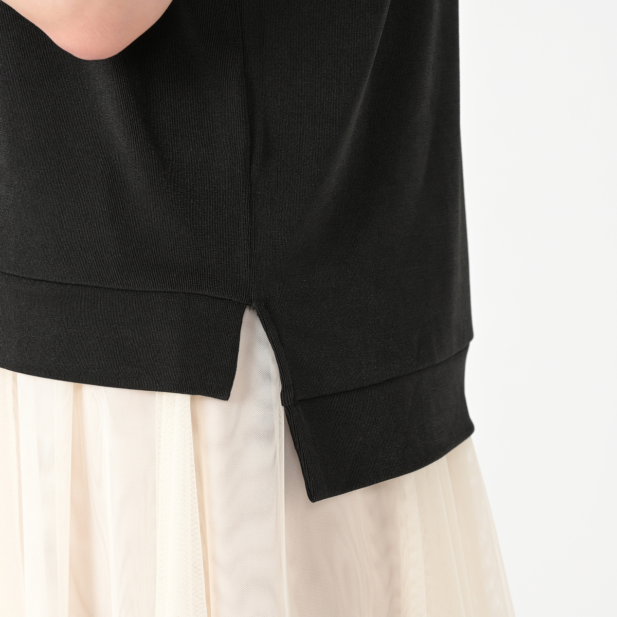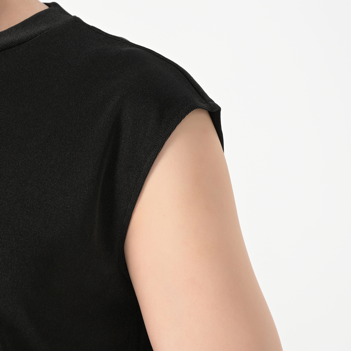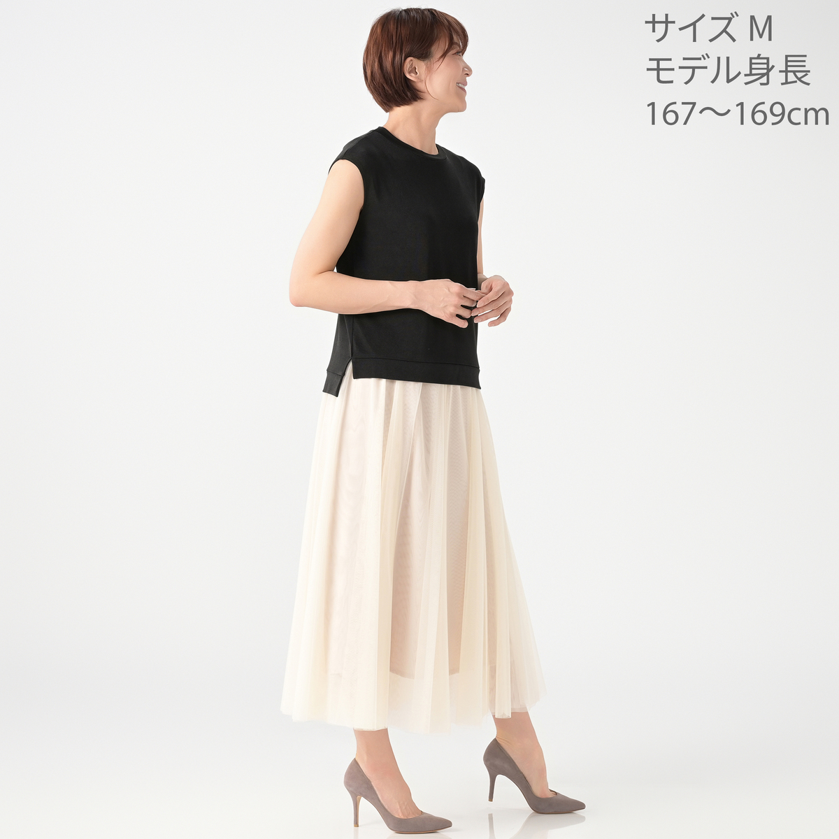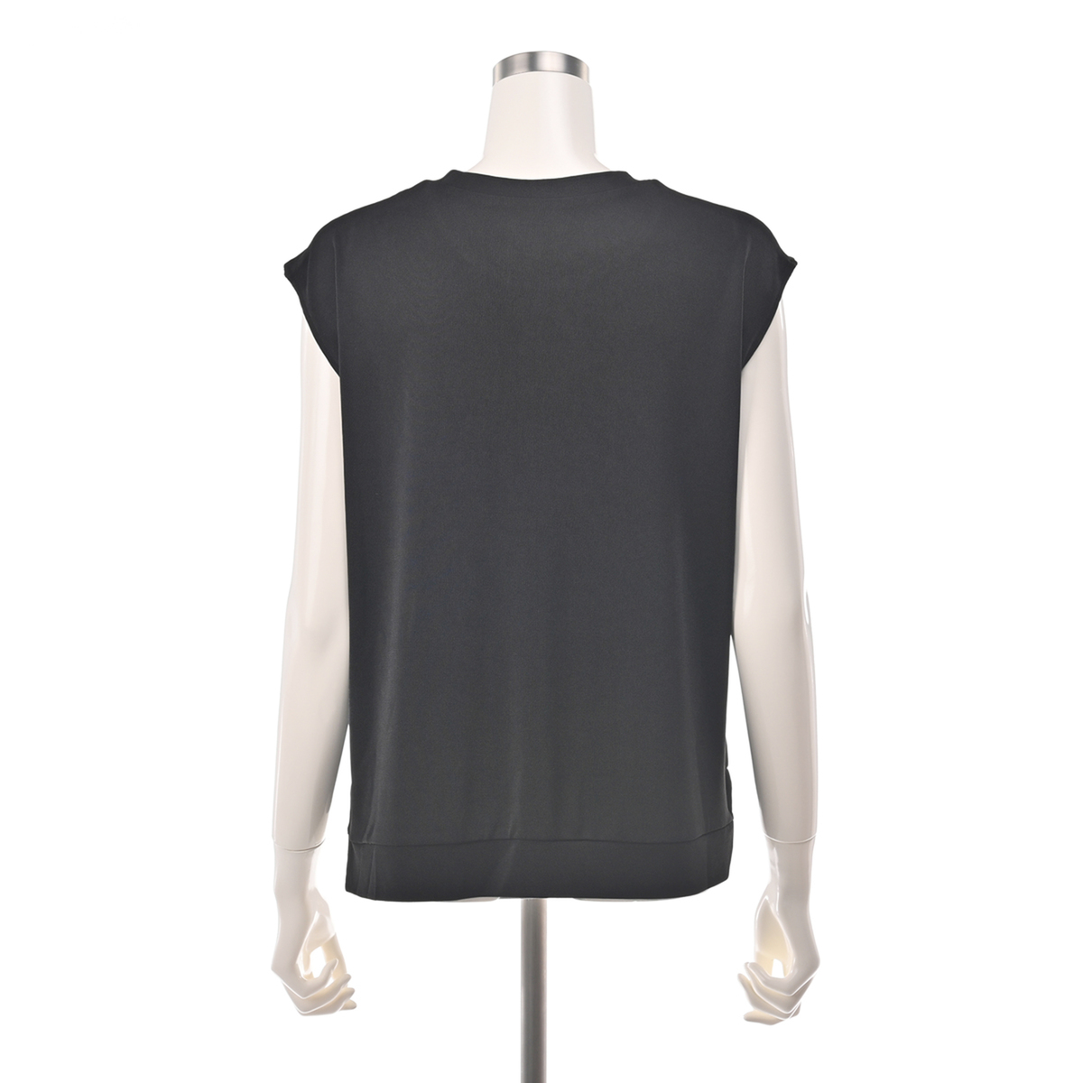 シンプルなラウンドネックで、ノースリーブの脇にスリットを入れたデザイン。後ろ丈がやや長いので、気になる腰周りをも気になりにくいです