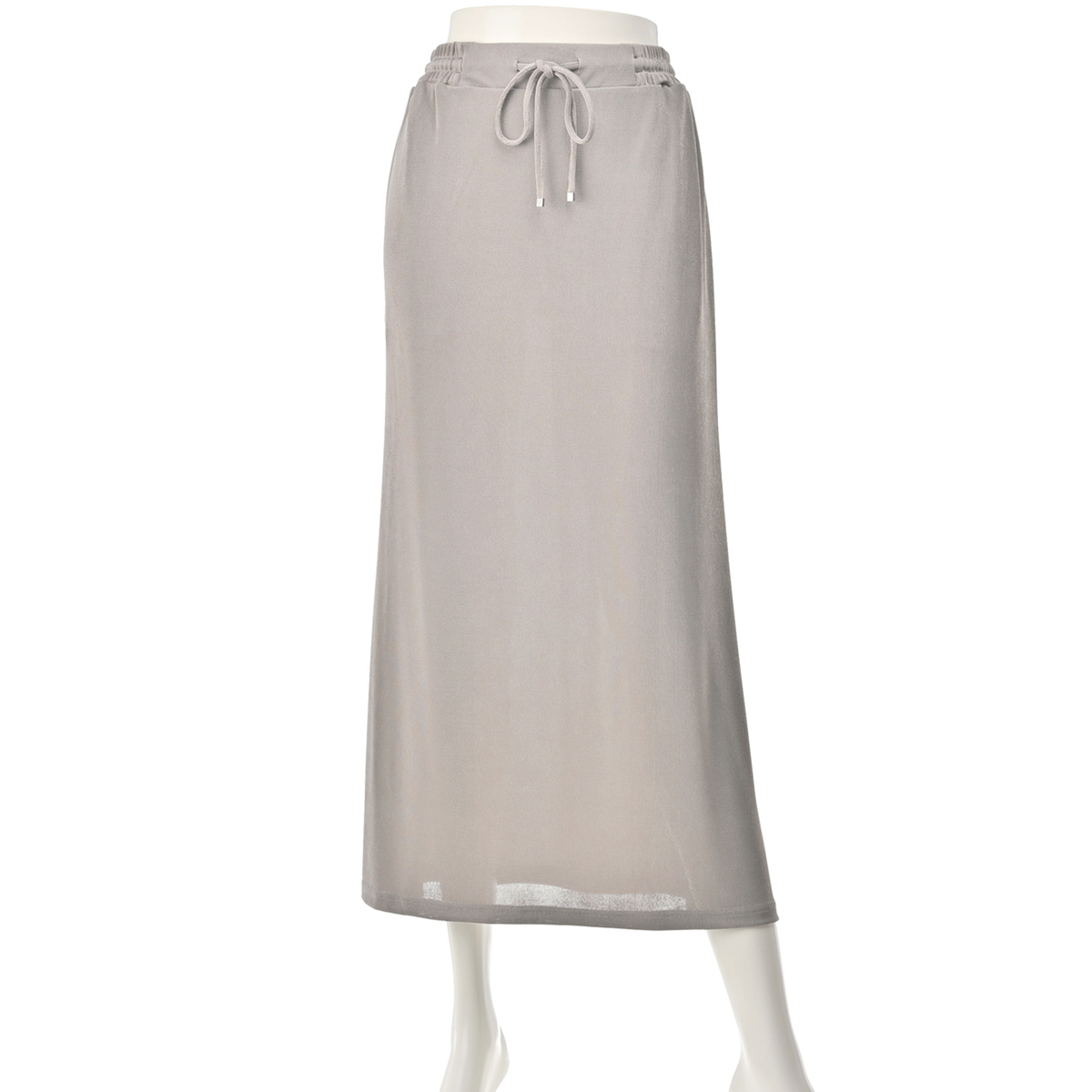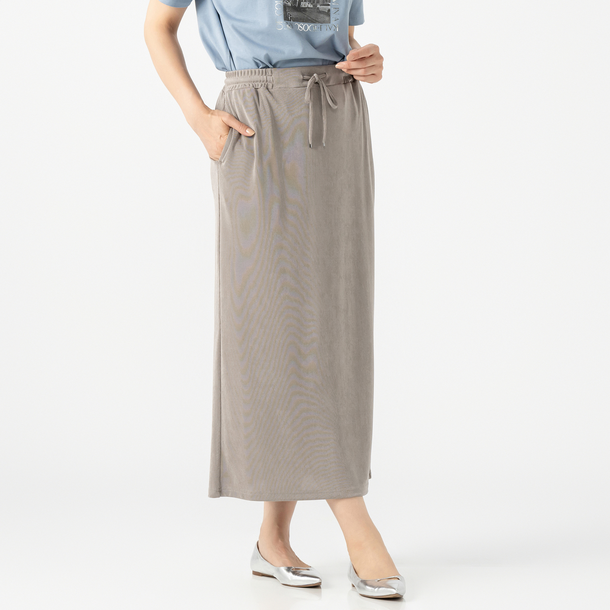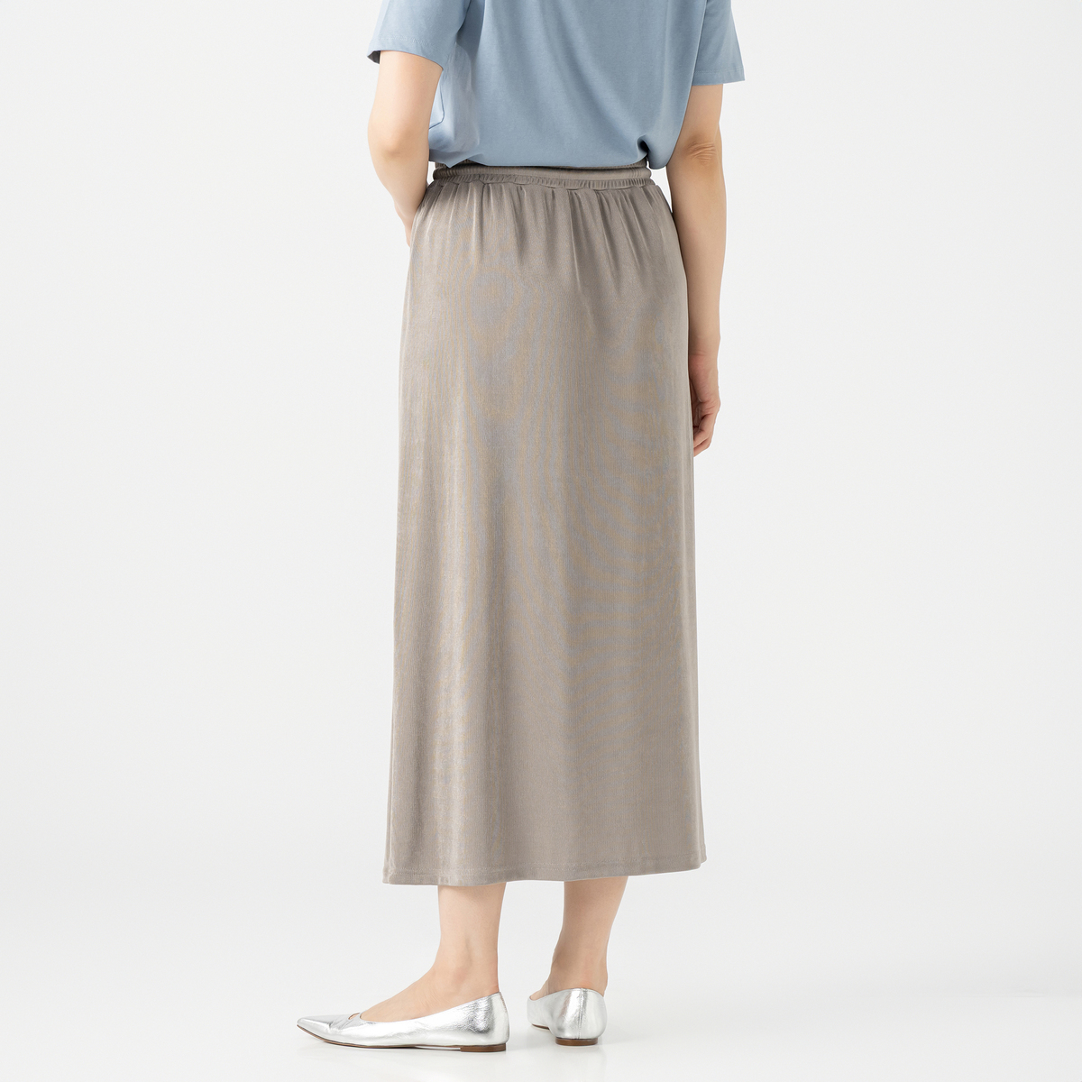 光沢感が上品なリブニット素材のスカート。良く伸びて柔らかく、弾力性のある落ち感がボディラインを綺麗にカバーします。接触冷感性によって暑い季節も快適で、通気性が良く、防しわ性試験(リンクル法)4級の着用時にしわになりにくい素材を使用しています