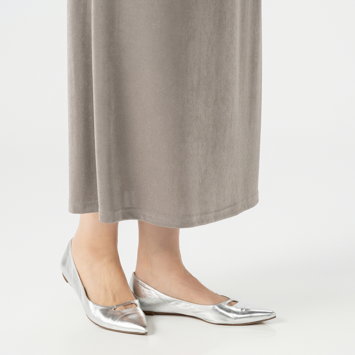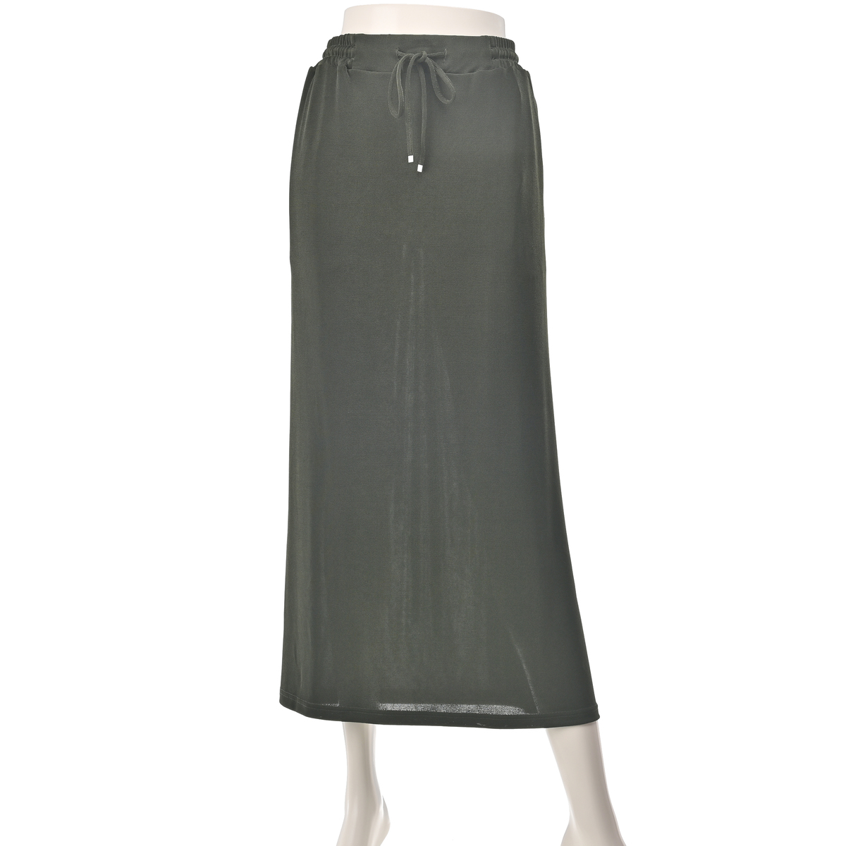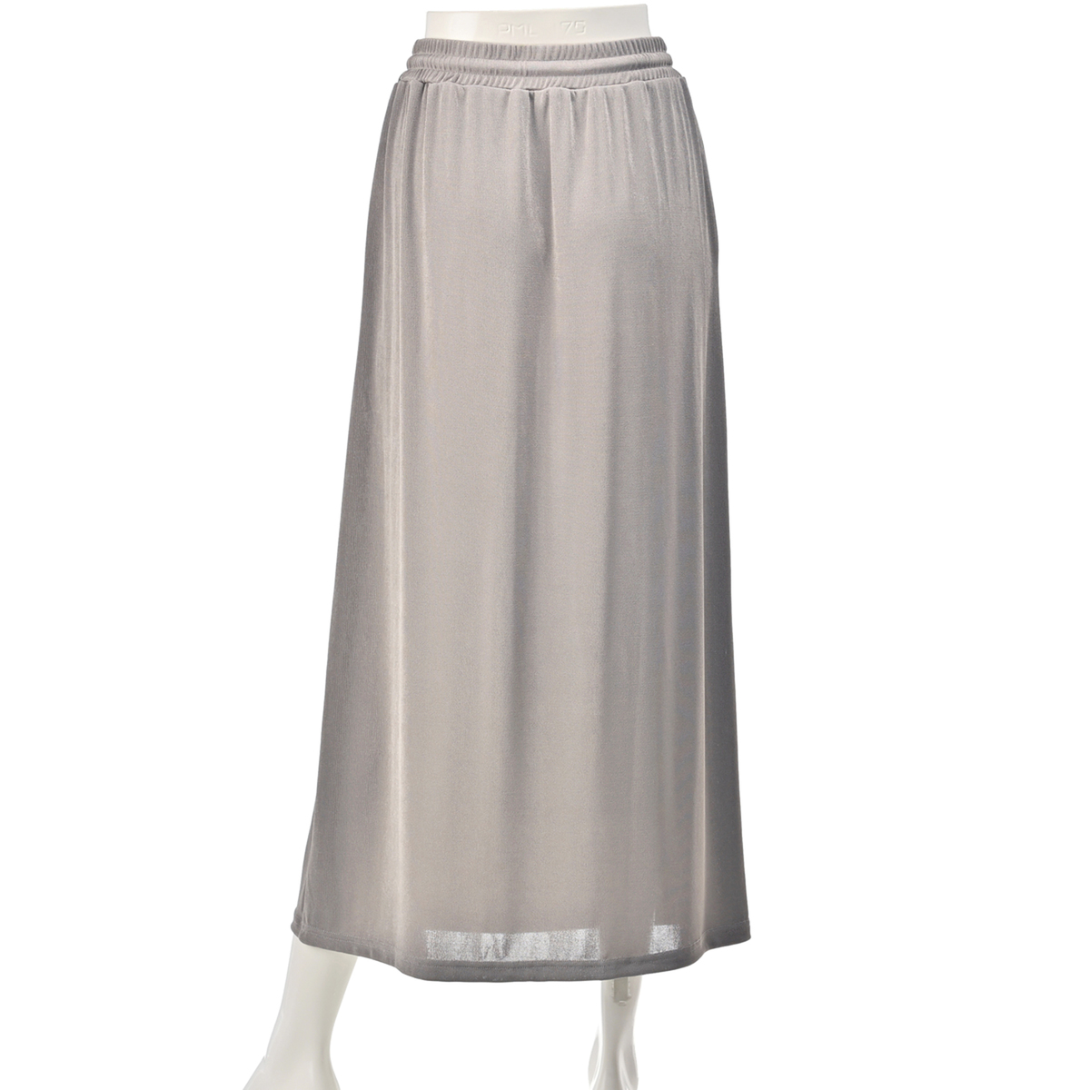 光沢感が上品なリブニット素材のスカート。良く伸びて柔らかく、弾力性のある落ち感がボディラインを綺麗にカバーします。接触冷感性によって暑い季節も快適で、通気性が良く、防しわ性試験(リンクル法)4級の着用時にしわになりにくい素材を使用しています