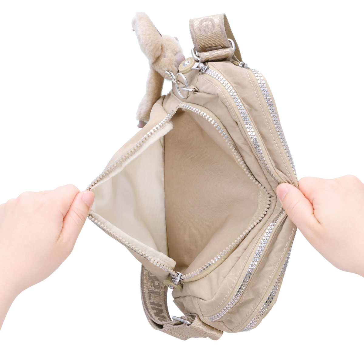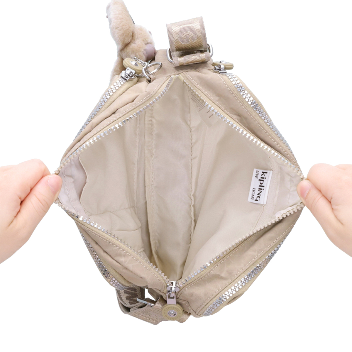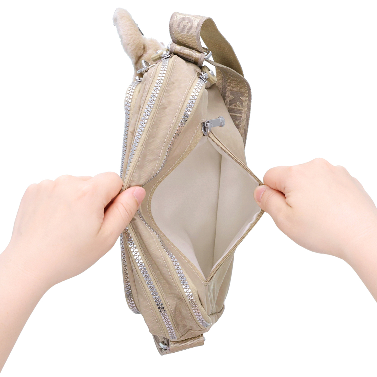 グロリアスベージュの表地には40%、グロリアスゴールド、グロリアスシルバーの表地には56%のリサイクルナイロンを使用。全カラーの裏地には100%のリサイクルポリエステルを使用。商品にはリサイクル素材を表すグリーンの下げ札付きで、環境に配慮したブランドの姿勢を表現しています