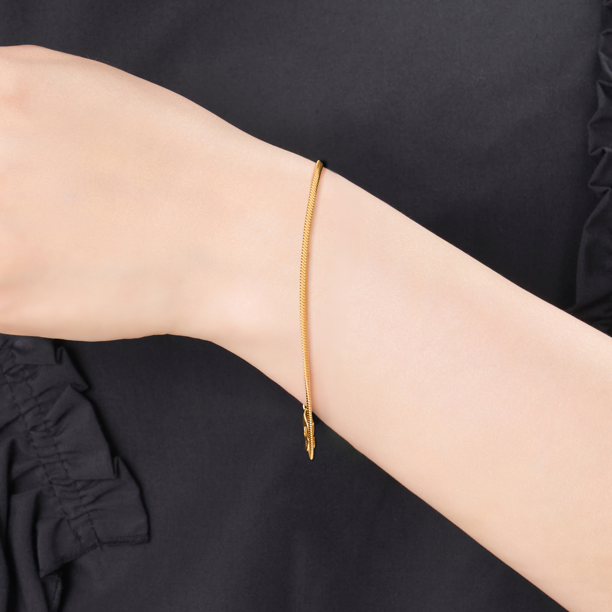 滑らかな艶感でお手元を優美に彩るチェーンブレスレット。肌に沿うような程よい太さのスネークチェーンが多方面に光を反射して美しく輝き、装いに華やぎを演出。つるんとした質感としなやかさな着け心地をお楽しみください