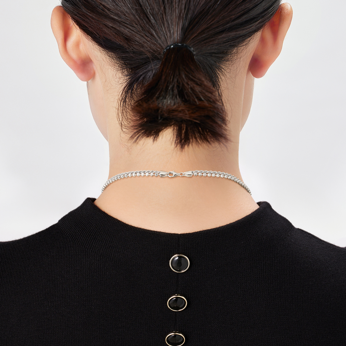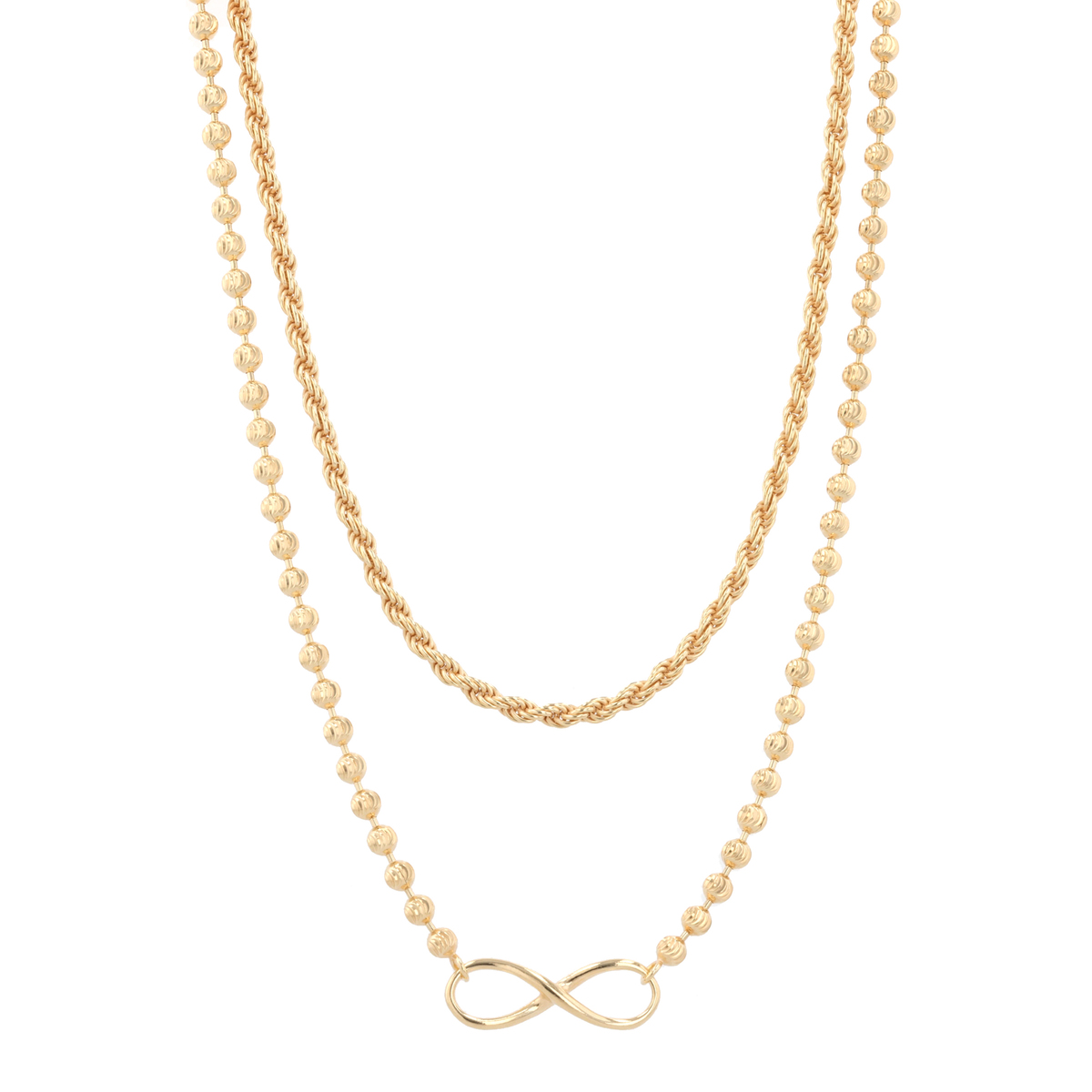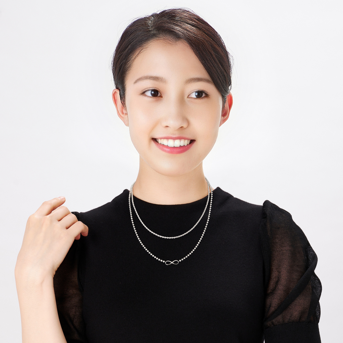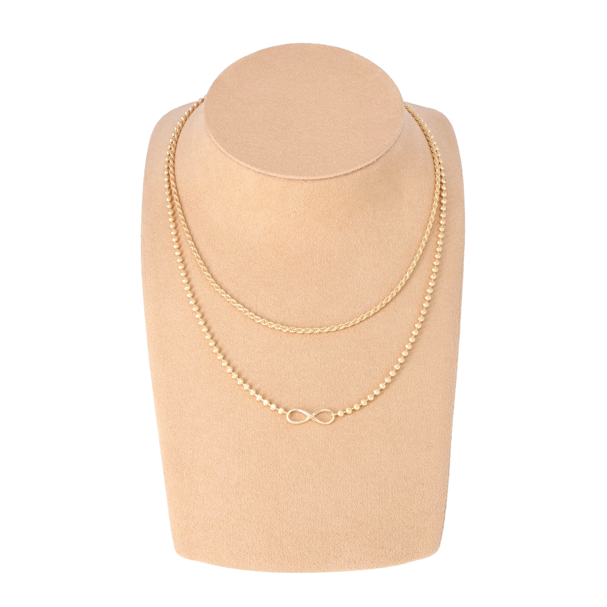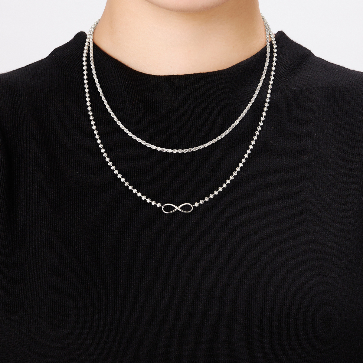 ロープチェーンとカットボールチェーンを重ねた2連ネックレスです。シンプルながらも目を引くデザインで、インフィニティモチーフがさりげなく存在感を放ちます