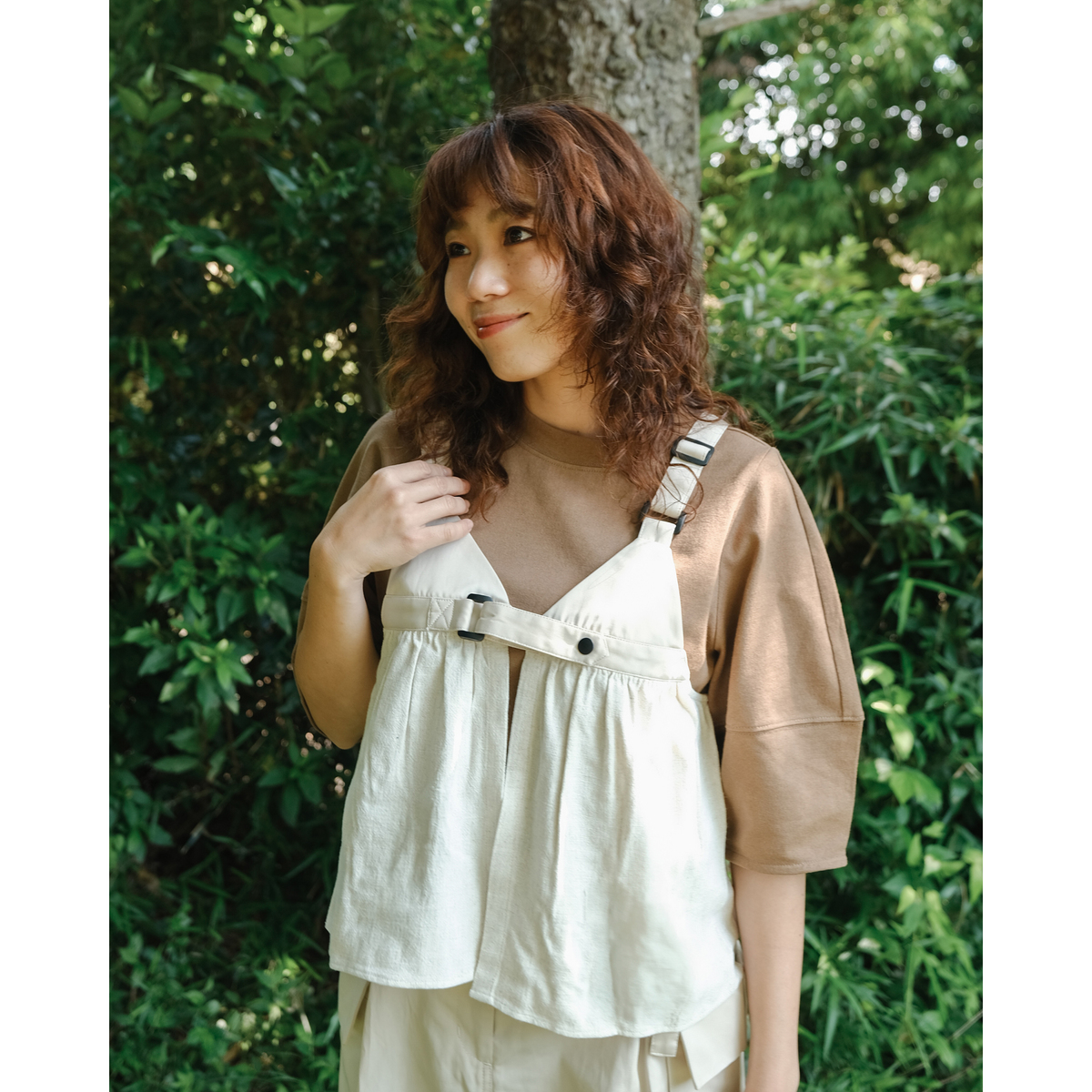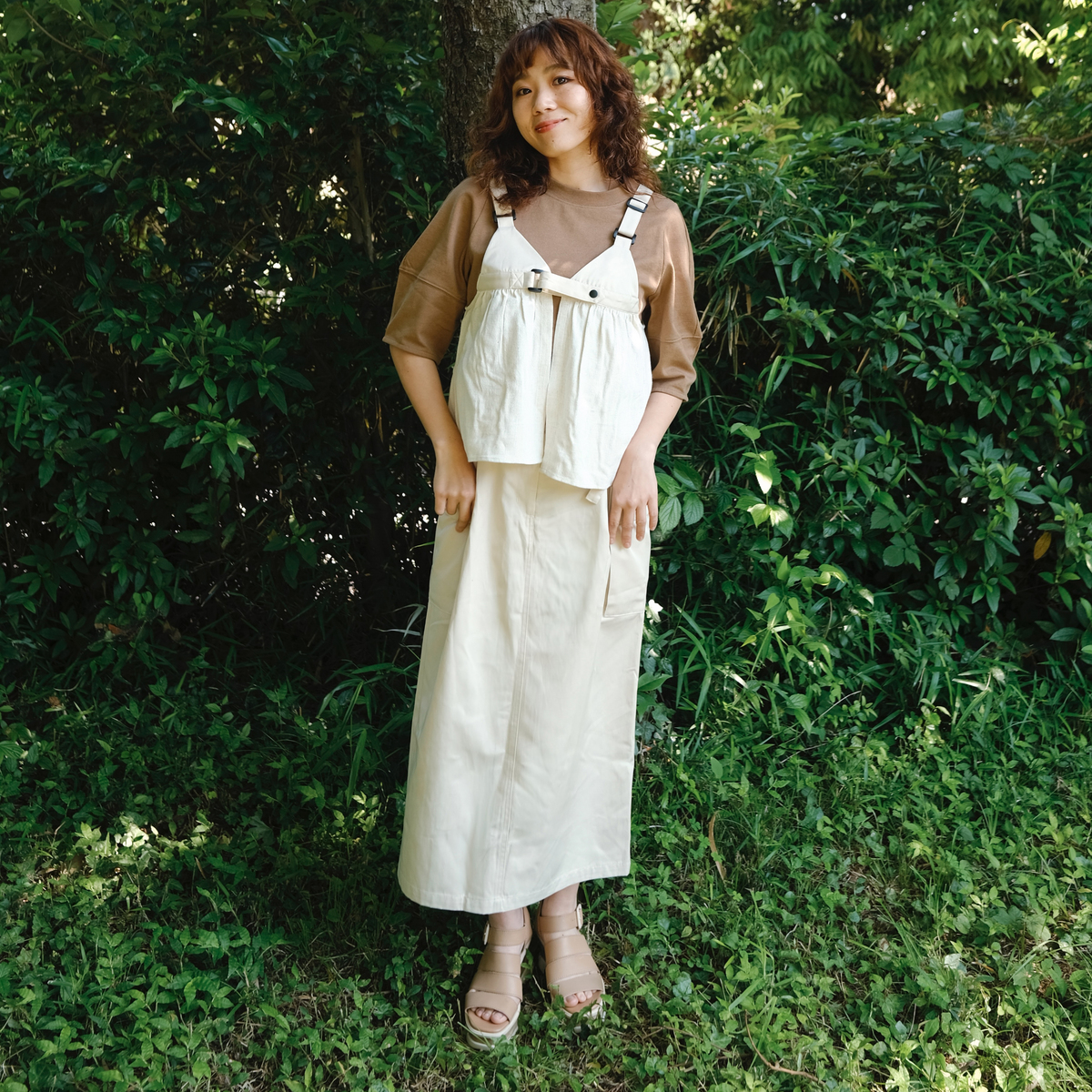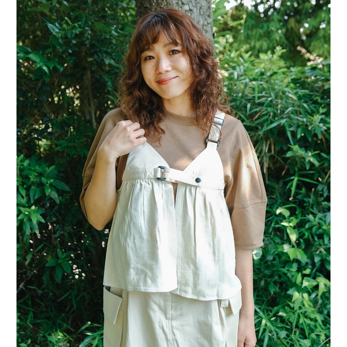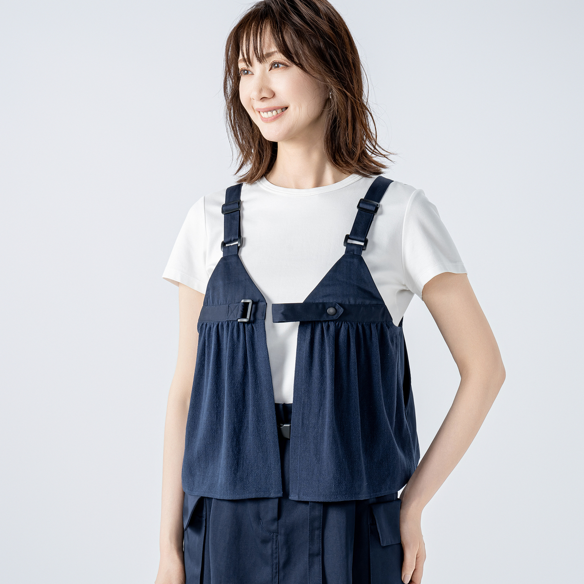前身頃のストラップやその下の切替えギャザーがアクセントになり、シンプルな装いも印象的に。ジーンズやパラシュートパンツ、共布スカートとのセットアップもおすすめです