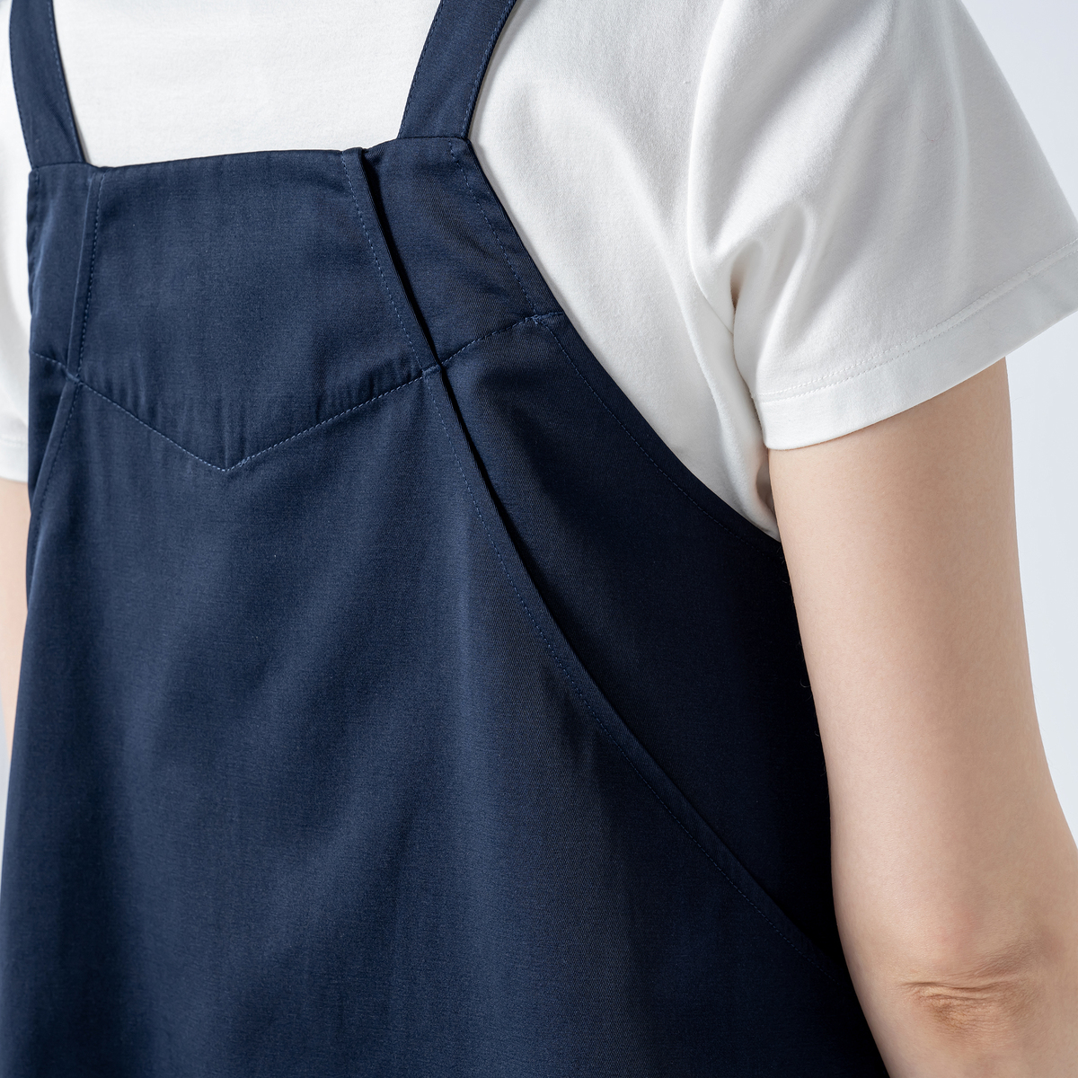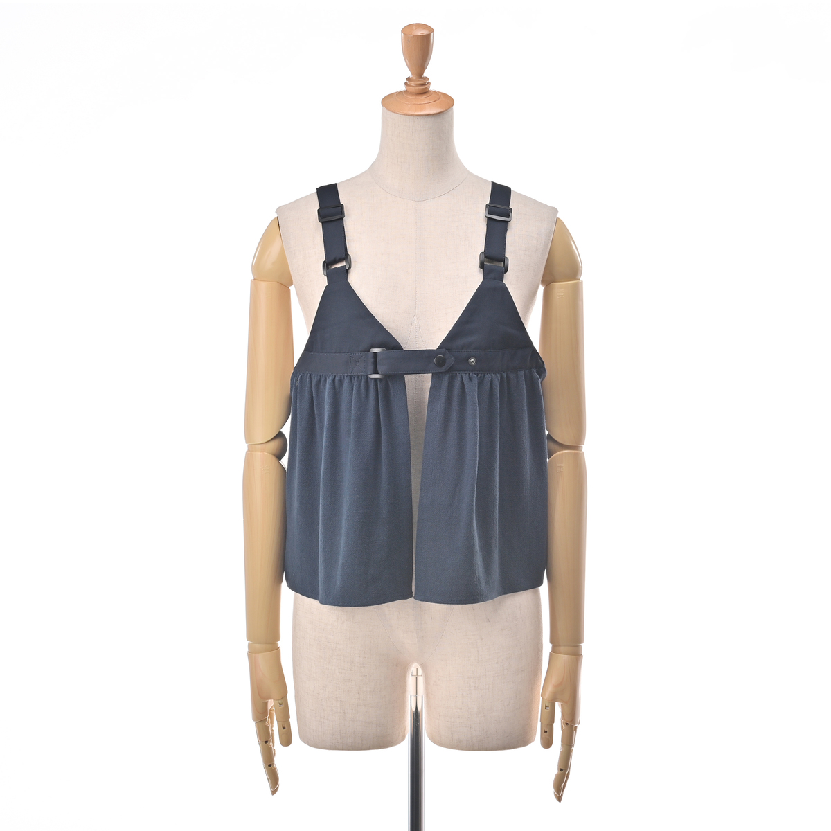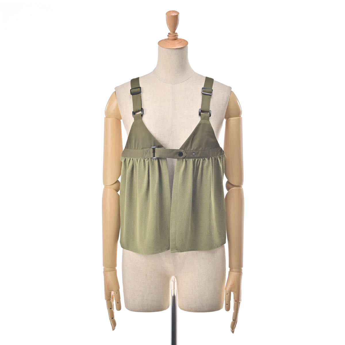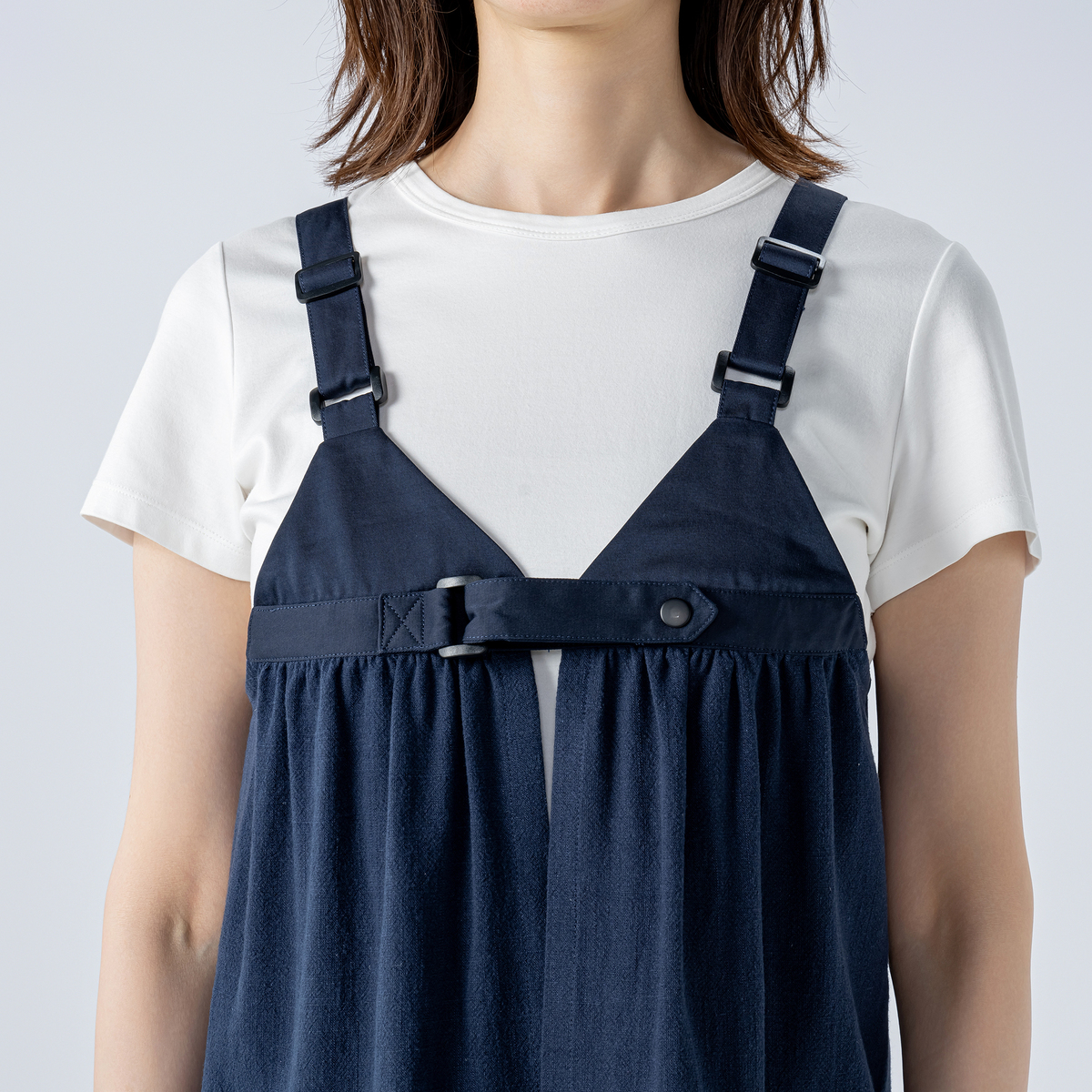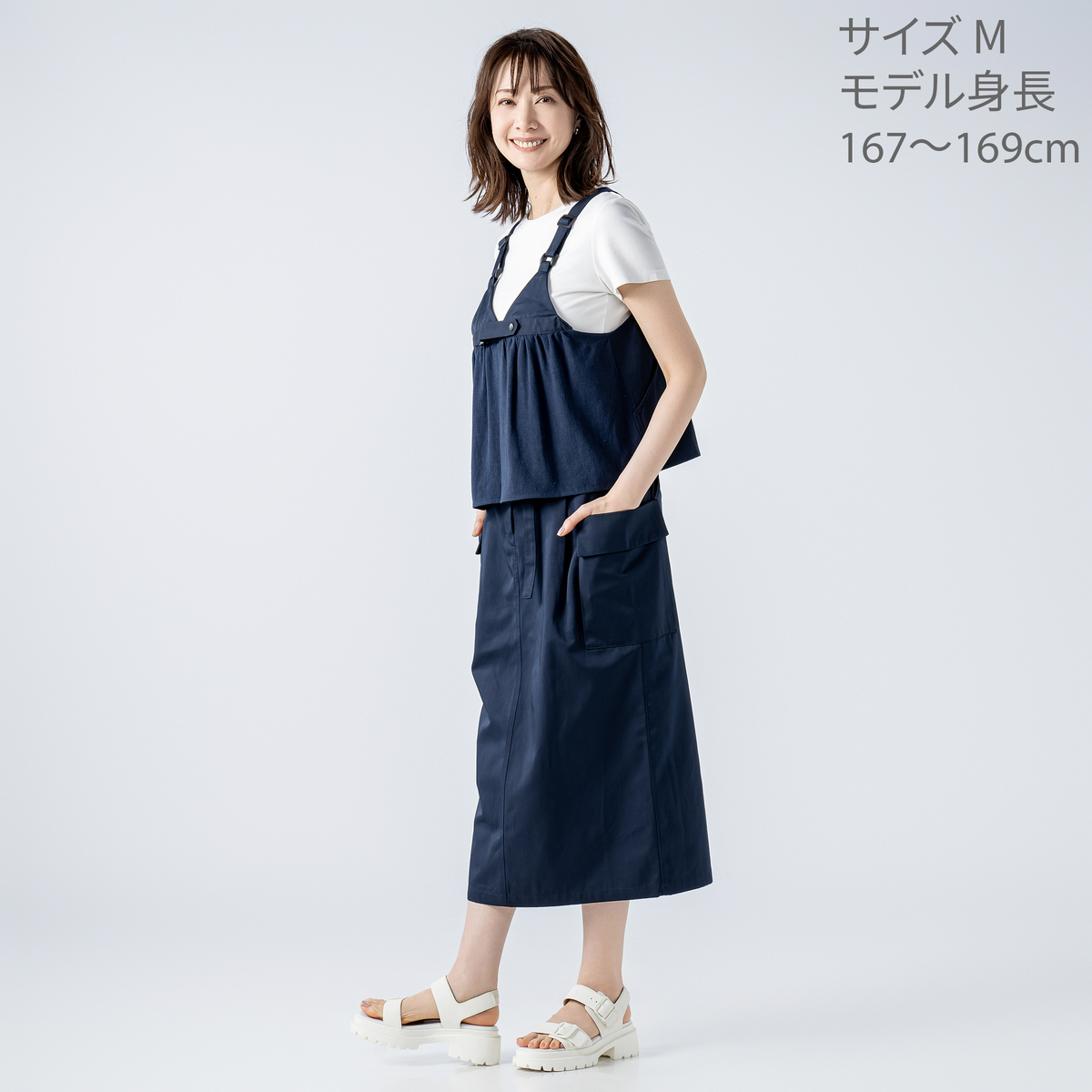 前身頃のストラップやその下の切替えギャザーがアクセントになり、シンプルな装いも印象的に。ジーンズやパラシュートパンツ、共布スカートとのセットアップもおすすめです