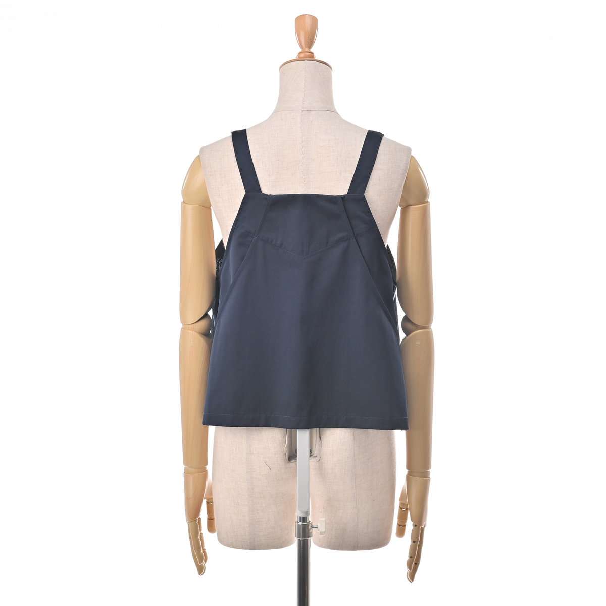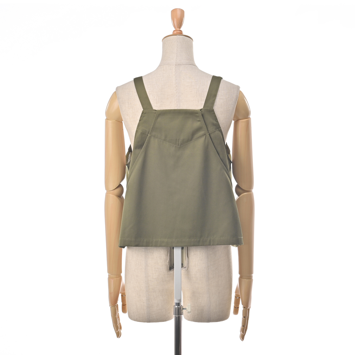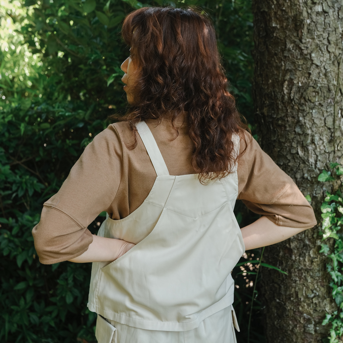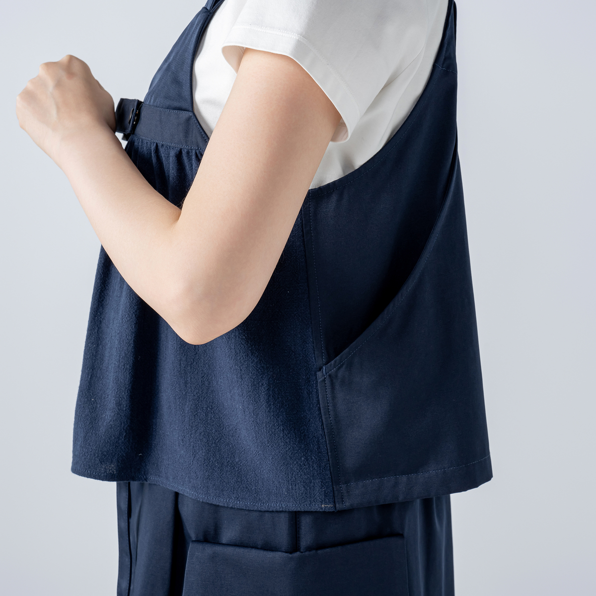ポリエステルとコットンのツイル素材と前身頃にふんわりとした麻・レーヨン混素材を組み合わせたベスト。後ろ身頃に大きなバッグポケット付きで、さまざまなアイテムをまとめて持ち運べるのも便利です