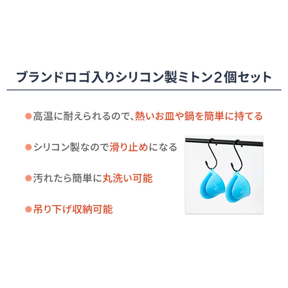 クックズエッセンシャルのロゴが入ったシリコンミトン。キッチンのいろいろな場所に吊り下げられる穴があり、丸洗いできる仕様です