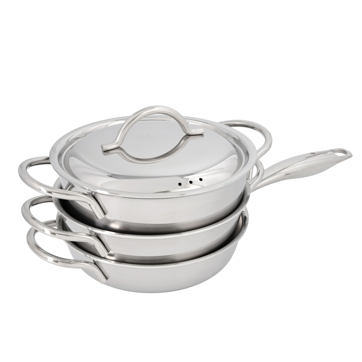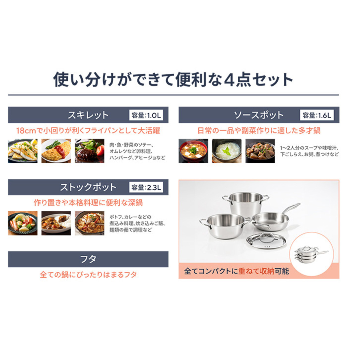 複数の金属層を重ねる技術により良質な性能を発揮する、5層ステンレススチール製の鍋やフライパン。電気、ガス、ガラス、IHなどあらゆるキッチン設備で使えて、コンロやオーブンまで使用可能。内径18cm、深さ4.5cmのフライパン、7.5cm/11cmの両手鍋にステンレスフタも含めたお買い得な4点セットで、本格的な鍋料理が作れます