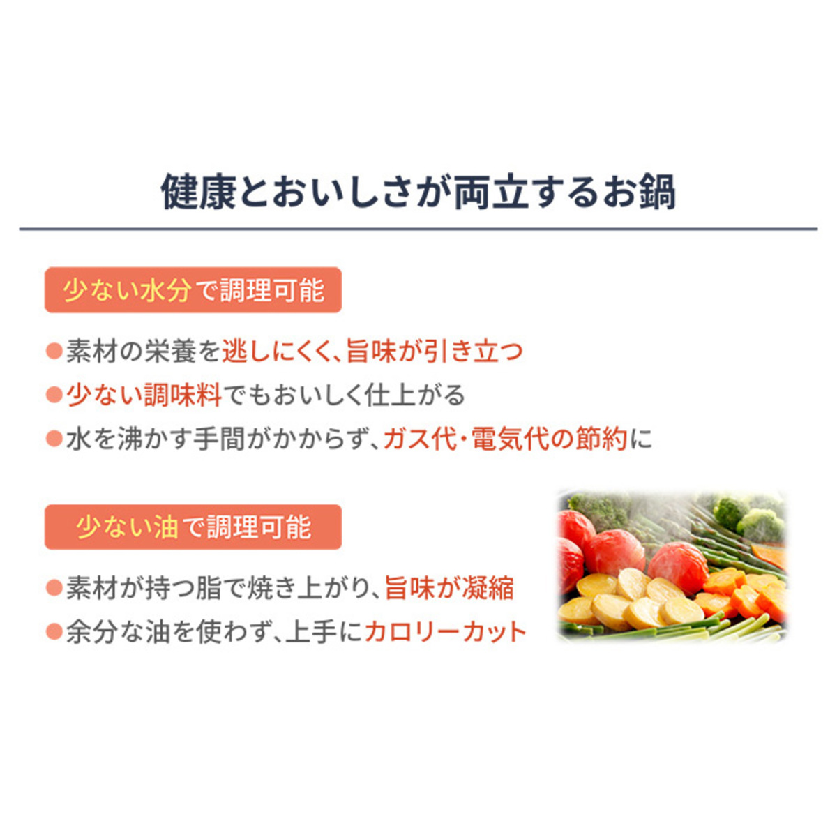 ゆでる・焼く・炊く・揚げる・煮る・余熱調理ができ、色々なお料理で活躍。少量の油での揚げ物も可能で、本体とフタがピタッと合い、熱や水分が外へ逃げにくく、少ない水分、油分で調理できます