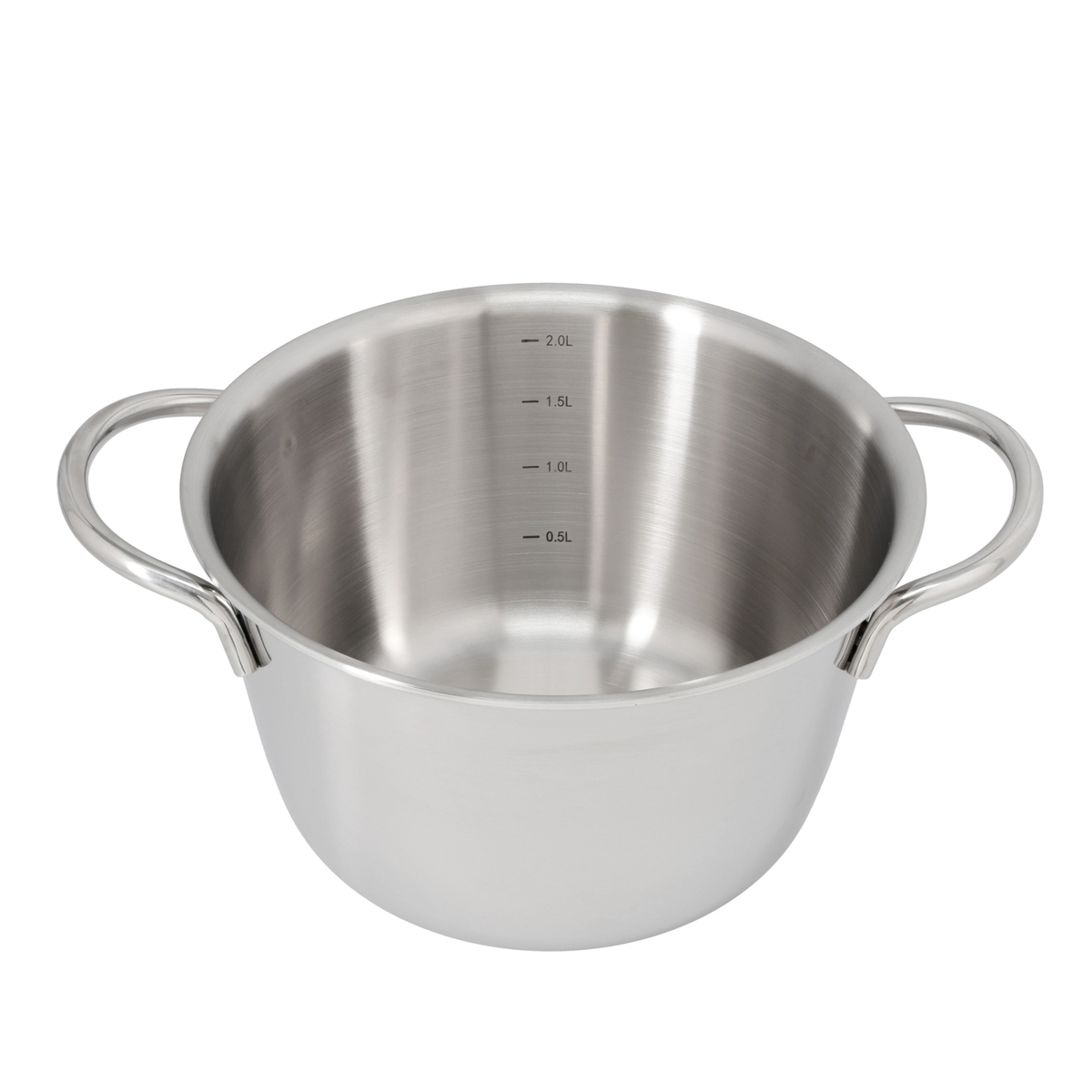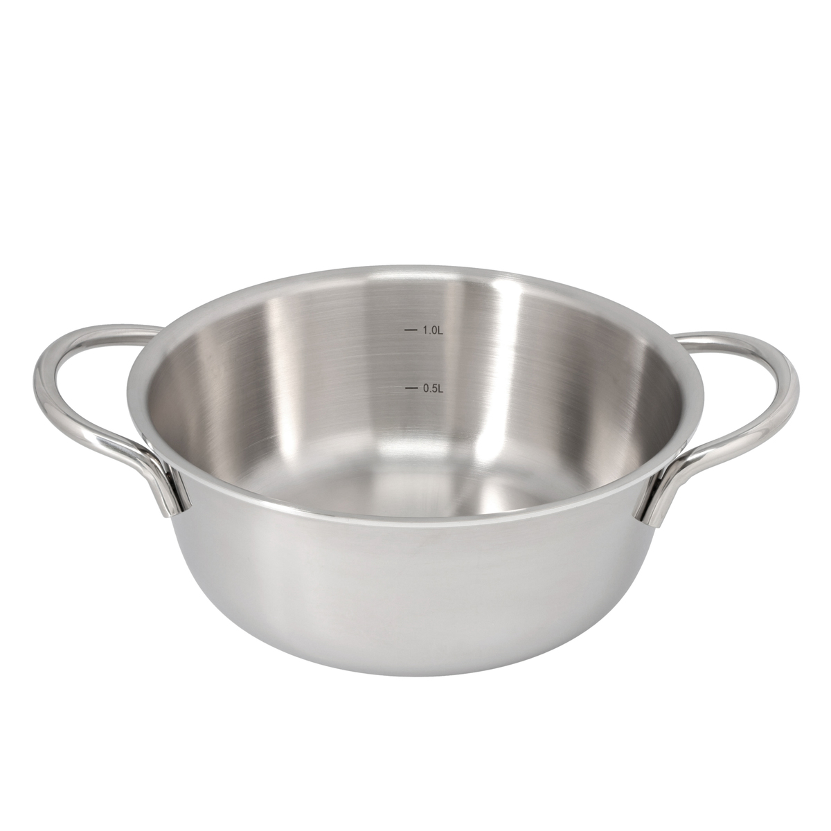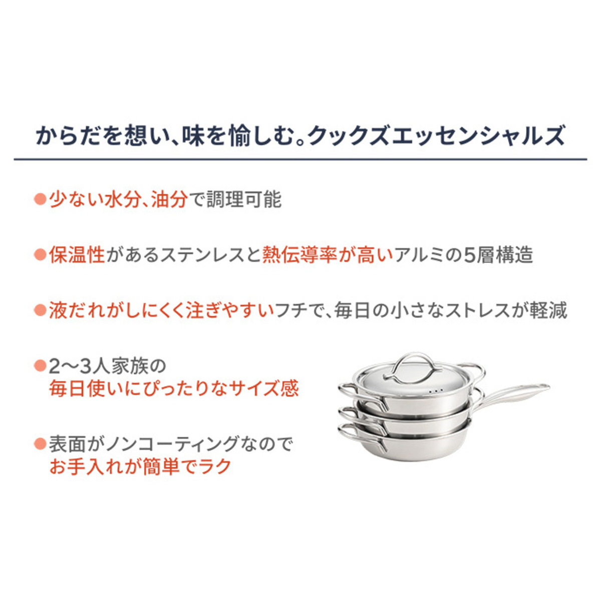 [商品内容] ・18cmスキレット ・1.6L ソースポット ・2.3L ストックポット ・フタ <18cmスキレット> [サイズ] 縦19.5×横39.5(ハンドル含む)×高7.5 cm [重量] 730g [容量] 1.0L <1.6L ソースポット> [サイズ] 縦19.5×横25×高8 cm [重量] 850g [容量] 1.6L <2.3L ストックポット> [サイズ] 縦19.5×横25×高12 cm [重量] 970g [容量] 2.3L <フタ> [サイズ] 縦19.5×横19.5×高5 cm [重量]250g [材質] 表面加工:なし 本体:ステンレス鋼(クロム18%)、アルミニウム フタ:ステンレス鋼(クロム18%、ニッケル8%) はり底:ステンレス鋼(クロム18%)、アルミニウム (底の厚さ:約2.5 mm(はり底含む)) ハンドル・取っ手:ステンレス鋼(クロム16%、ニッケル3.5%、マンガン5.5%) ■IH200V迄・電気調理器 対応可 【中国製】 [注意事項] ※使用可:漂白剤、食器洗い機、オーブンレンジ ※使用不可:取っ手取外し、電子レンジ <初めて使用する時は> ※各部に破損や変形等、異常がないことを確認してください。異常が見られた場合は使用しないでください ※スポンジに食器用洗剤をつけてよく洗ってから使用してください <取扱い上の注意> ※本品はご家庭での使用を目的としています。屋外での使用、また商業的利用は想定していません ※本品は玩具ではありません。お子様に本品で遊ばせないでください ※必要以上に本品を加熱しないでください。また空だきしないでください ※熱した本品に直接水などをかけて急冷しないでください。変形の原因になります ※本品に衝撃を与えないでください。傷がつくような取扱いは避けてください ※暖房器具の上で使用しないでください ※本品を電子レンジに入れないでください。火花が飛び、本品や電子レンジが損傷する恐れがあります ※オーブンで調理する場合は、事前に本品がオーブンの内寸に収まることを確認してください ※フタを本品からずらして使用しないでください。蓋が滑り落ちる恐れがあります。また、部分的に加熱された箇所に触れることにより火傷を負う恐れがあります ※調理後、本品の中に食材を保存しないでください ※食器洗浄機はご使用可能ですが、手洗いをお勧めします ※研磨剤入りの洗剤や金属たわし等を使用して洗わないでください。表面に傷が付く恐れがあります ※洗った後は水分を拭き取り乾いた状態で保管してください ※子供の手の届かないところに保管してください ※廃棄する場合は、各自治体のルールに従って廃棄してください <調理中の注意> ※子供の火傷や火事等を避けるため、調理中は本品から決して離れないでください ※本品本体 並びに ハンドルや取っ手部分が熱くなりますので十分にご注意ください ※縁まで水などを満たした状態で使用しないでください ※弱火から中火を使用することをお勧めします ※ガスコンロをご使用の場合は、鍋底から炎がはみ出さないよう火力を調節してください ※炒め物の料理の際は、焦げつきを防ぐために少量の油をひいてからご使用ください ※金属製のへら等の使用は避けてください。本体表面に傷が付く恐れがあります ※汚れが本品表面にこびり付いた場合は、しばらくぬるま湯につけてから洗ってください ※汚れがひどい場合は、中性洗剤を混ぜたぬるま湯につけてから洗ってください。汚れが取れる場合があります