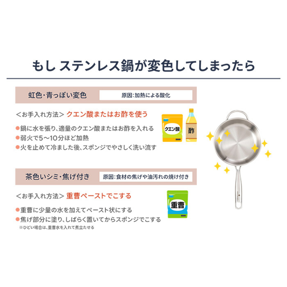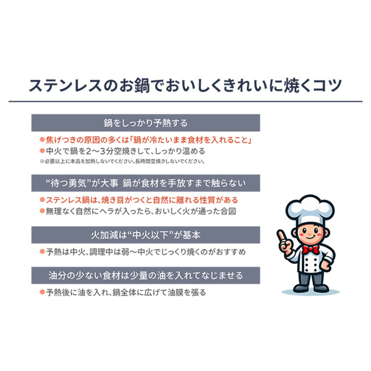 ステンレスは、重たいから熱伝導は凄くあります。早く調理が出来ます。後は水洗いで落ちます。しかし、フライパンが予想外に小さいです。試行錯誤して、楽しく使います。