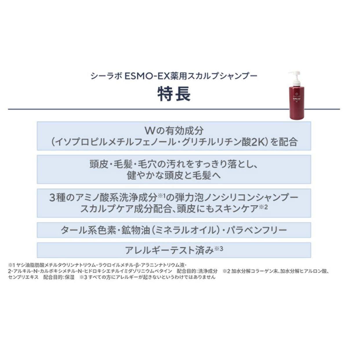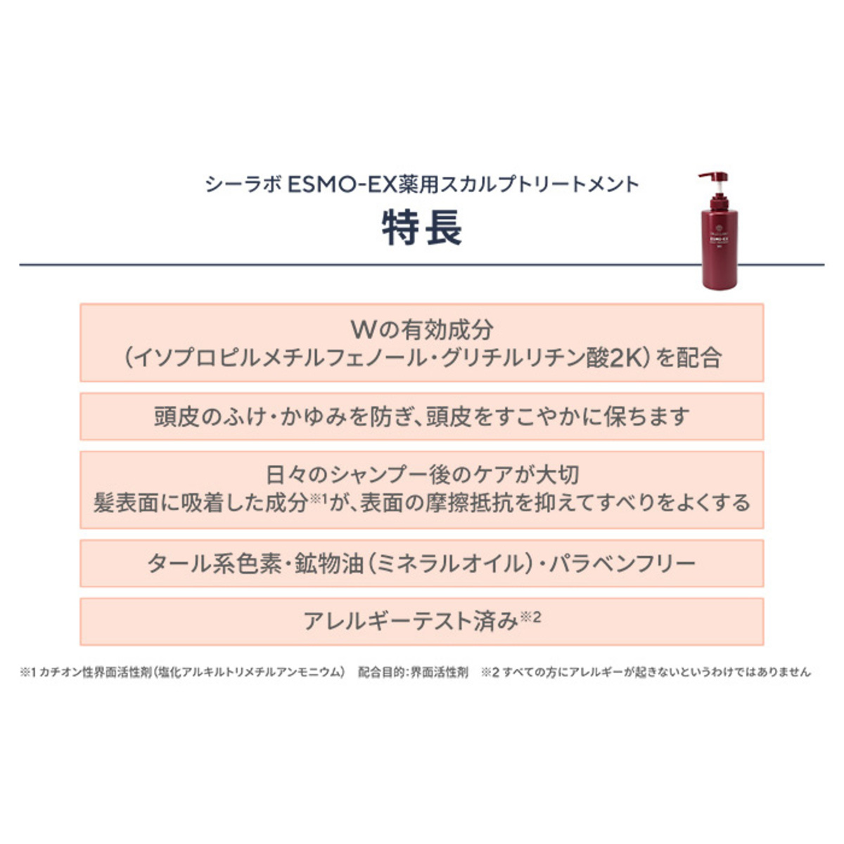 [商品内容] ・シーラボ薬用エスモEXスカルプシャンプー (医薬部外品)500mL ・シーラボ薬用エスモEXスカルプトリートメント(医薬部外品)500g [使用方法] <シャンプー> 髪と地肌を十分に濡らしてから適量を手に取り、泡立てます。髪全体にのばし頭皮をマッサージするように洗い、その後よくすすいでください <トリートメント> シャンプーの後に軽く水気をきってから適量を手に取り、毛先を中心に1分程度なじませます。その後よく洗い流してください [注意事項] ※頭皮に傷・はれもの・湿しん・かぶれ等のある場合には使用をおやめください ※使用中、または使用後に直射日光があたって頭皮に赤み・はれ・刺激等の異常があらわれた場合は、使用を中止し、皮膚科専門医等にご相談ください。そのまま使用を続けますと、症状を悪化させることがあります ※目に入ったときは、すぐに水で洗い流してください ※一度取り出した中身を再び容器の中に戻すことは絶対におやめください ※乳幼児の手の届かない所に保管し、極端に高温や低温・多湿な場所・直射日光の当たる場所には置かないでください ※天然由来原料使用のため、色調・香りに多少の違いが生じる場合がありますが、品質には問題はございません ■医薬部外品 <シーラボ薬用エスモEXスカルプシャンプー> ふけ・かゆみを防ぐ 毛髪・頭皮の汗臭を防ぐ 毛髪・頭皮を清浄にする 毛髪・頭皮をすこやかに保つ <シーラボ薬用エスモEXスカルプトリートメント> ふけ・かゆみを防ぐ 毛髪・頭皮の汗臭を防ぐ 毛髪の水分・脂肪を補い保つ 裂毛・切毛・枝毛を防ぐ 毛髪・頭皮をすこやかに保つ 【日本製】 [成分] <シーラボ薬用エスモEXスカルプシャンプー> 有効成分:イソプロピルメチルフェノール、グリチルリチン酸2K その他の成分:水、ヤシ油脂肪酸メチルタウリンナトリウム、ラウロイルメチル-β-アラニンナトリウム液、ヤシ油脂肪酸アミドプロピルベタイン液、2-アルキル-N-カルボキシメチル-N-ヒドロキシエチルイミダゾリニウムベタイン、ヤシ油脂肪酸N-メチルエタノールアミド、ペンチレングリコール、 ポリオキシエチレンセトステアリルヒドロキシミリスチレンエーテル、加水分解コラーゲン末、加水分解ヒアルロン酸、センブリエキス、アルギニン、安息香酸Na、塩化O-[2-ヒドロキシ-3-(トリメチルアンモニオ)プロピル]ヒドロキシエチルセルロース、クエン酸、グリセリル-N-(2-メタクリロイルオキシエチル)カルバメート・メタクリル酸ステアリル共重合体、グリセリンエチルヘキシルエーテル、香料、濃グリセリン、BG、ビタミンE、フェノキシエタノール、モノステアリン酸ポリオキシエチレンソルビタン <シーラボ薬用エスモEXスカルプトリートメント> 有効成分: イソプロピルメチルフェノール、グリチルリチン酸2K その他の成分: 水、硬化ナタネ油アルコール、濃グリセリン、メチルポリシロキサン、塩化アルキルトリメチルアンモニウム、加水分解コラーゲン末、ヒアルロン酸ヒドロキシプロピルトリモニウム、シア脂、部分水素添加ホホバ油、クエン酸、クエン酸Na、 グリセリル-N-(2-メタクリロイルオキシエチル)カルバメート・メタクリル酸ステアリル共重合体、グリセリンエチルヘキシルエーテル、高重合メチルポリシロキサン(1)、香料、BG、天然ビタミンE、ビタミンE、フェノキシエタノール、モノステアリン酸ポリエチレングリコール