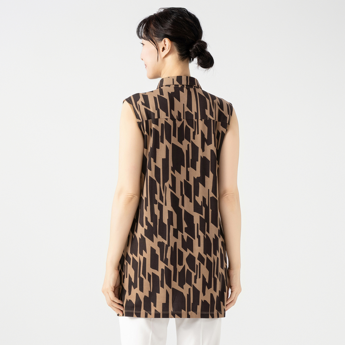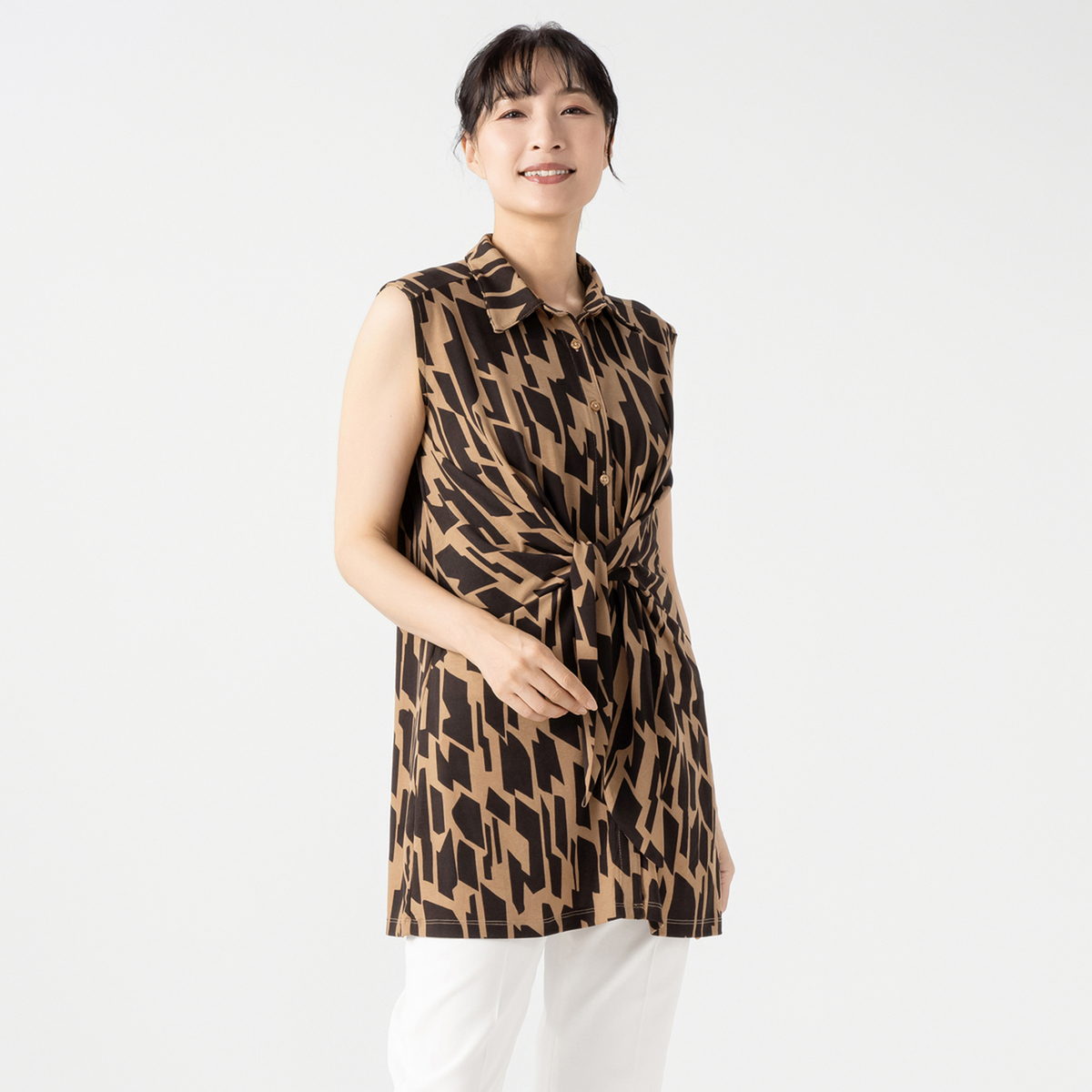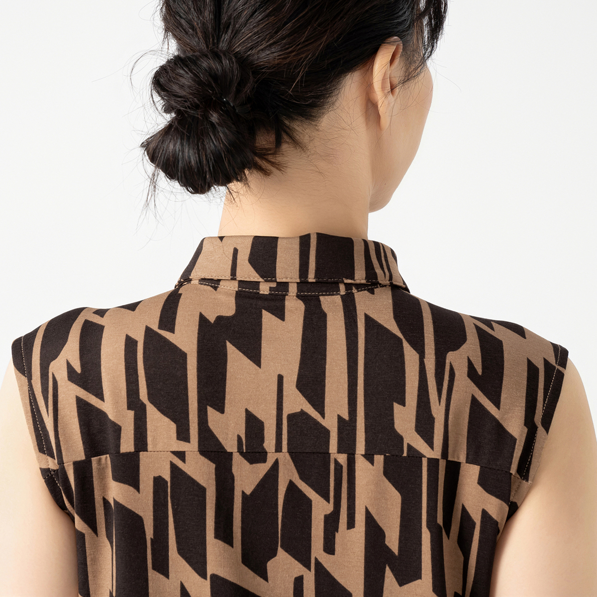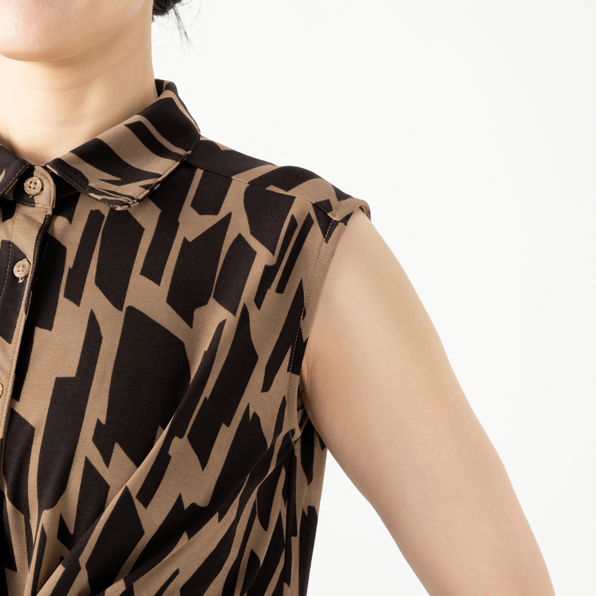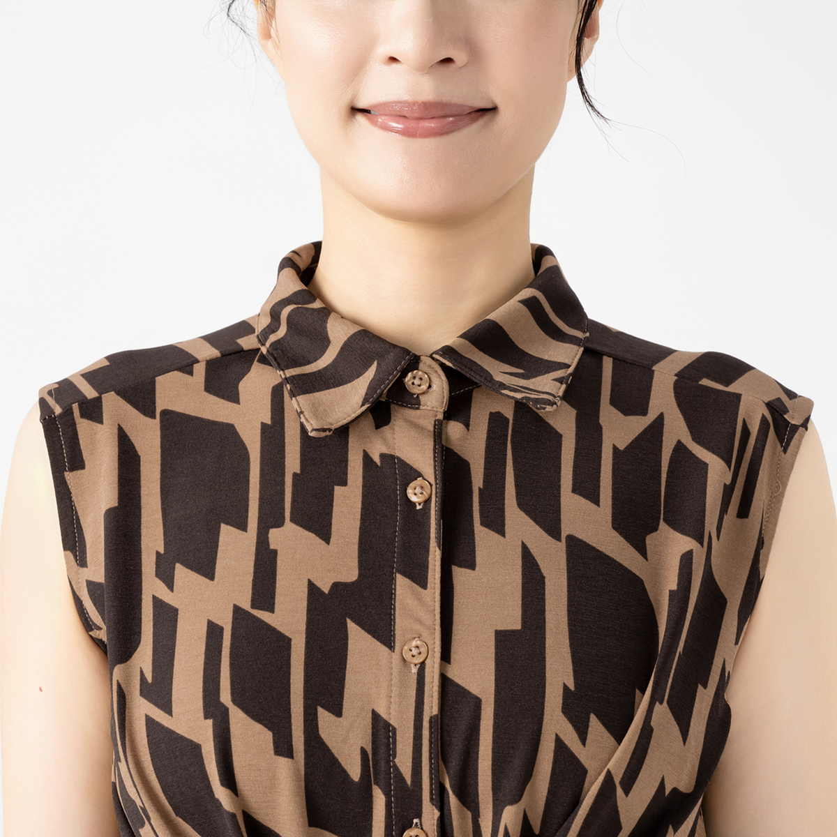 バスト周りから裾に向かって緩やかにゆとりが入ったAラインシルエット。長め丈が気になるヒップ周りもすっぽりカバー。シャツカラーの衿元できちんと感もありつつ、ジャージー素材で楽な着心地です。ノースリーブでも肩先まで肩幅を取った作りなので肌見えしすぎず、アームホールも余分に広すぎない作りです