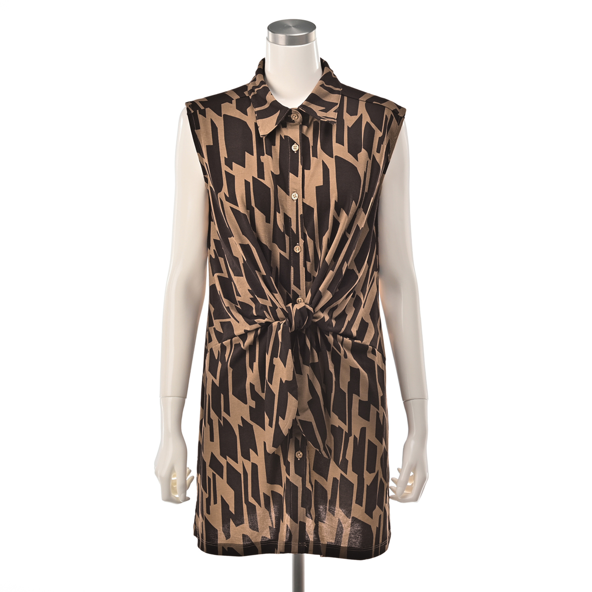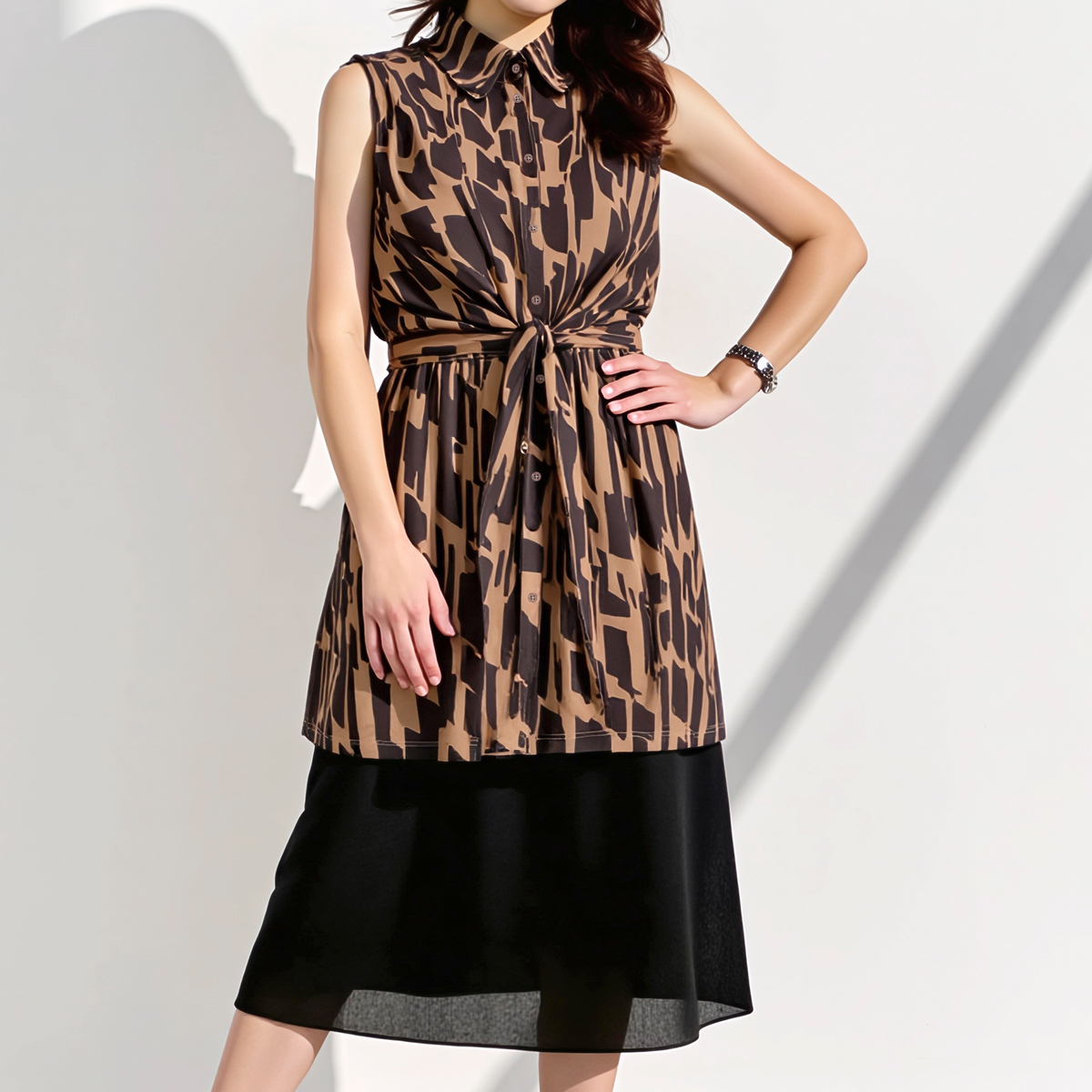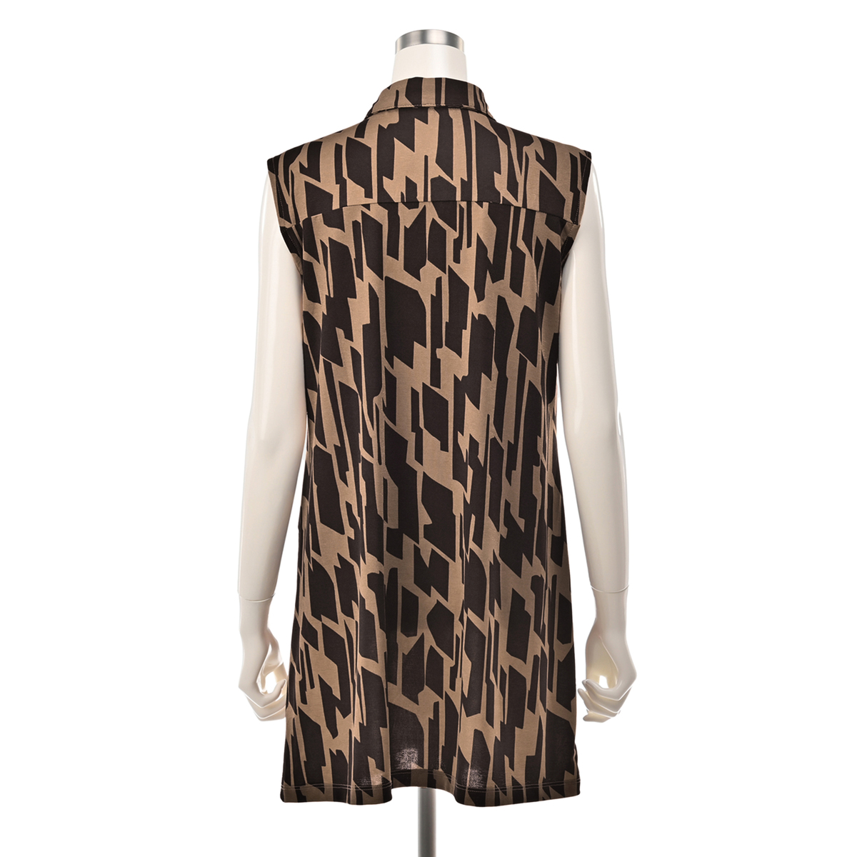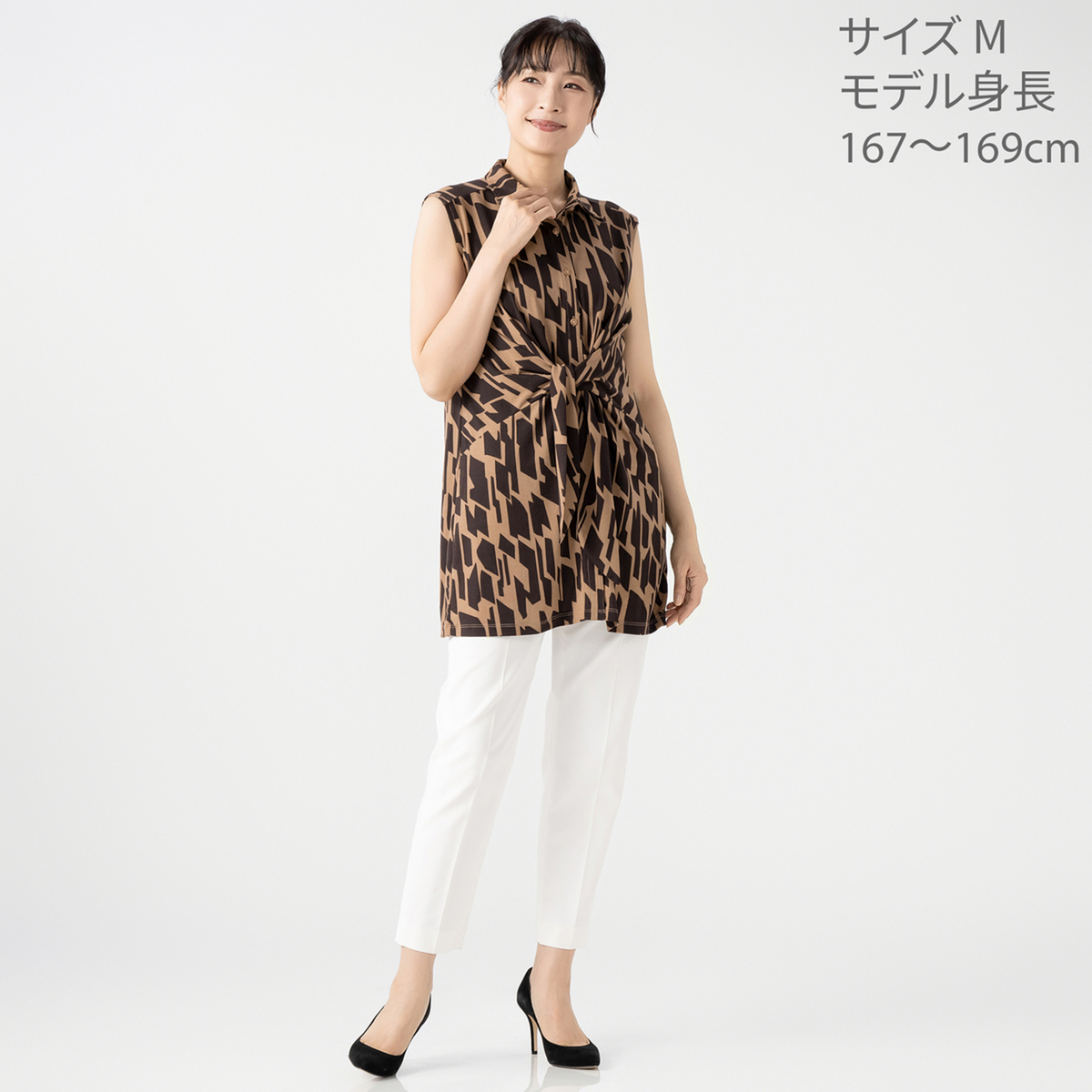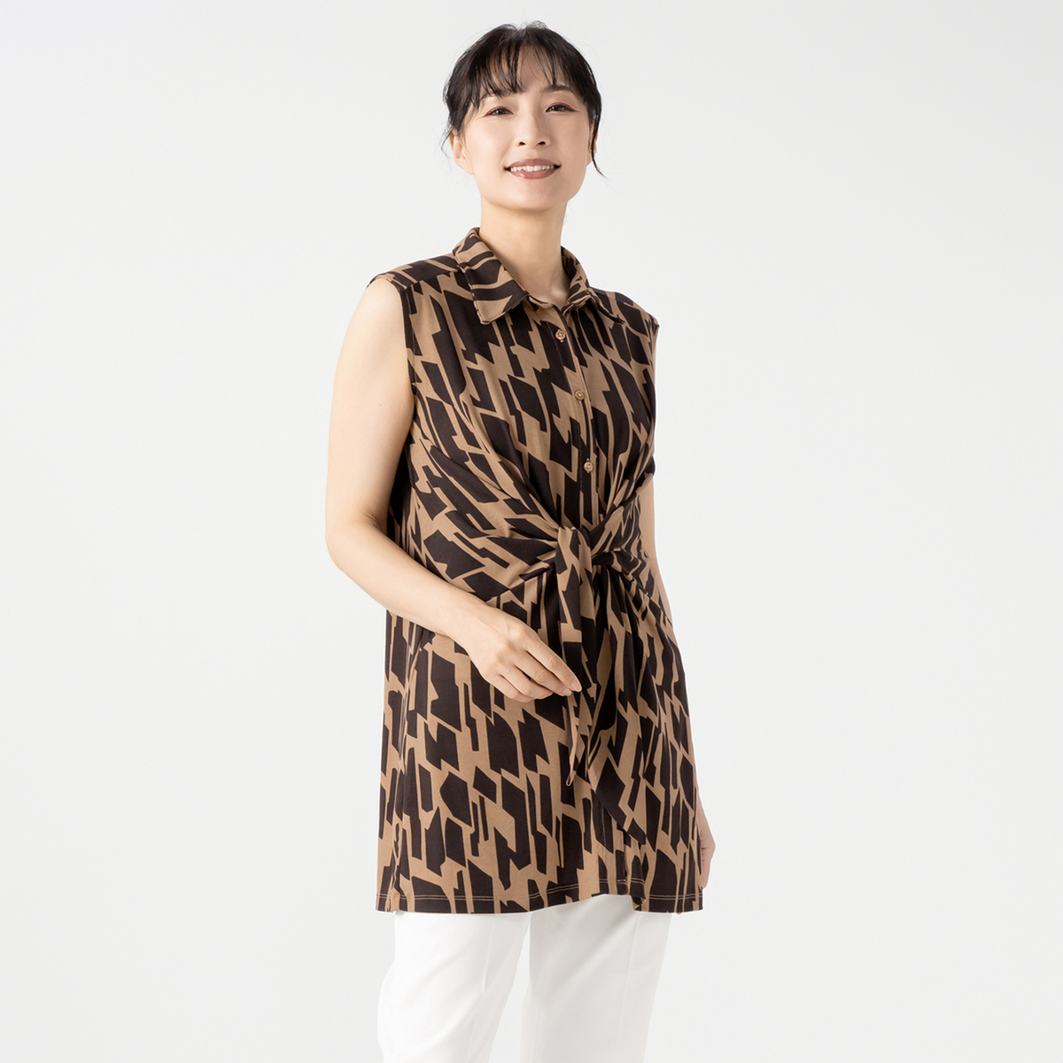 バスト周りから裾に向かって緩やかにゆとりが入ったAラインシルエット。長め丈が気になるヒップ周りもすっぽりカバー。シャツカラーの衿元できちんと感もありつつ、ジャージー素材で楽な着心地です。ノースリーブでも肩先まで肩幅を取った作りなので肌見えしすぎず、アームホールも余分に広すぎない作りです
