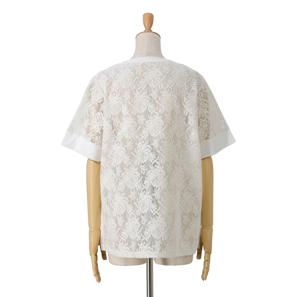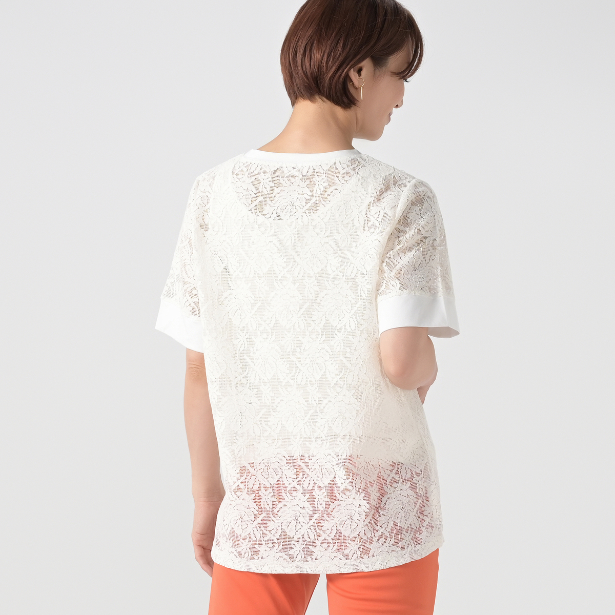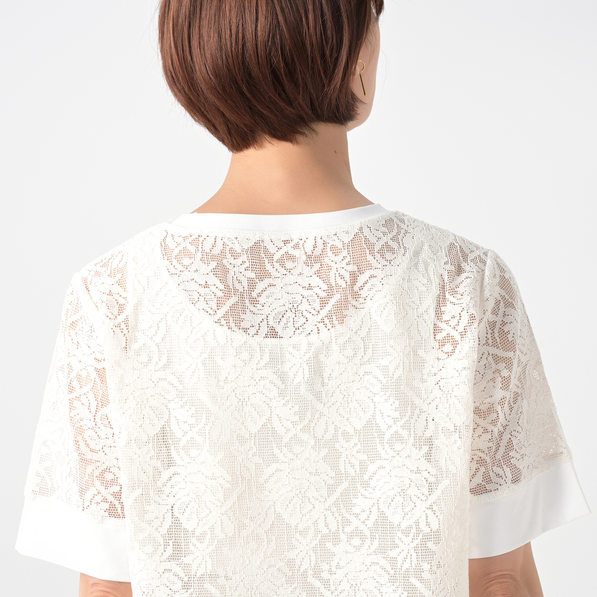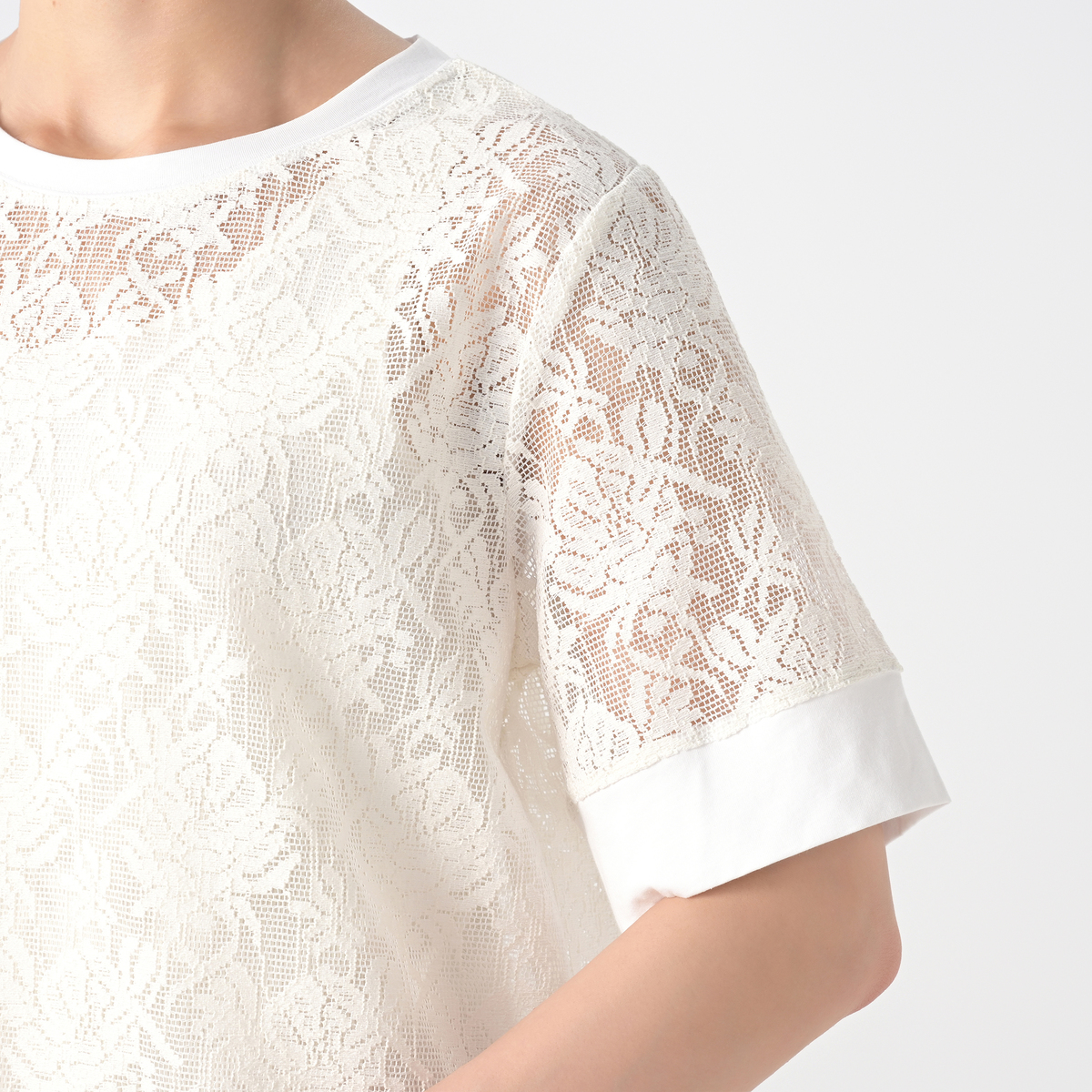 レース部分に凹凸のあるメッシュレース素材を使用。シアーな質感が涼しげな印象を与えます。首周りと袖口には天竺カットソーを使用しました