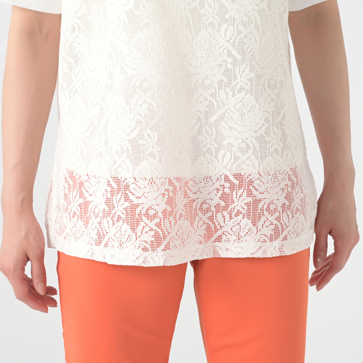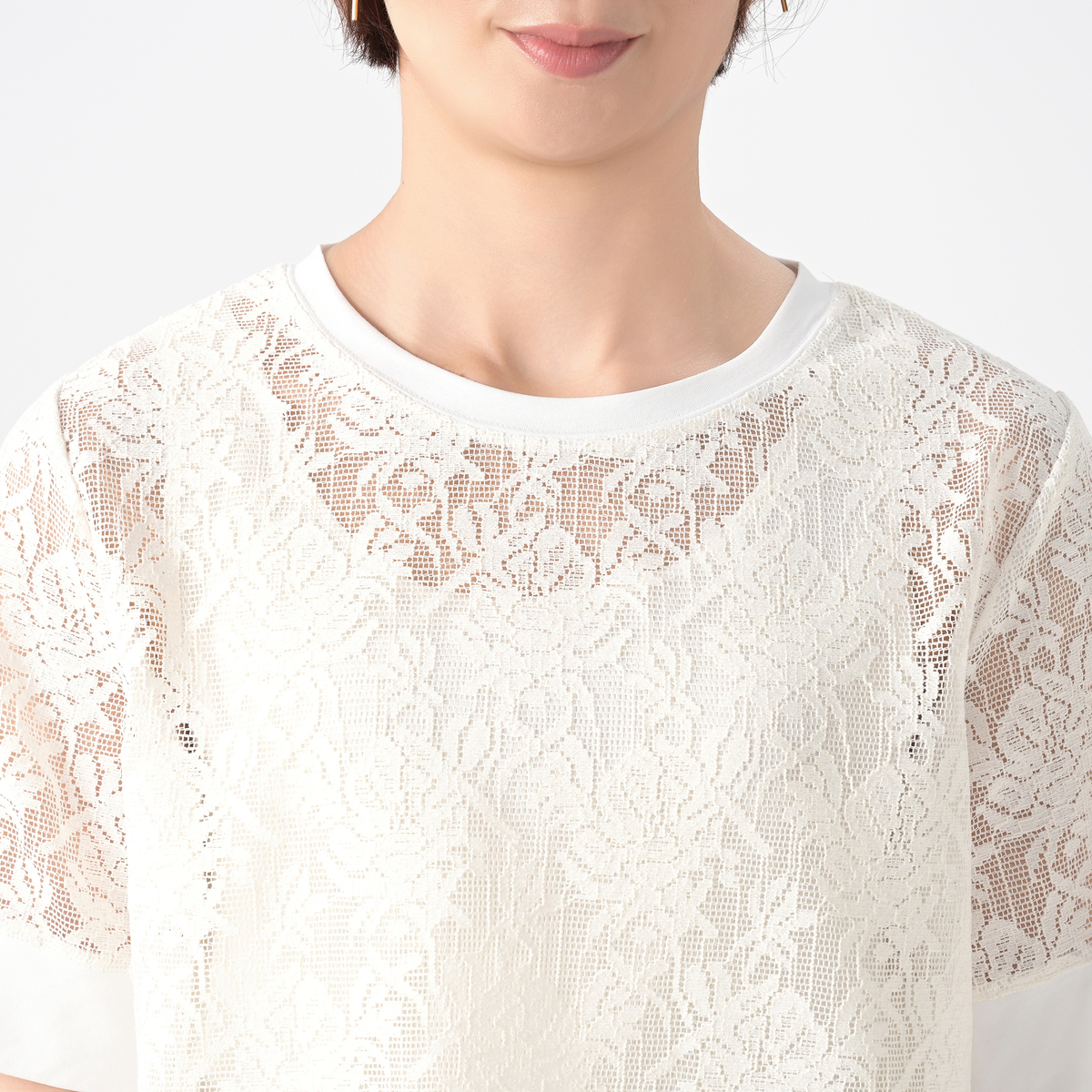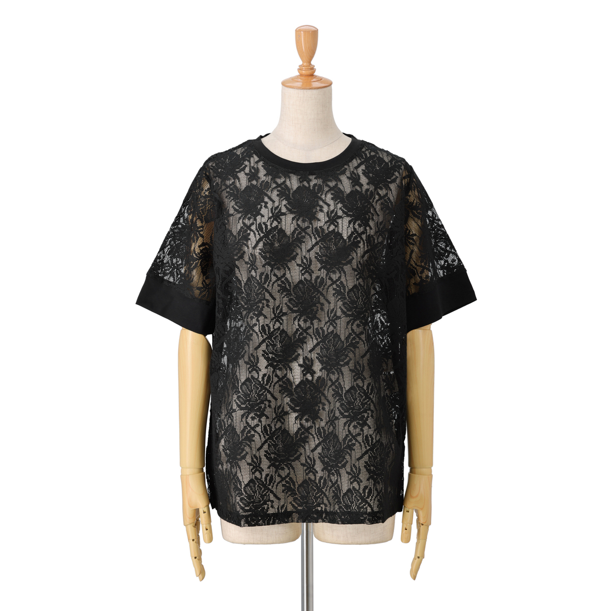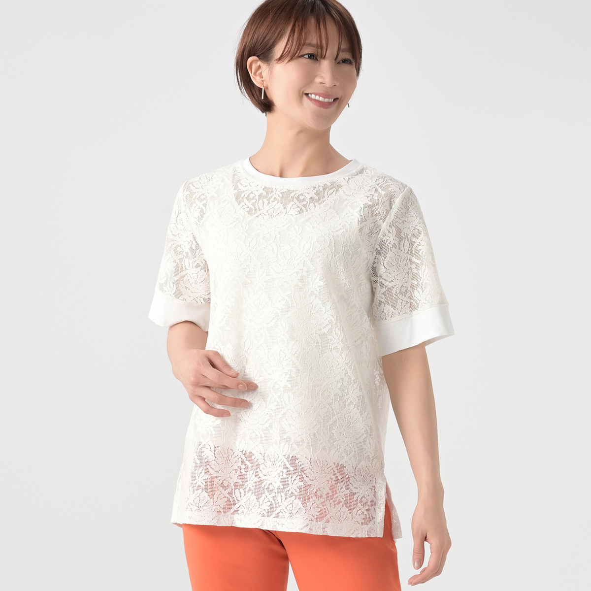 レース部分に凹凸のあるメッシュレース素材を使用。シアーな質感が涼しげな印象を与えます。首周りと袖口には天竺カットソーを使用しました