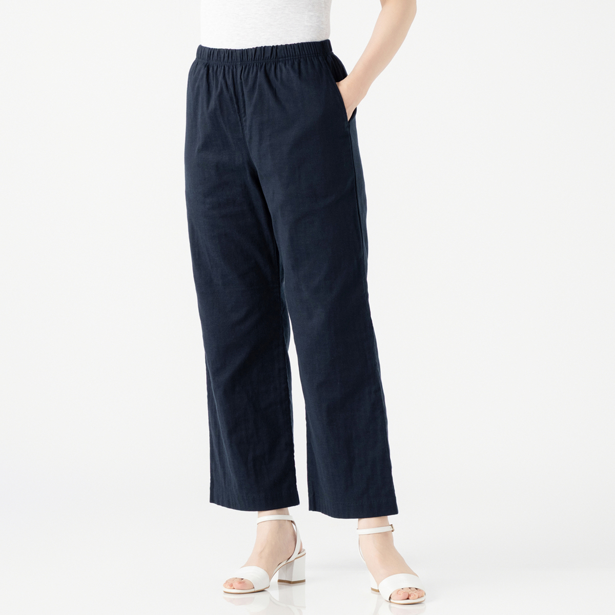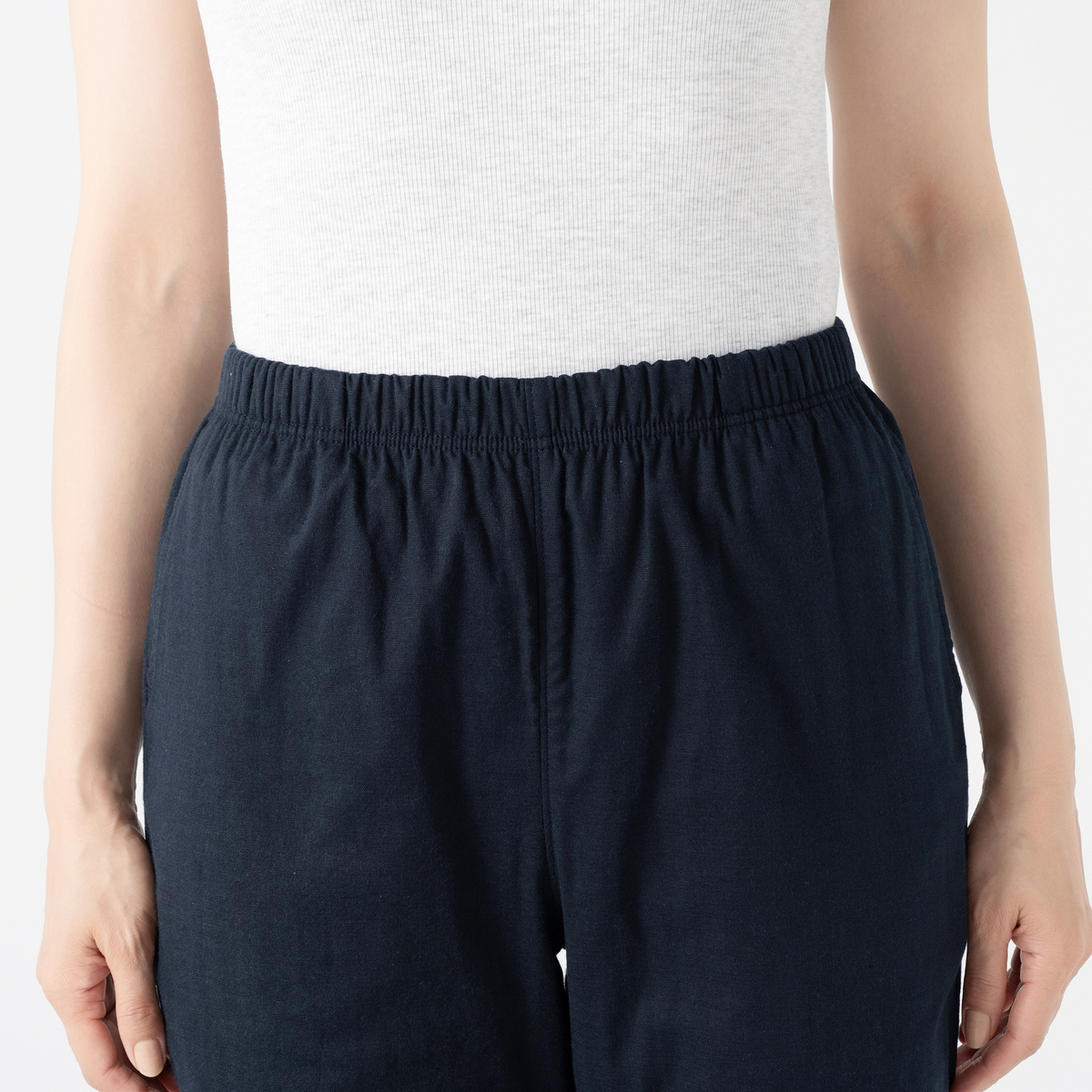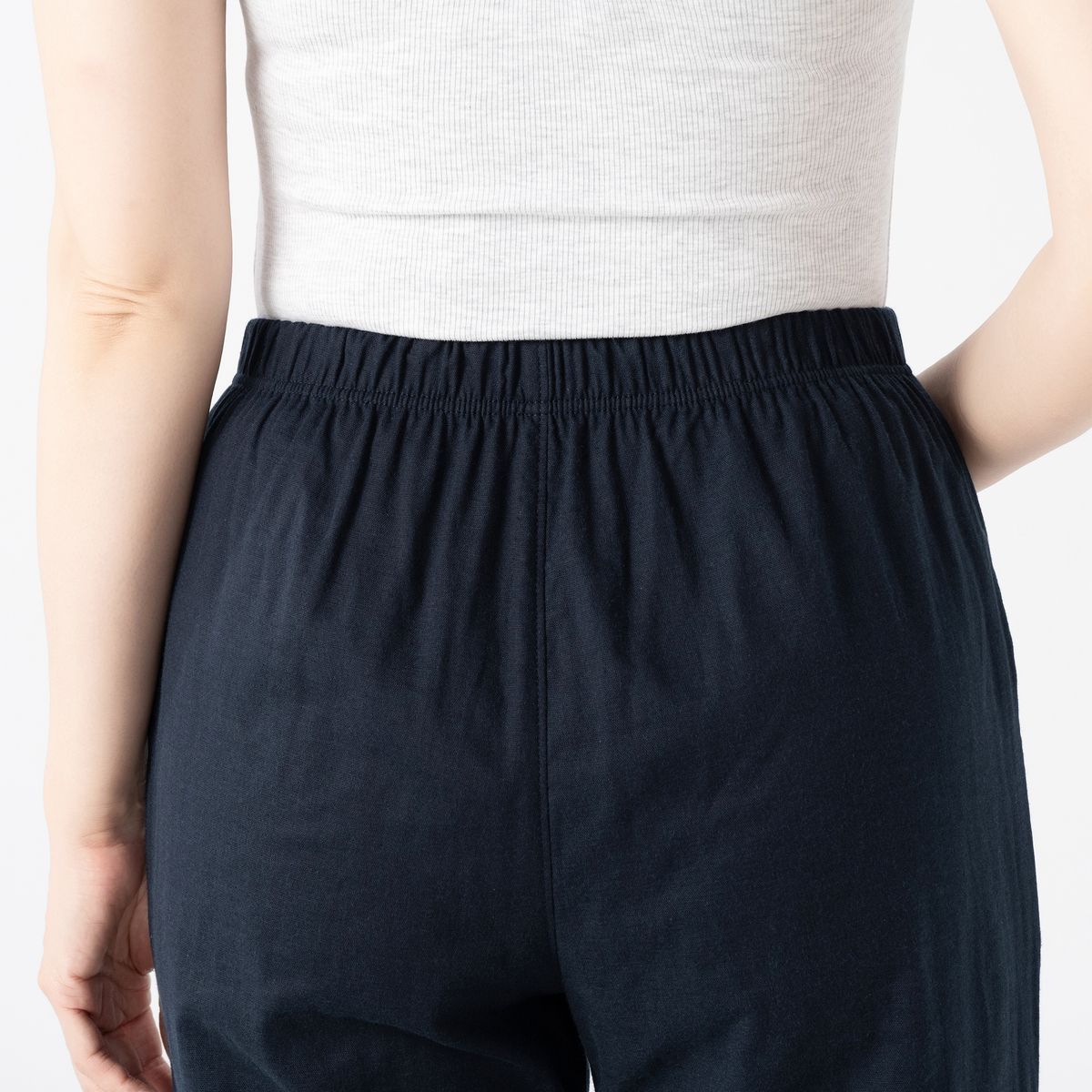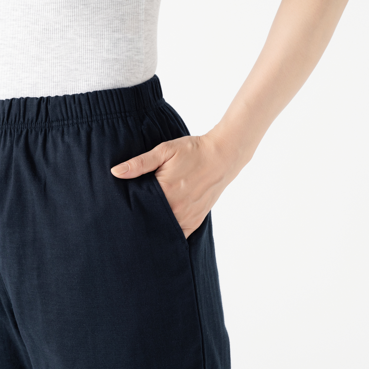 日本の生地を使い、日本で縫製したセミワイドパンツです。天然素材の綿とポリウレタンを使用し、ダブルガーゼ特有のシワ感とやわらかなタッチが魅力。空気の層ができる二重ガーゼで、夏は涼しく、少し肌寒い時はほんのりあたたかな穿き心地です